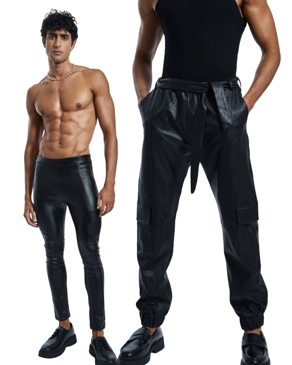 De um lado, a legging em neoprene efeito couro — nossa best-seller absoluta. Justa na medida, confortável e com acabamento impecável, ela valoriza o corpo e cria uma silhueta poderosa, perfeita para noites intensas ou composições fashion no dia a dia.