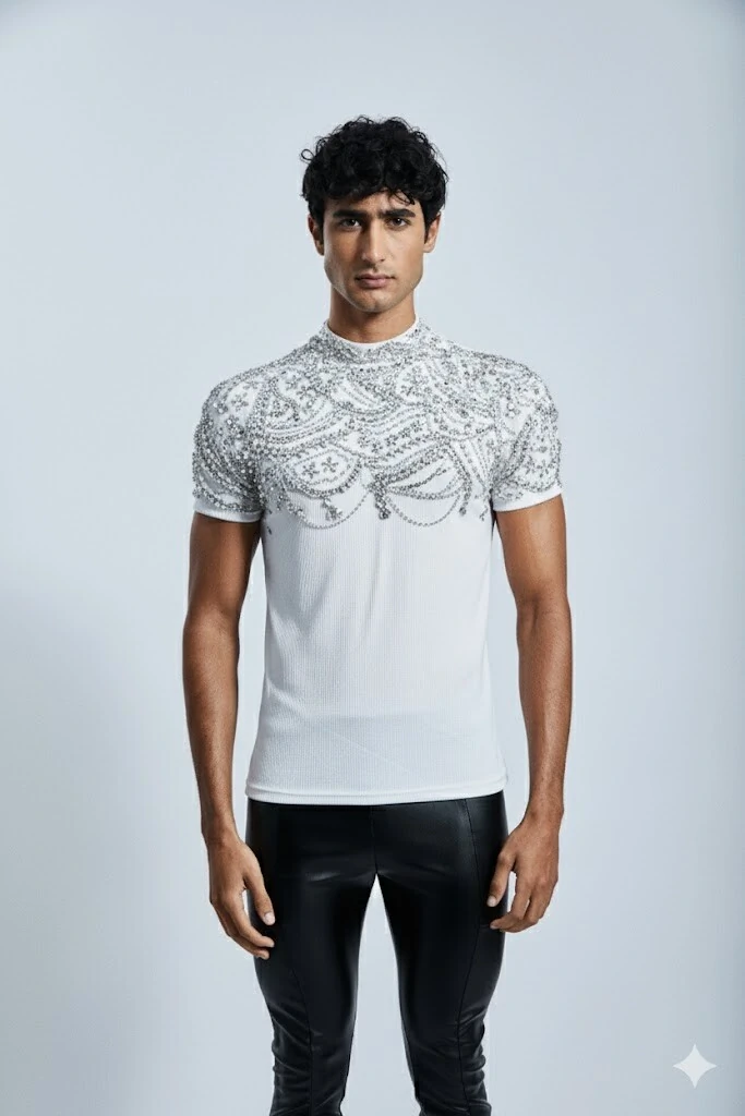 O grande destaque da peça está no bordado meticulosamente aplicado à mão, formando um desenho intrincado que evoca a grandiosidade da arte e da arquitetura clássica. As pedrarias cuidadosamente posicionadas criam um efeito de brilho sutil e imponente, elevando a camiseta a um verdadeiro símbolo de luxo.