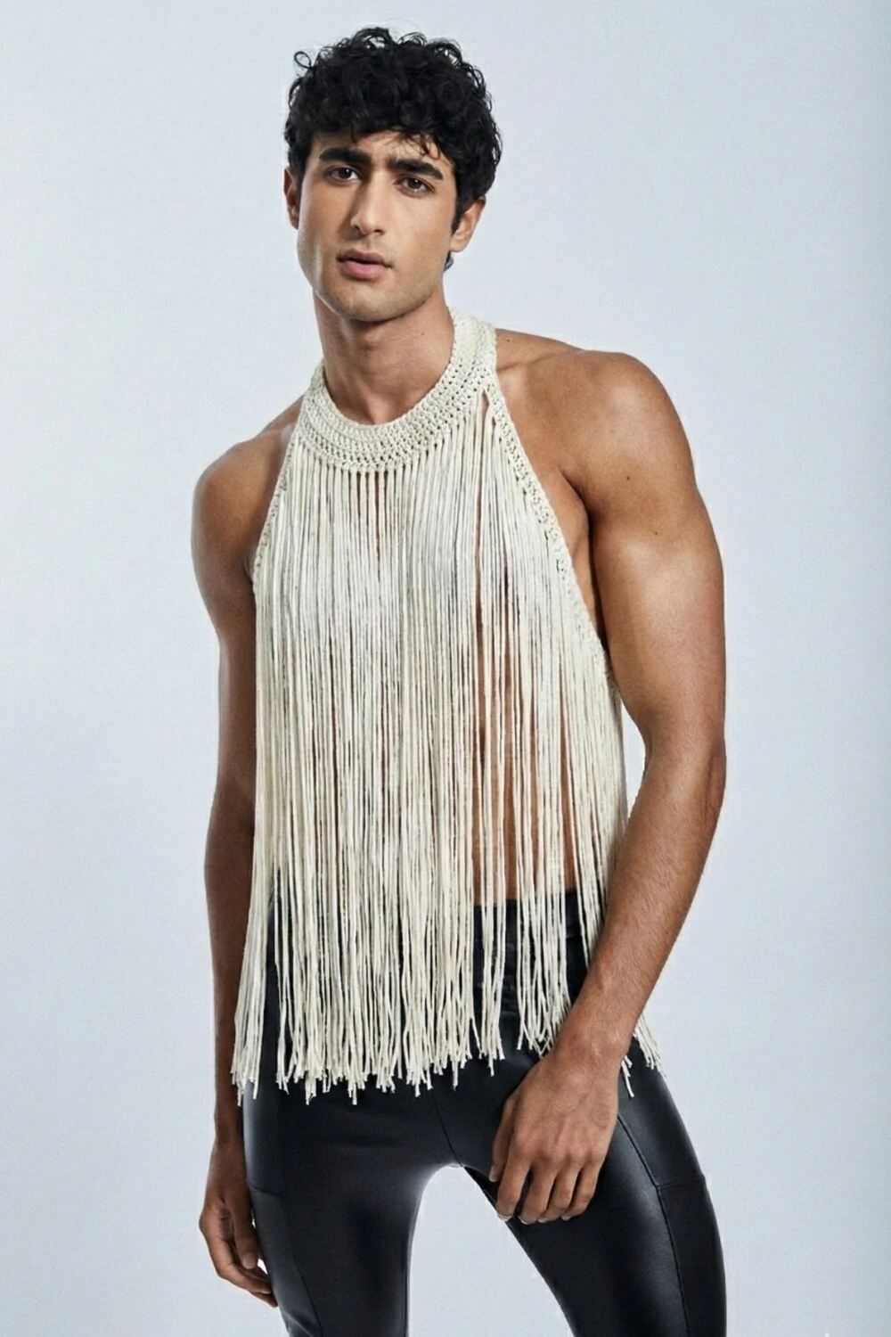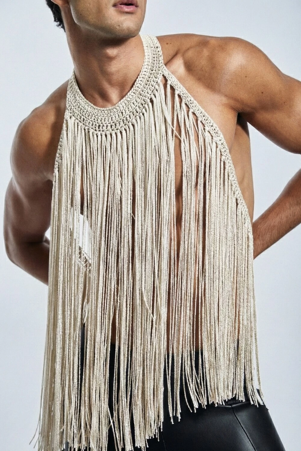 As franjas longas e fluídas criam um efeito dinâmico, captando o movimento do corpo e proporcionando uma estética hipnotizante a cada passo. Ideal para eventos exclusivos, performances e momentos onde a ousadia se alinha à sofisticação, é uma peça statement para homens que dominam a arte da presença.