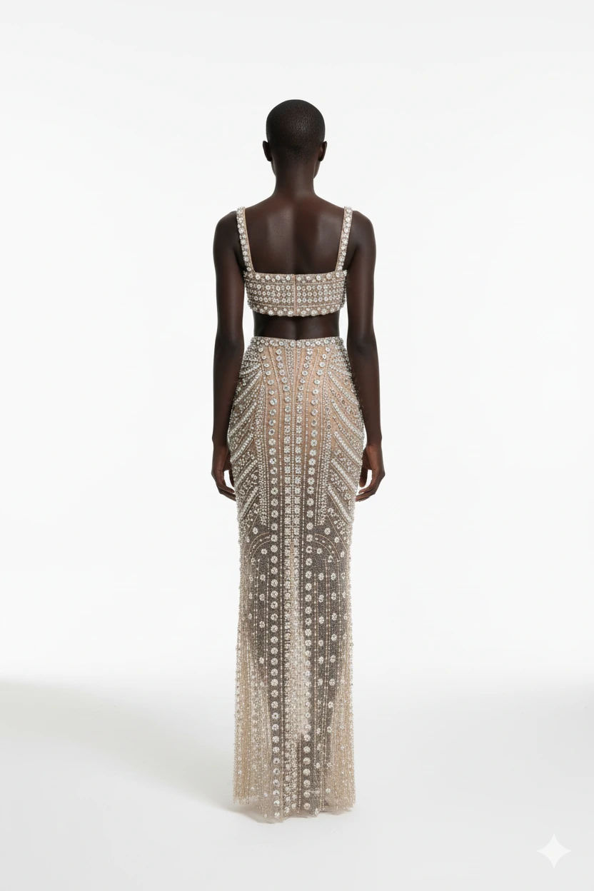 O top, estruturado e completamente revestido por aplicações cintilantes, cria um contraste perfeito entre pele, luz e detalhes precisos. A saia longa, rica em bordados contínuos e simétricos, alonga a silhueta com elegância, transformando cada movimento em um espetáculo de brilho.