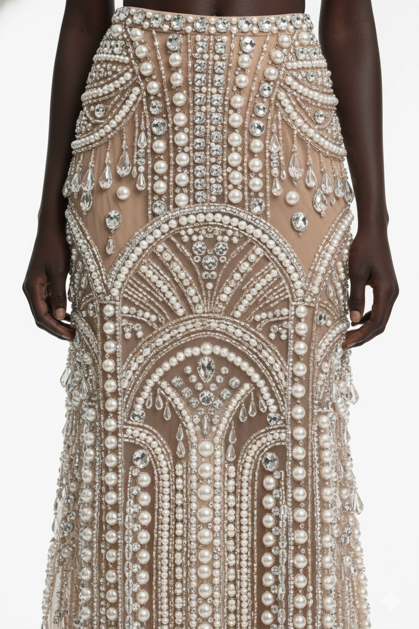 Totalmente bordado à mão, ele combina brilho intenso, textura tridimensional e um desenho arquitetônico que valoriza cada curva do corpo feminino.