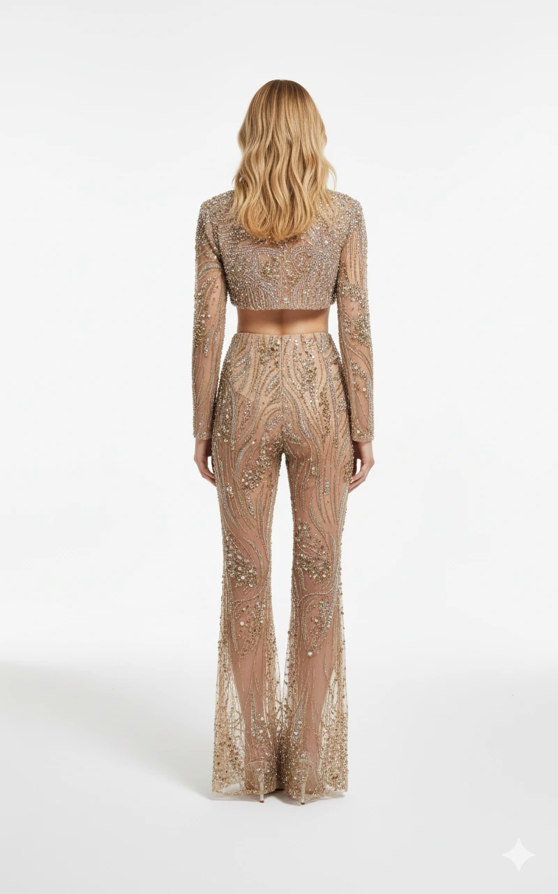 O Conjunto Elysia Crystals é um espetáculo de brilho e movimento, construído inteiramente à mão com aplicações que formam um desenho orgânico, fluido e hipnotizante.. A calça flare, igualmente bordada do cós à barra, alonga a silhueta e transforma cada passo em um feixe de luz.