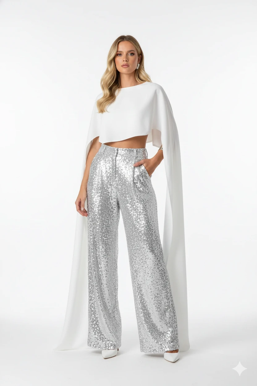 A calça pantalona totalmente bordada em paetês prateados reflete a luz de maneira sofisticada, criando um efeito espelhado que alonga a silhueta e transforma o look em uma presença luminosa.