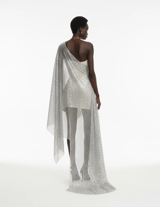 A modelagem assimétrica — um ombro só, com cauda lateral longa e fluida — traz drama na medida certa, equilibrando transparência e elegância. O caimento leve da tela de cristais forma uma silhueta moderna e escultural, perfeita para quem deseja impactar sem esforço.