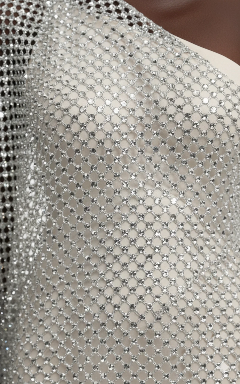 Confeccionado em tela de strass de brilho intenso, ele cria um efeito líquido, metálico e luminoso que acompanha cada movimento do corpo como se fosse luz materializada.
