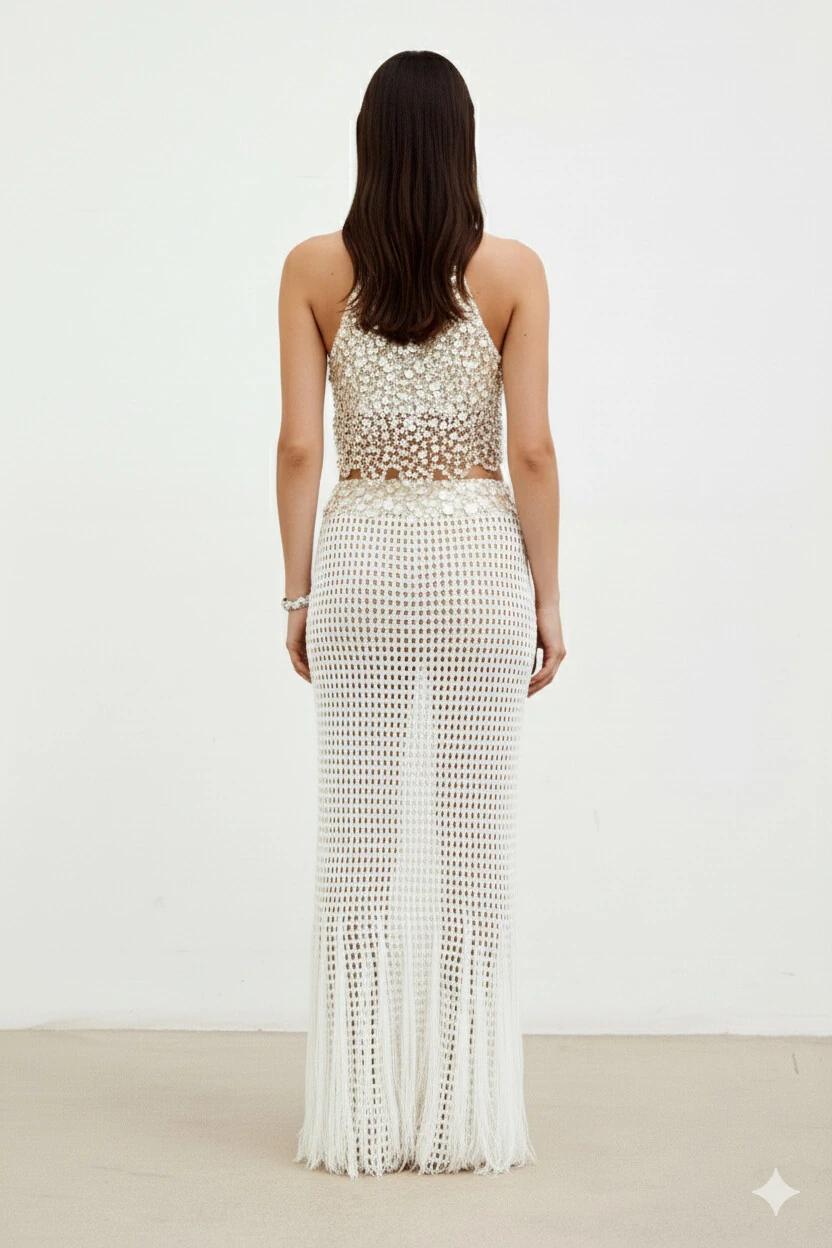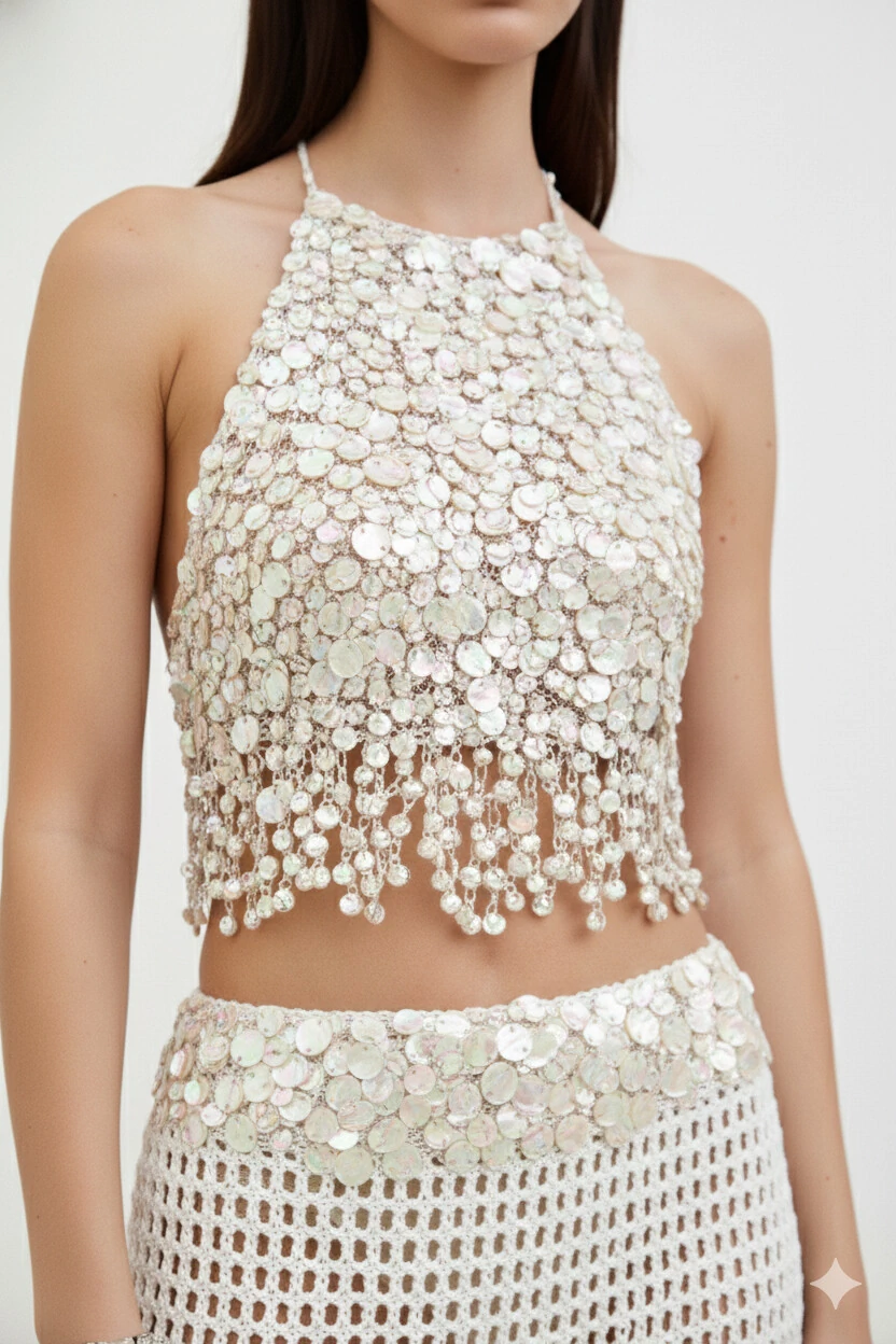 O Conjunto Thalassa é uma ode ao brilho orgânico e à delicadeza das formas naturais. O top é inteiramente bordado à mão com madrepérolas selecionadas, criando um mosaico luminoso que reflete a luz com suavidade e sofisticação.