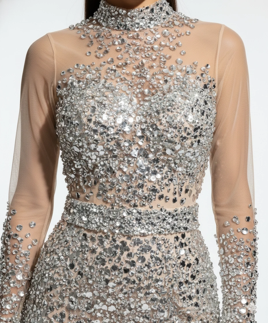 A gola alta e as mangas longas trazem elegância contemporânea, enquanto o short estruturado equilibra o look com sensualidade moderna. Cada cristal é aplicado manualmente, garantindo profundidade, textura e um brilho que acompanha os movimentos do corpo de forma hipnotizante.
