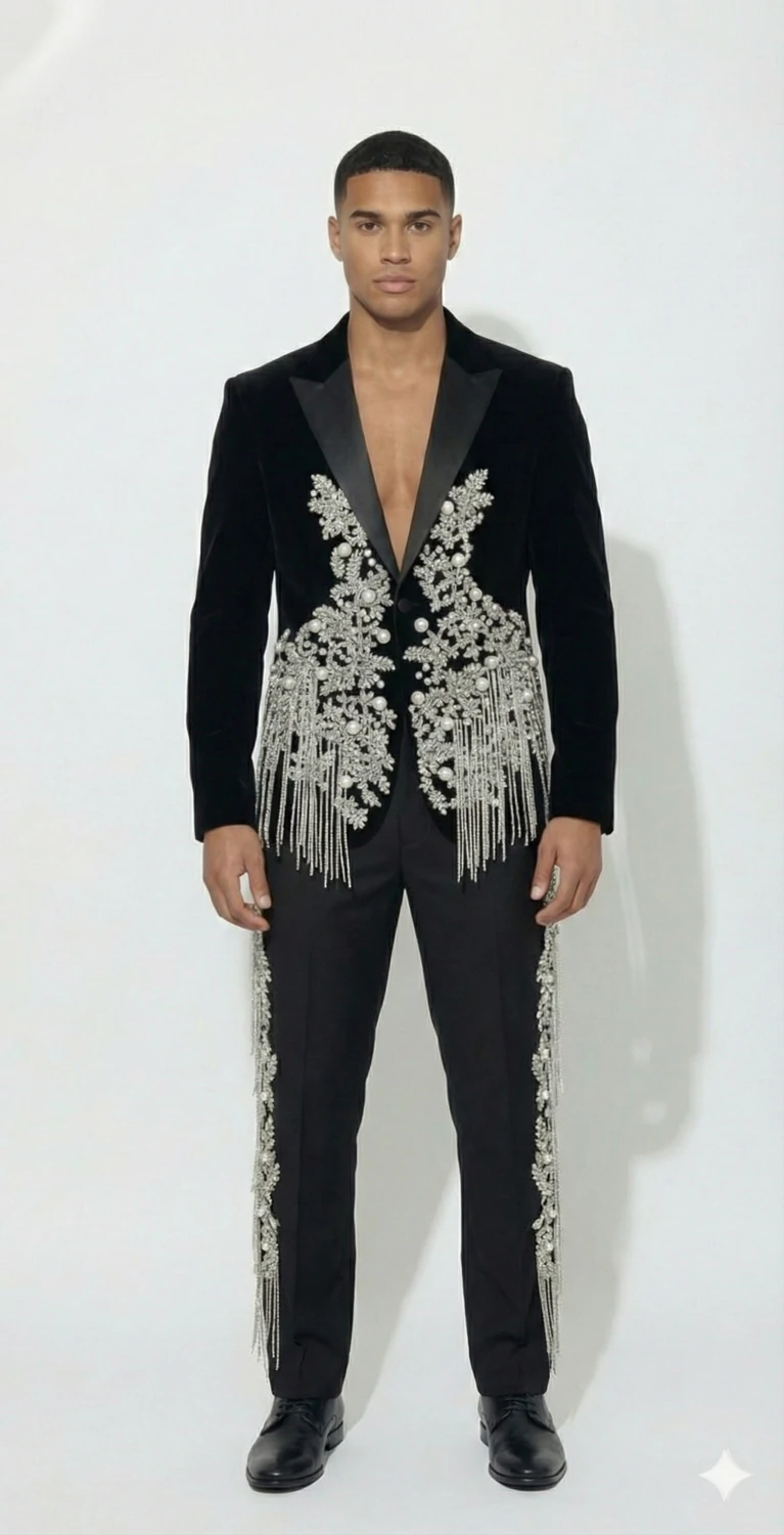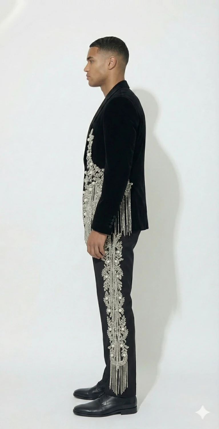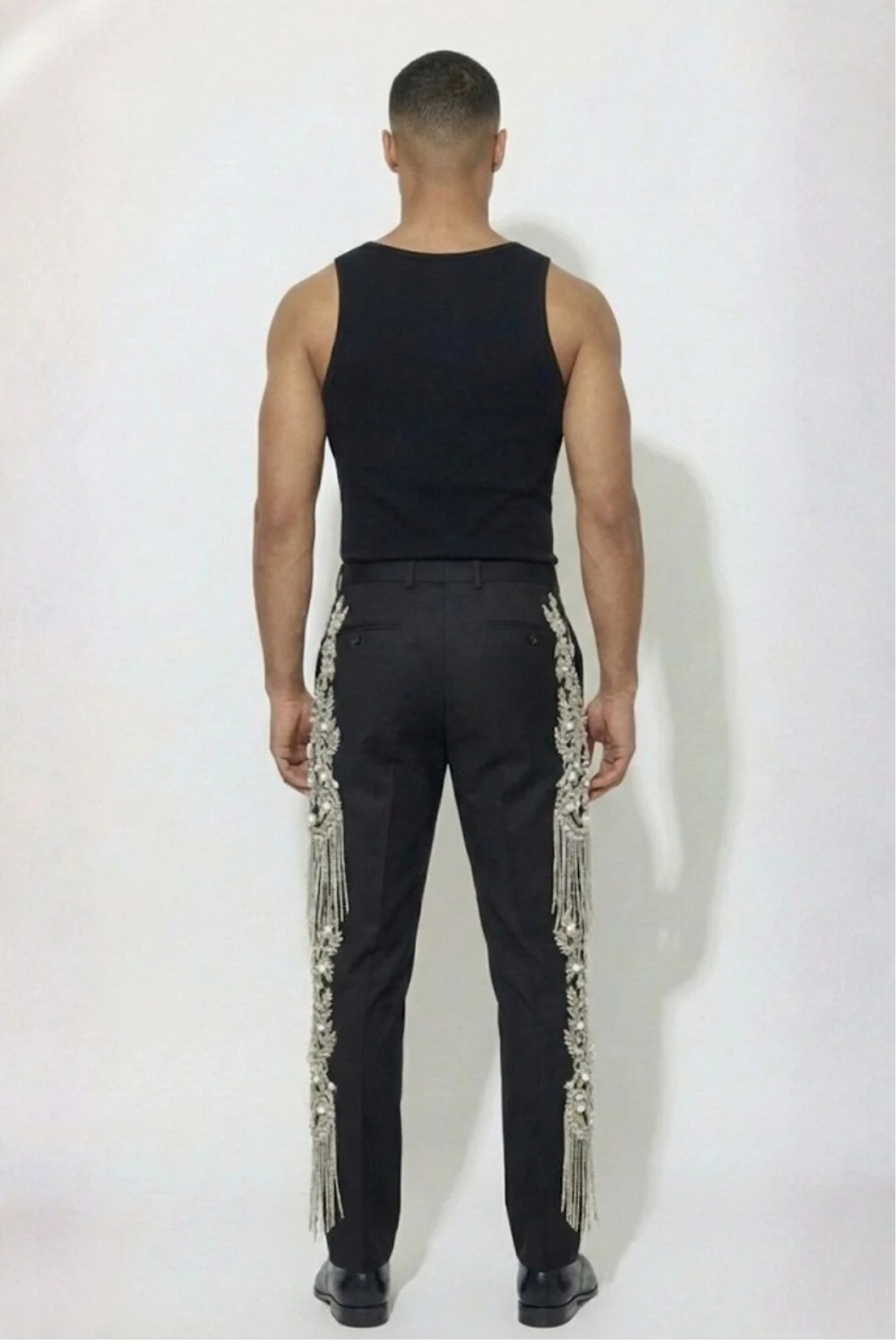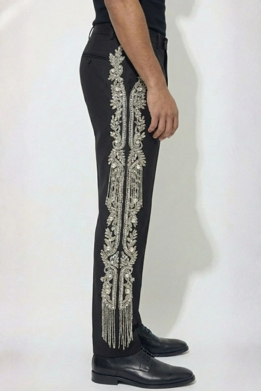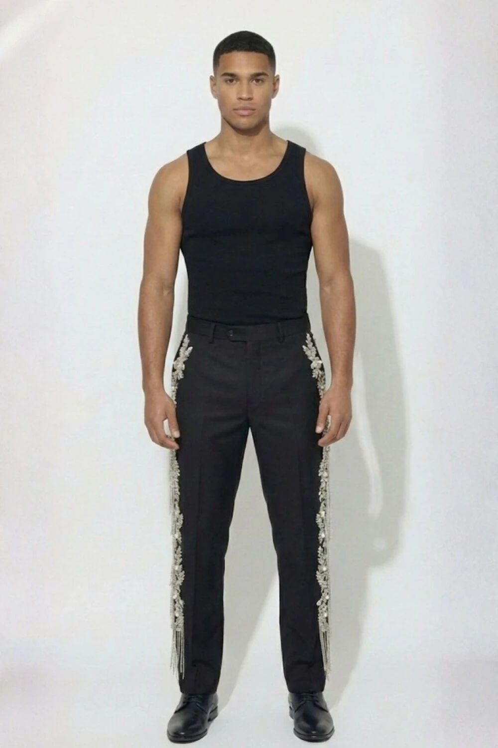Calça de alfaiataria preta, modelagem reta e caimento impecável. Possui bordado lateral artesanal em cristais, acompanhando o comprimento da perna e criando continuidade visual com o blazer.