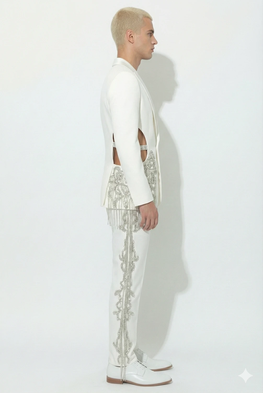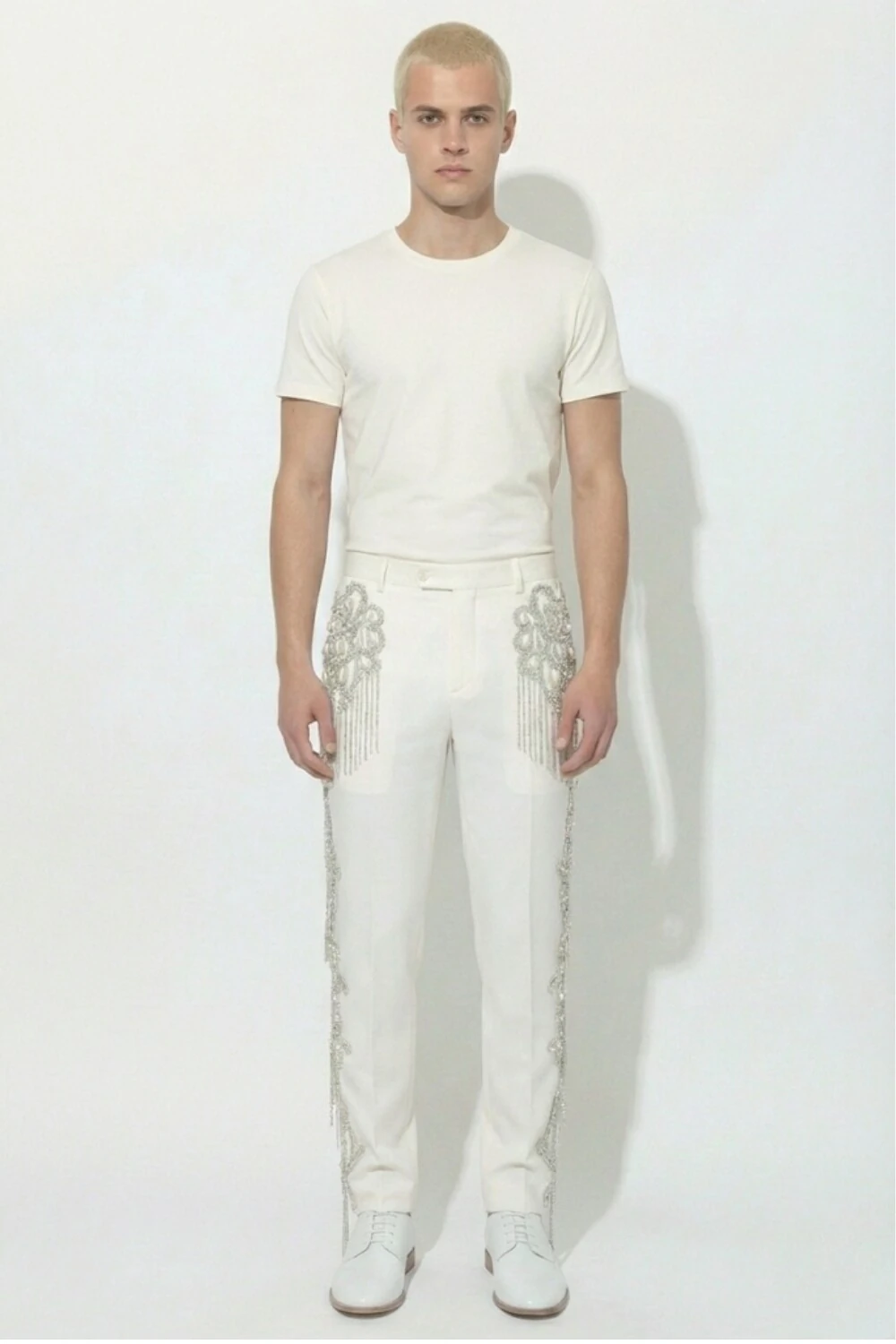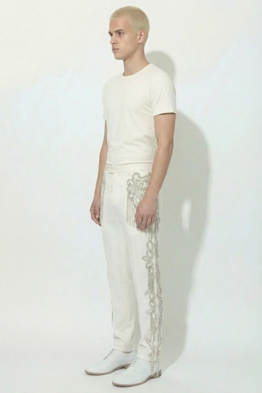 Calça de alfaiataria branca, modelagem reta e caimento impecável. Possui bordado lateral artesanal em cristais e aplicações prateadas, acompanhando o comprimento da perna e criando fluidez e luminosidade a cada passo.