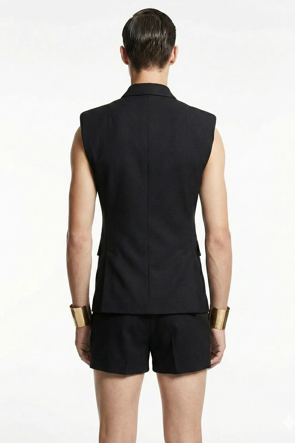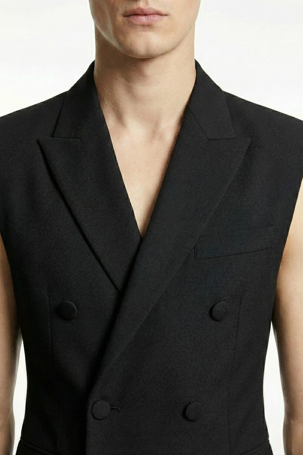Blazer confeccionado em alfaiataria preta estruturada, modelagem double-breasted, com lapela clássica e construção sem mangas, revelando os braços e reforçando o caráter moderno da peça.