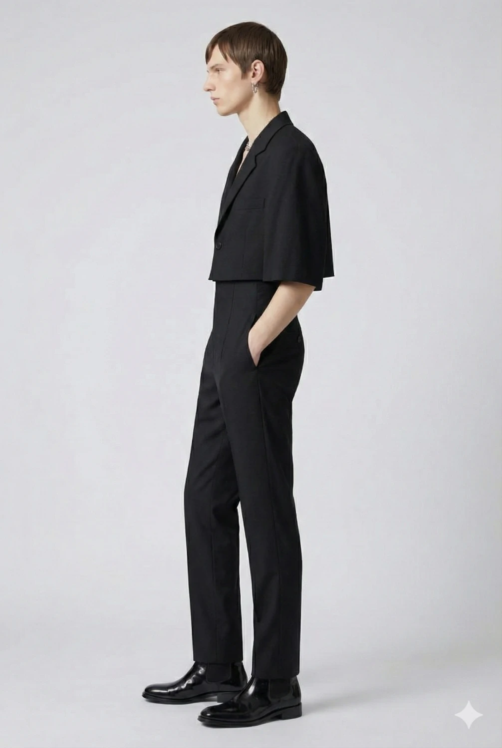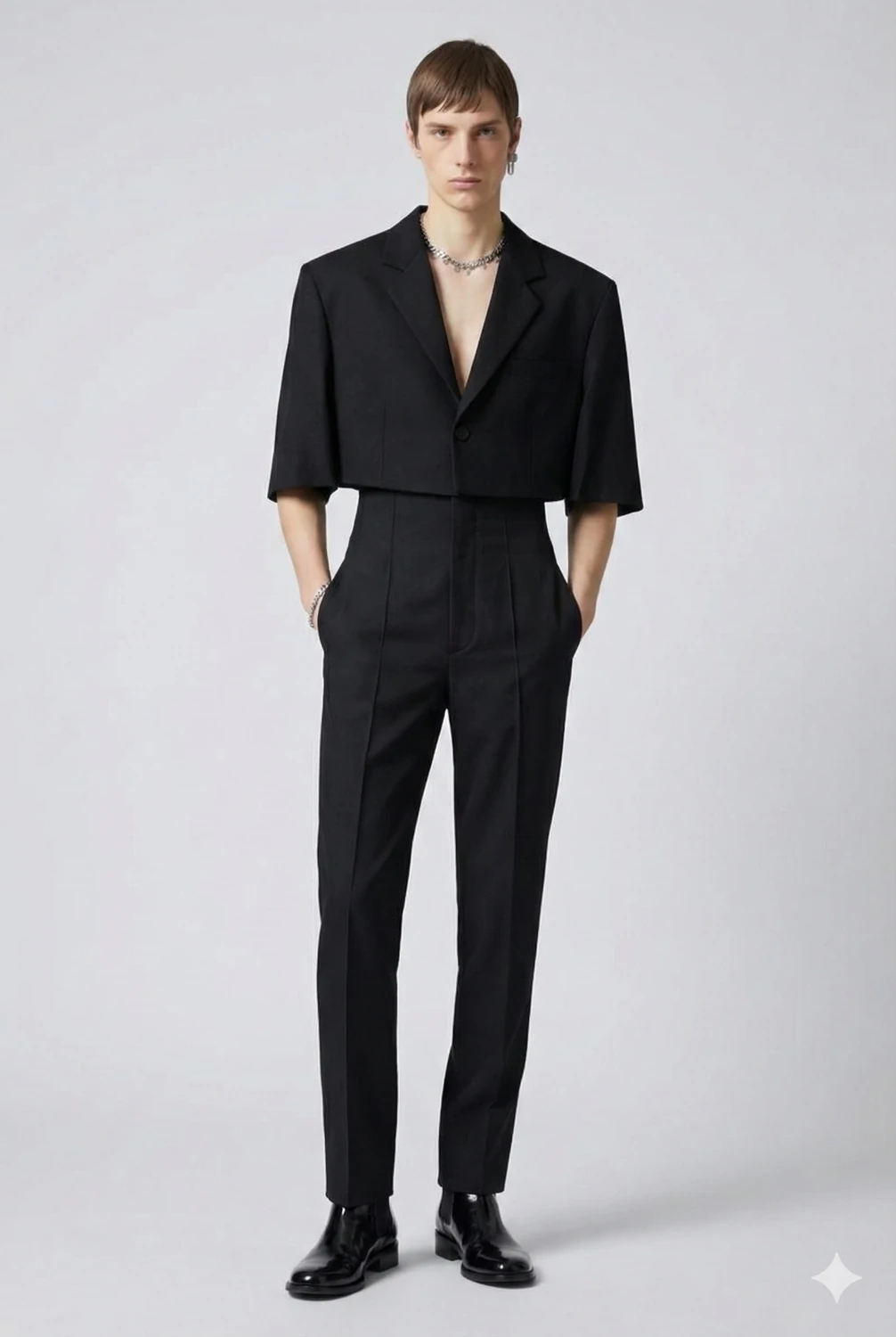 Desenvolvido no Atelier Synchron, com foco absoluto em proporção, corte e acabamento couture.