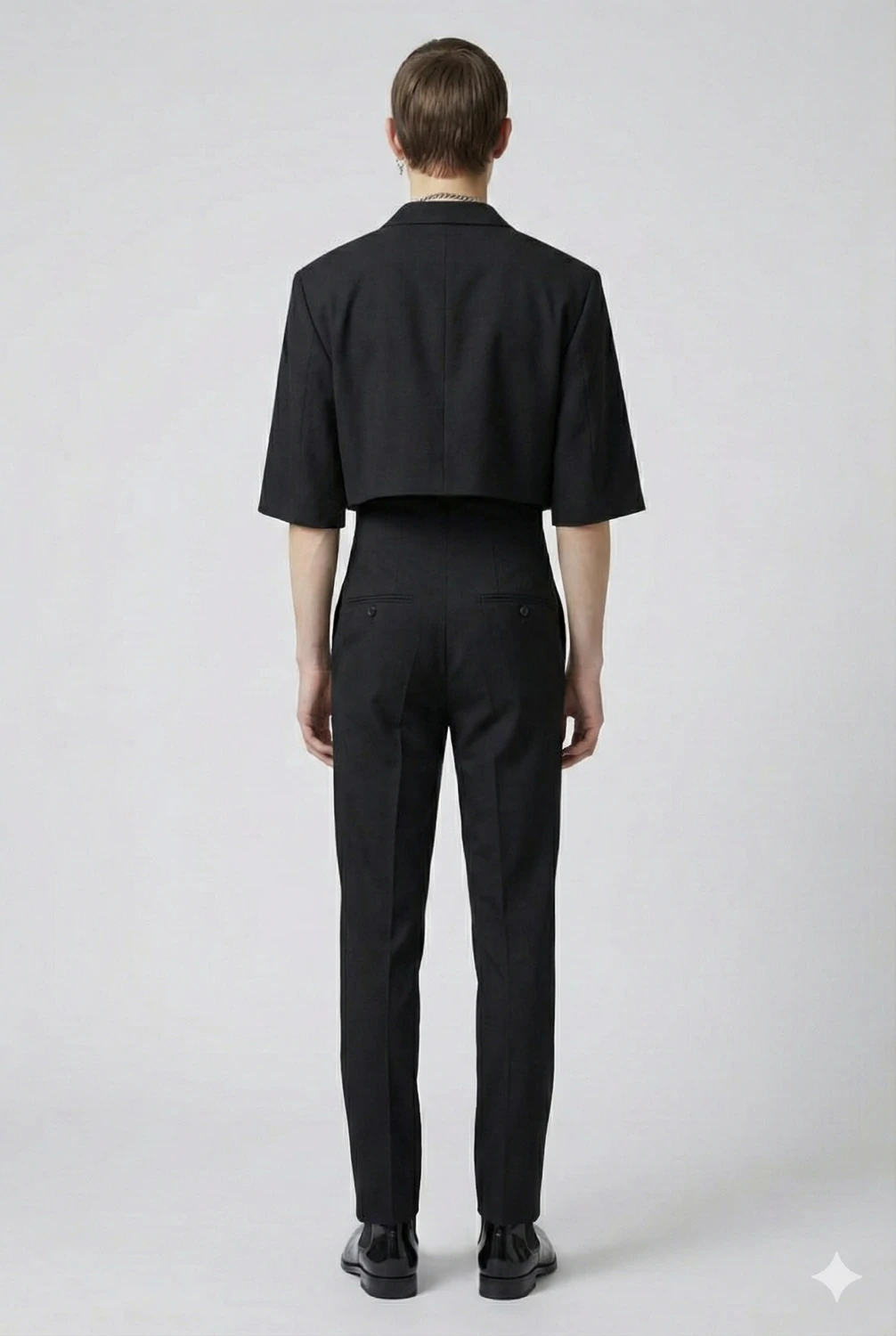 O desenho alonga a silhueta e cria equilíbrio visual com o blazer cropped, reforçando o caráter arquitetônico do conjunto.