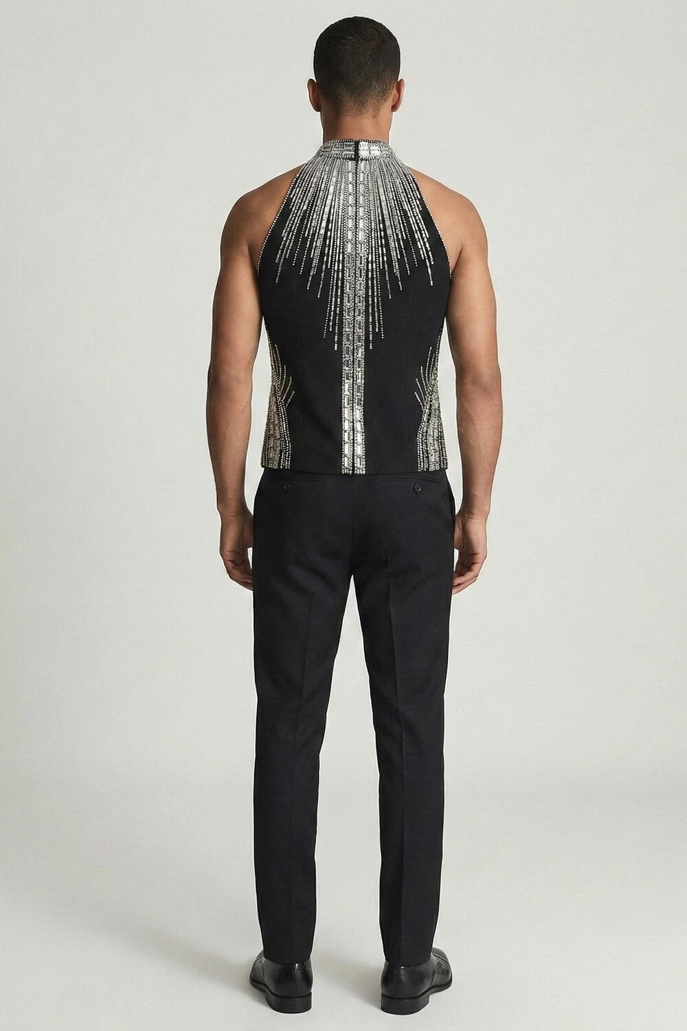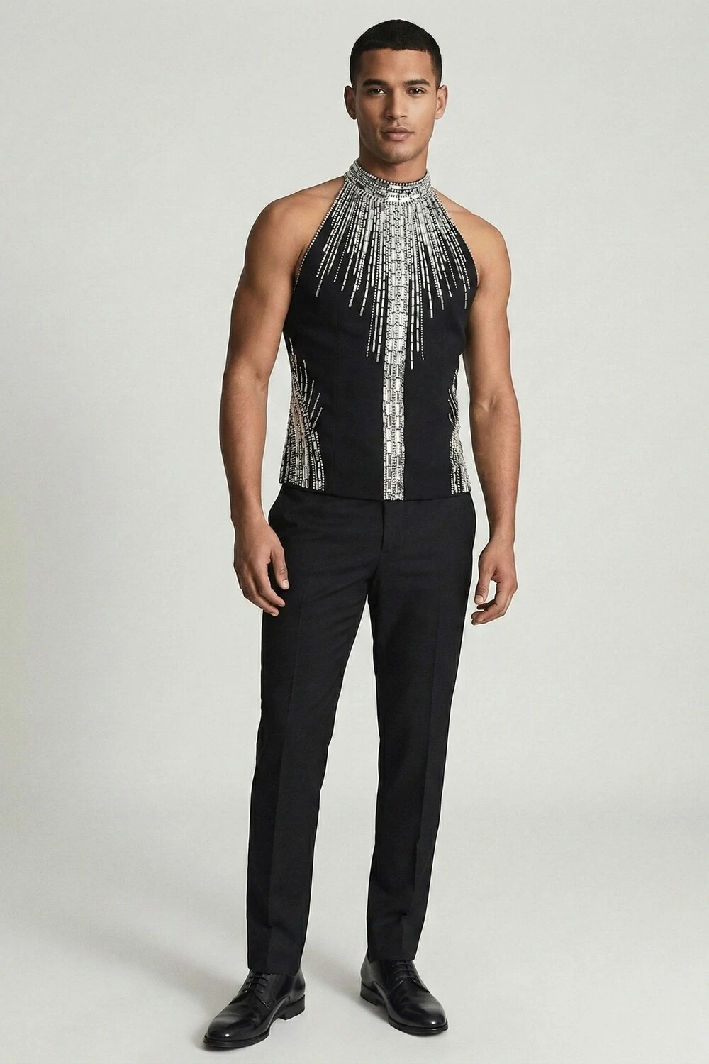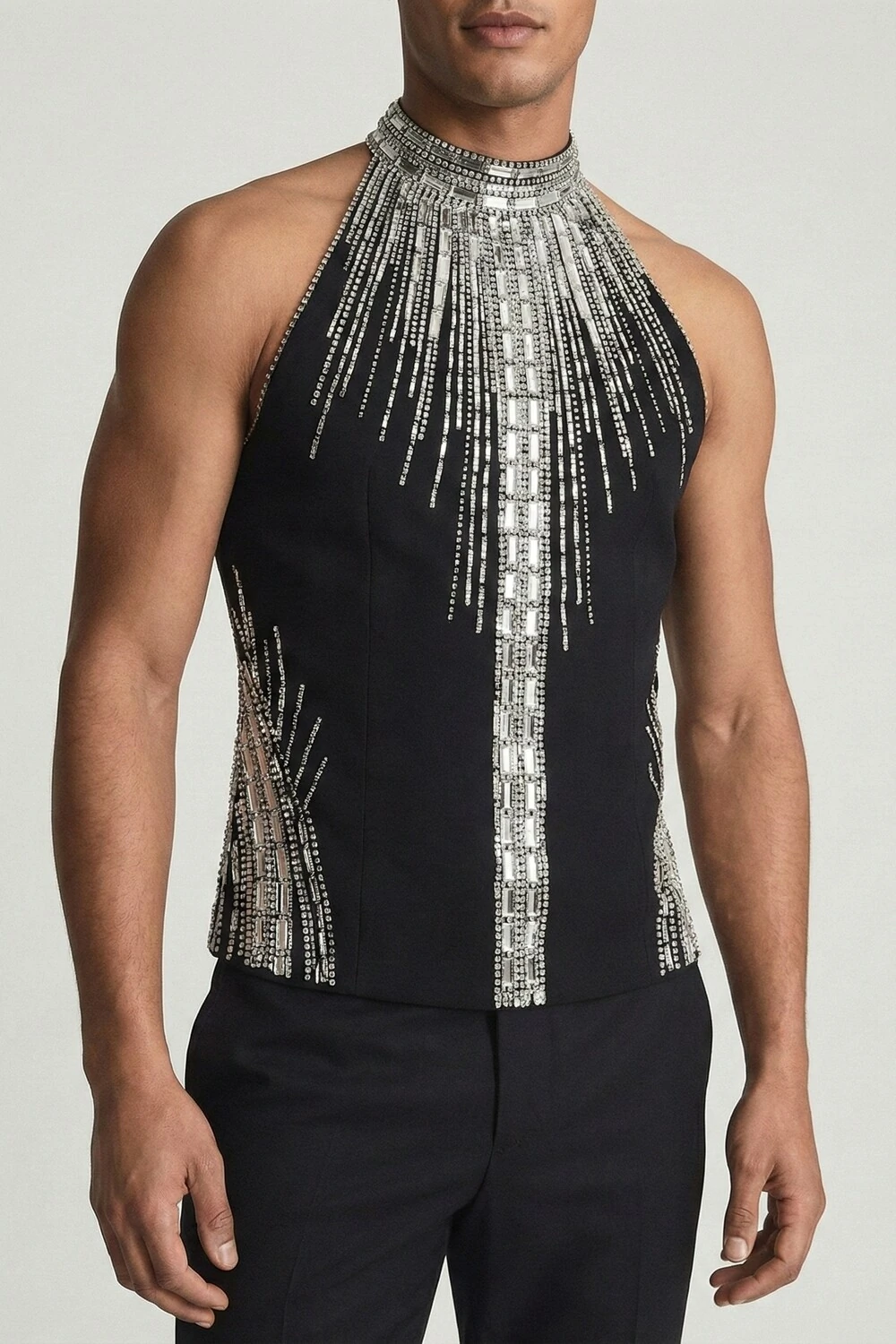 A Stéphanos transforma o corpo em altar. Uma regata de inspiração ritualística, que envolve o pescoço e deixa os ombros livres, conduzindo o olhar para o centro do corpo através do brilho.