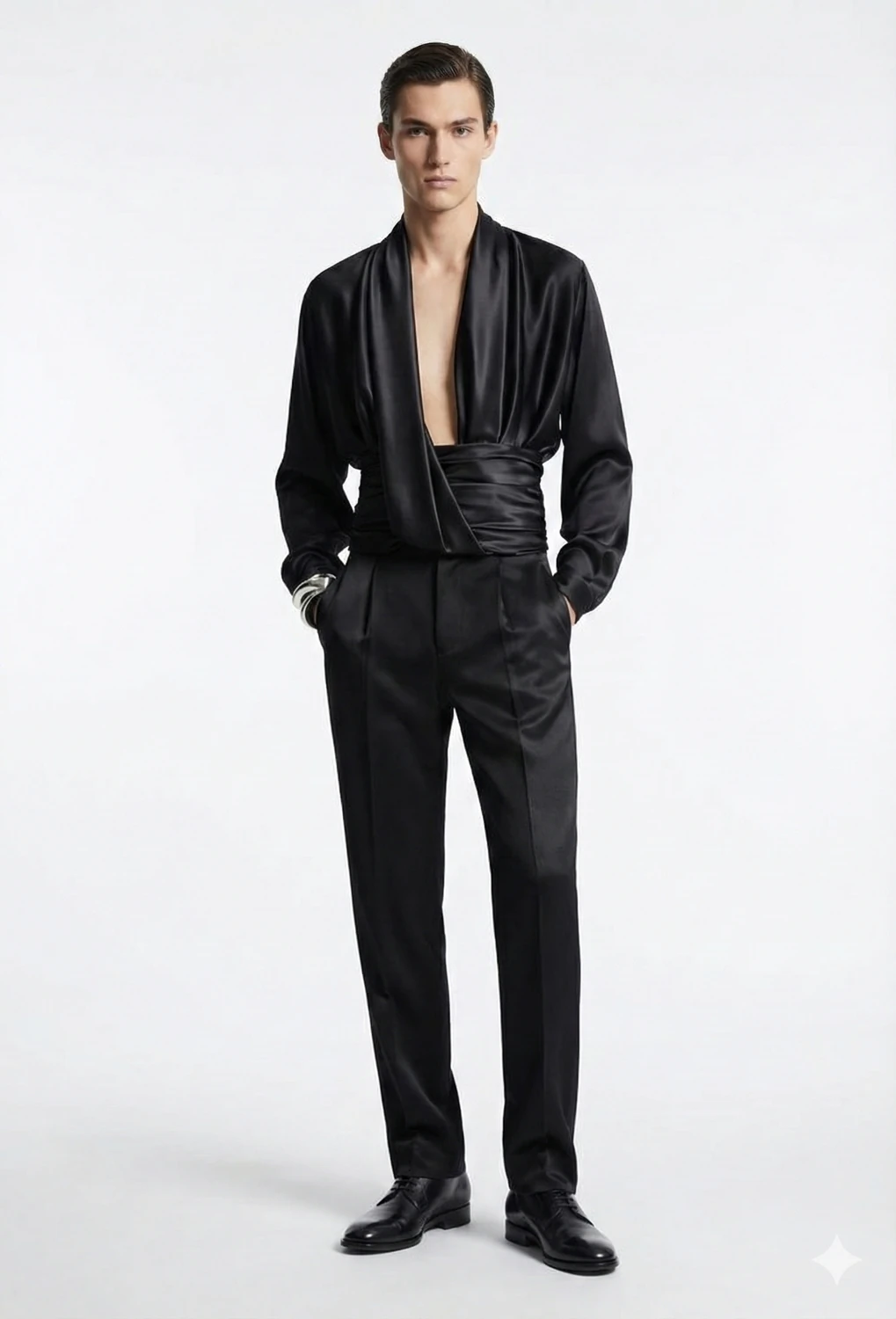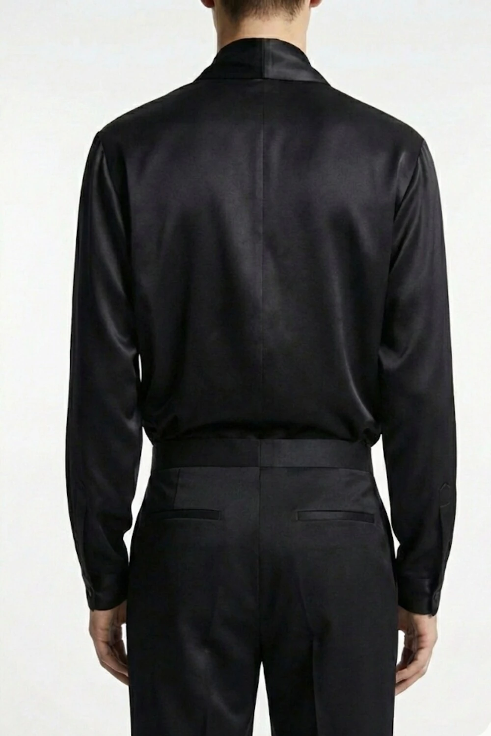 Camisa confeccionada em tecido acetinado preto de toque sedoso, com decote profundo em V e construção transpassada com drapeado frontal, que valoriza o tórax e a cintura com fluidez.