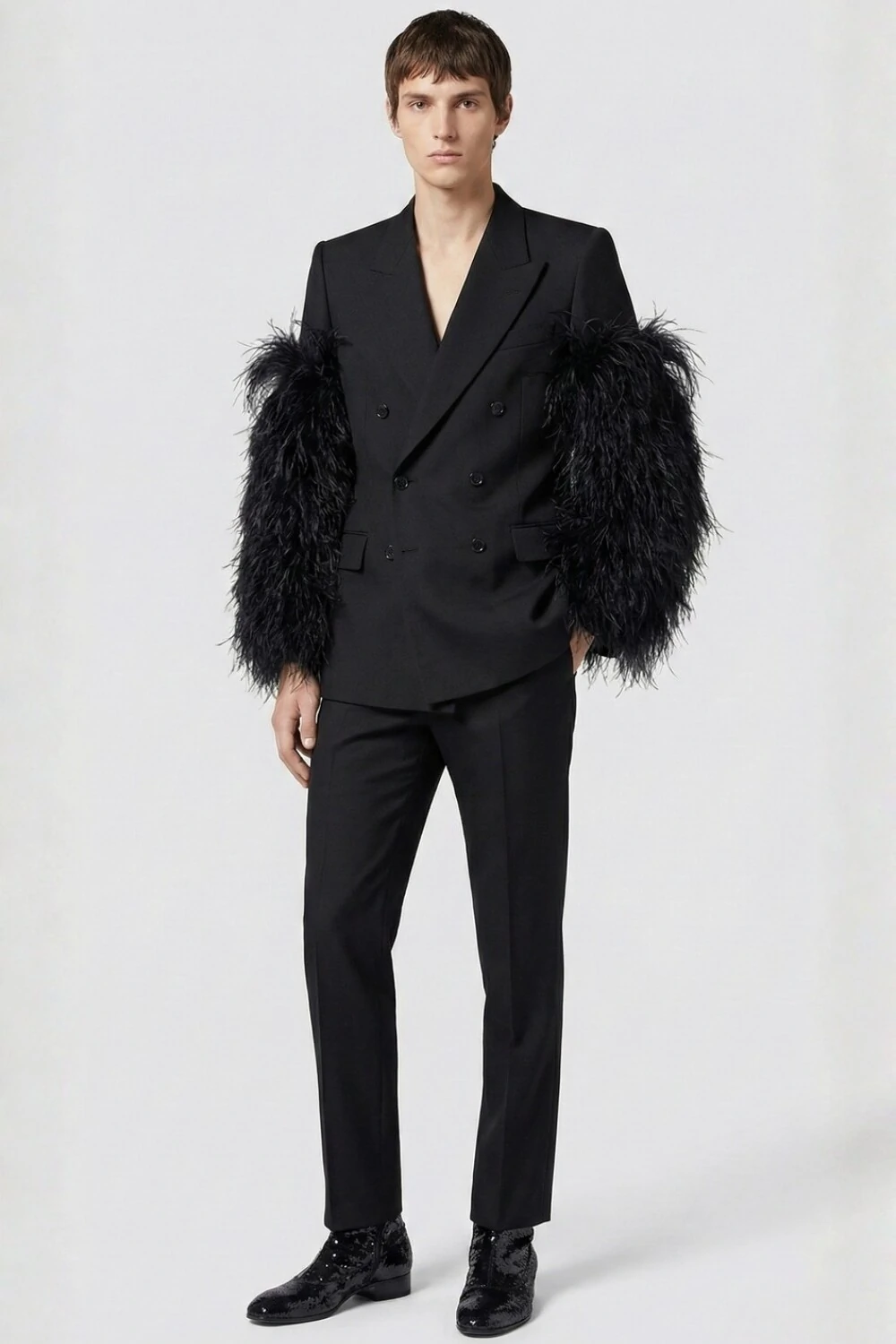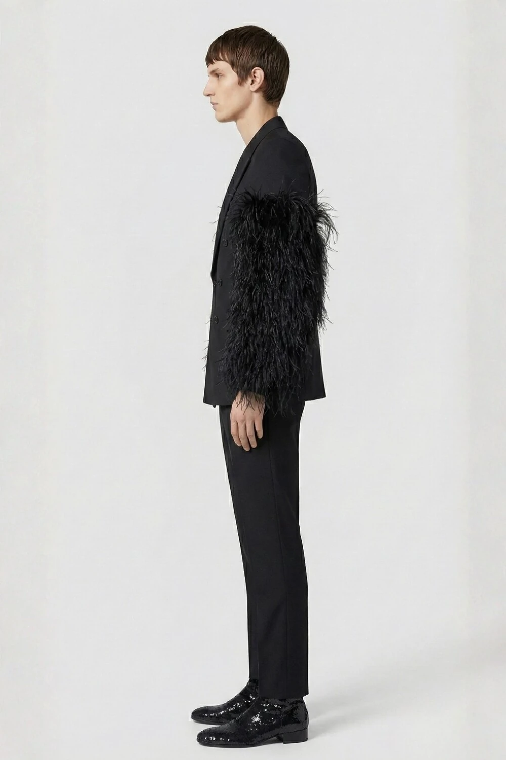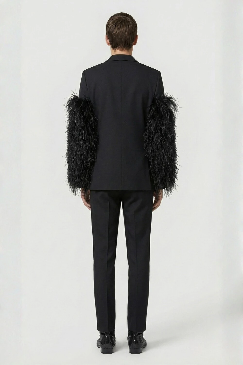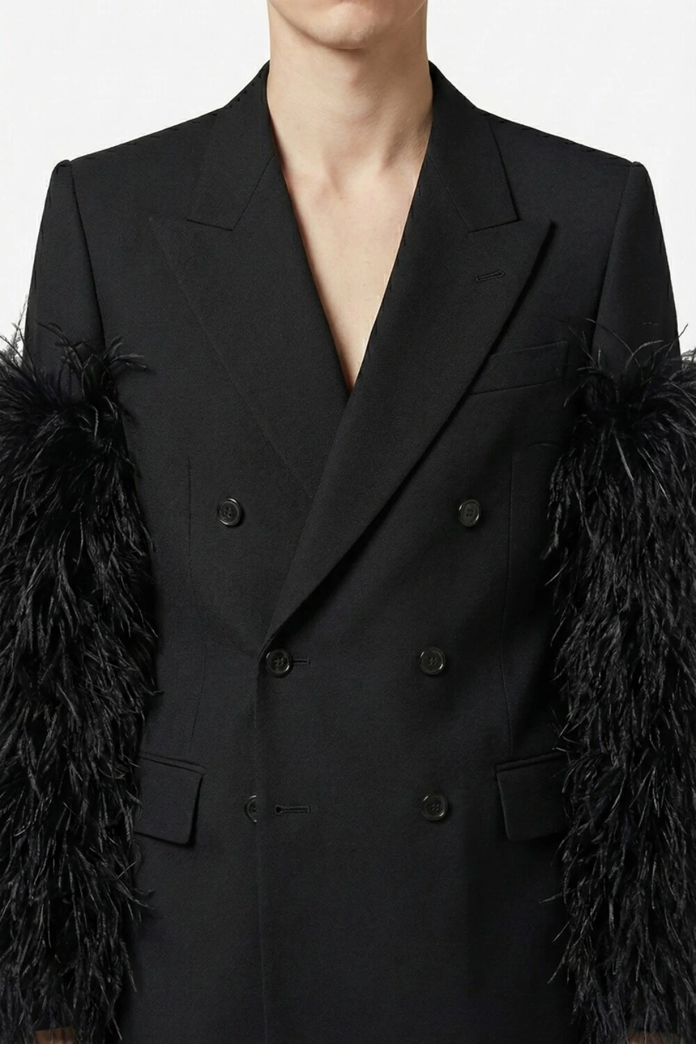 O Hécate é presença que antecede o olhar. Um blazer que une a sobriedade da alfaiataria clássica ao impacto ritual das mangas emplumadas, criando uma silhueta magnética, noturna e indiscutivelmente poderosa.