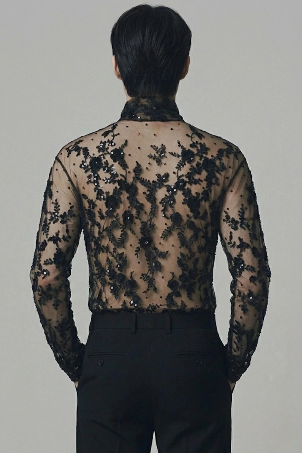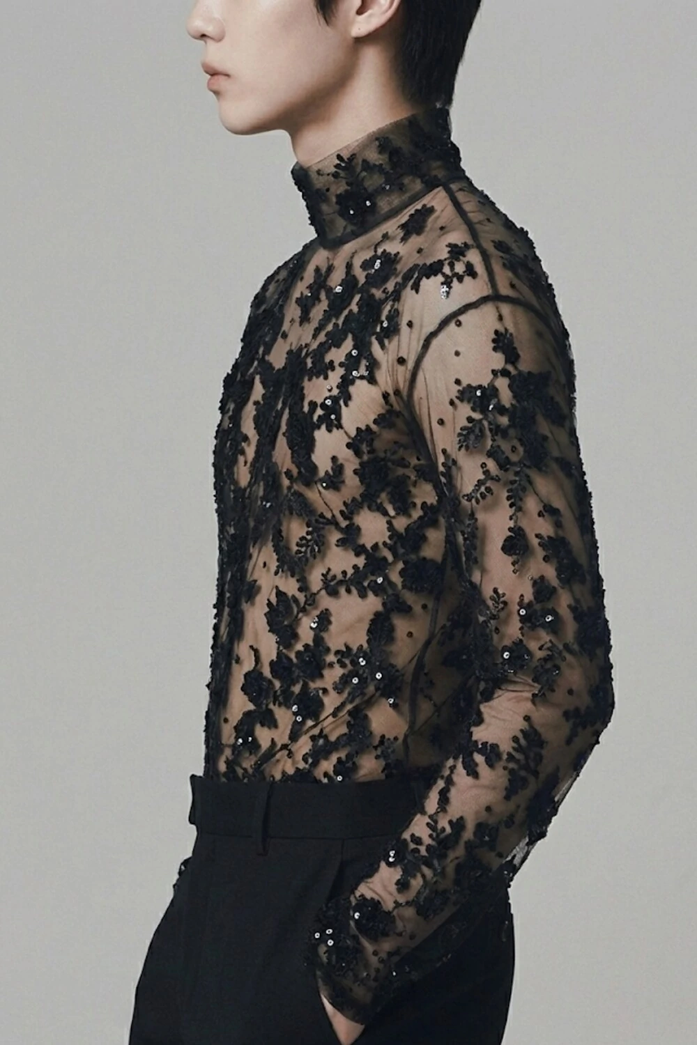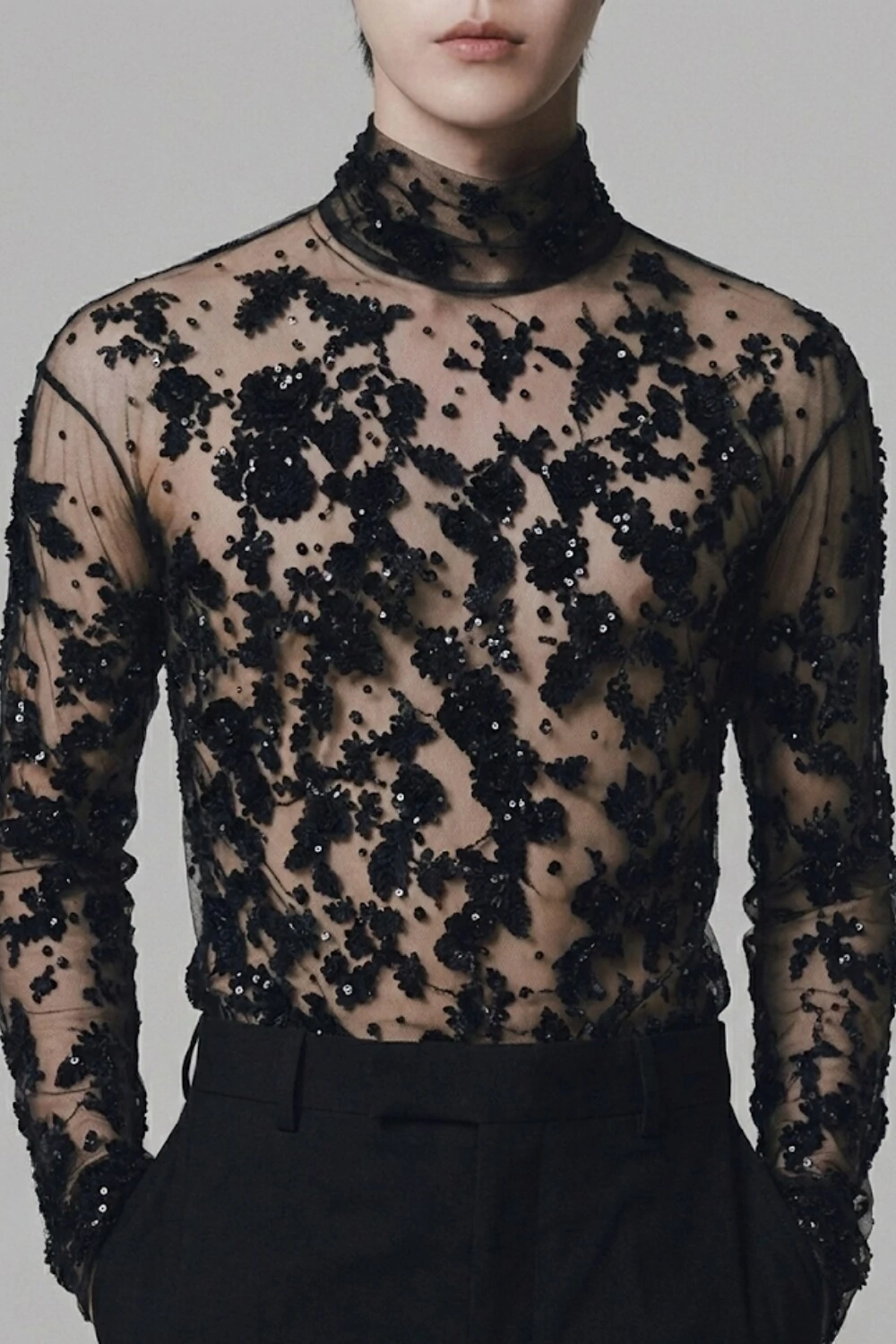 Camiseta confeccionada em base de tule translúcido nude, com bordado artesanal aplicado em renda e paetês pretos, formando um desenho orgânico distribuído por toda a peça.