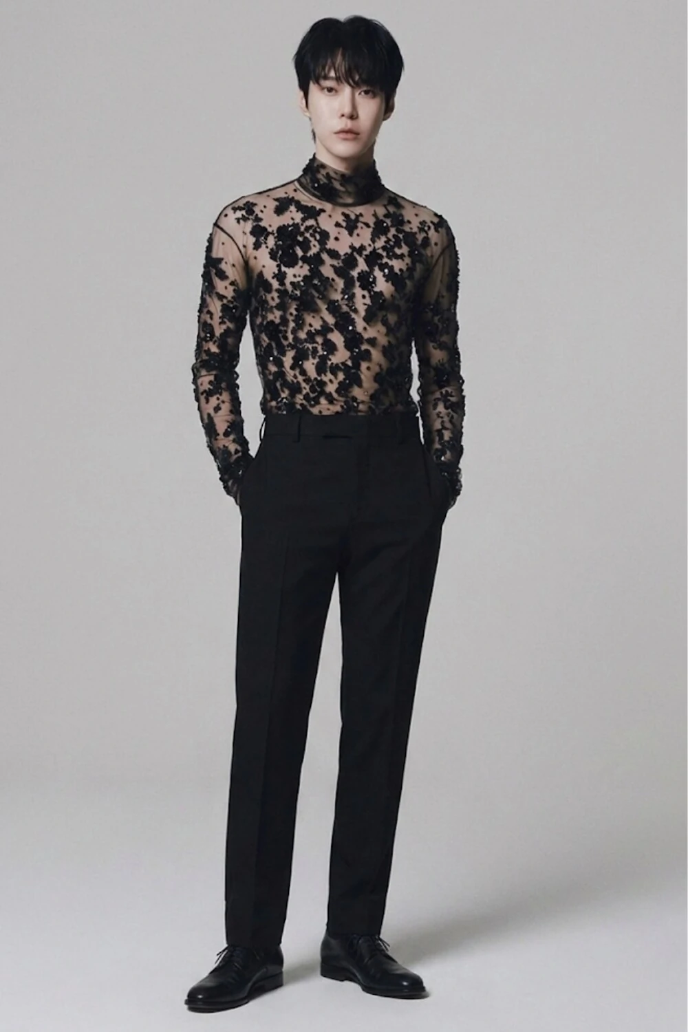 Possui gola alta delicada e mangas longas, equilibrando sensualidade e sofisticação.