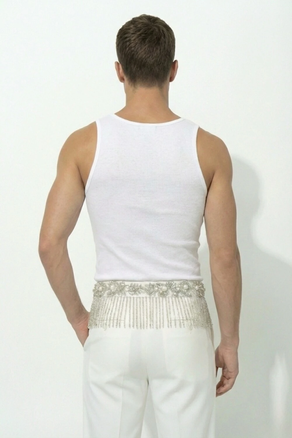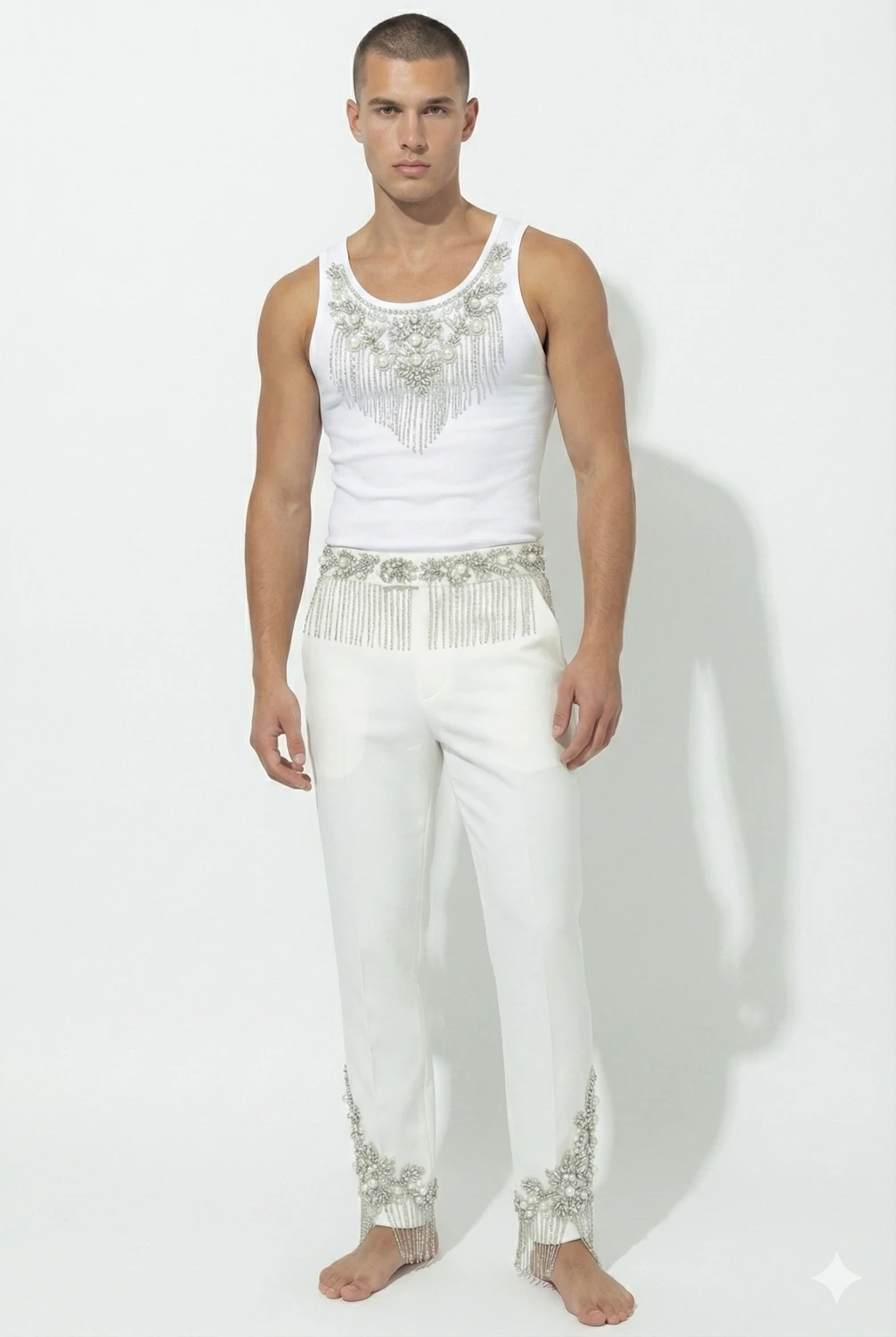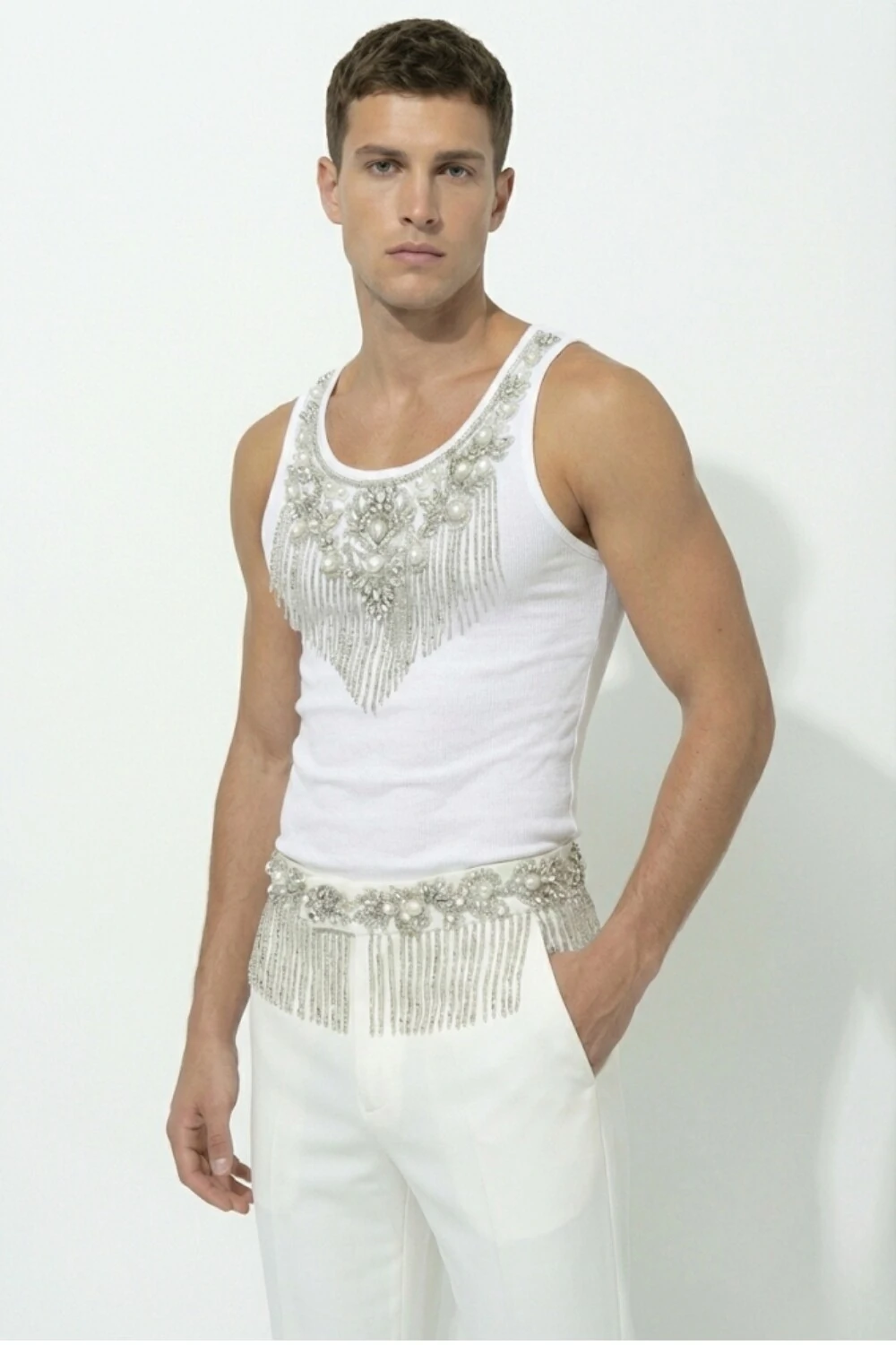Regata confeccionada em base branca ajustada ao corpo, com bordado artesanal frontal em pérolas, cristais e aplicações metálicas prateadas, formando um desenho orgânico que se estende a partir do decote.
