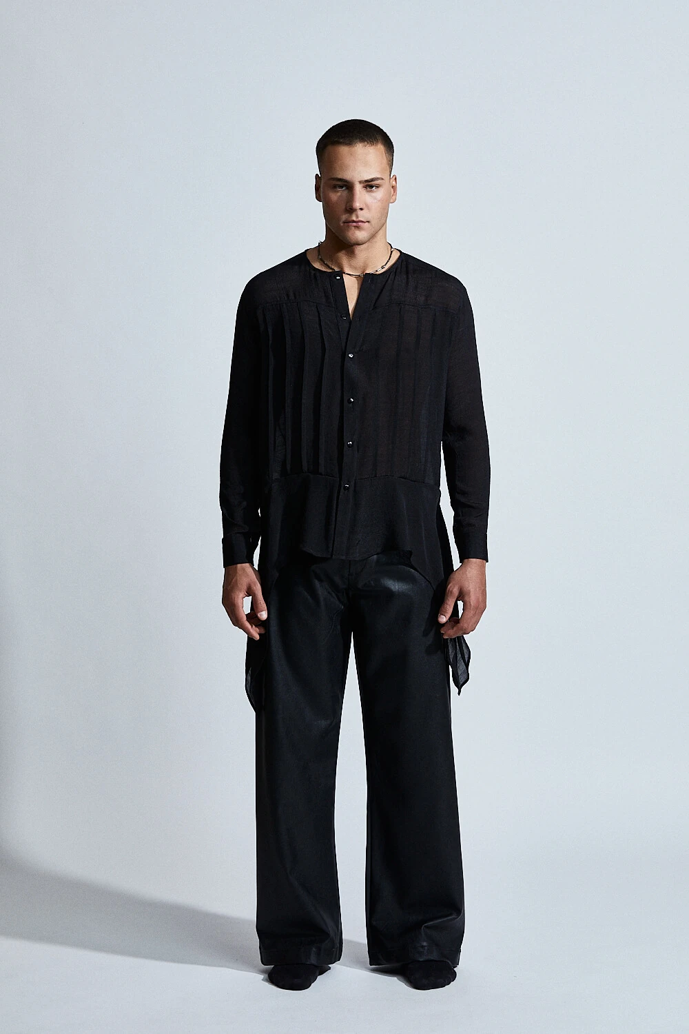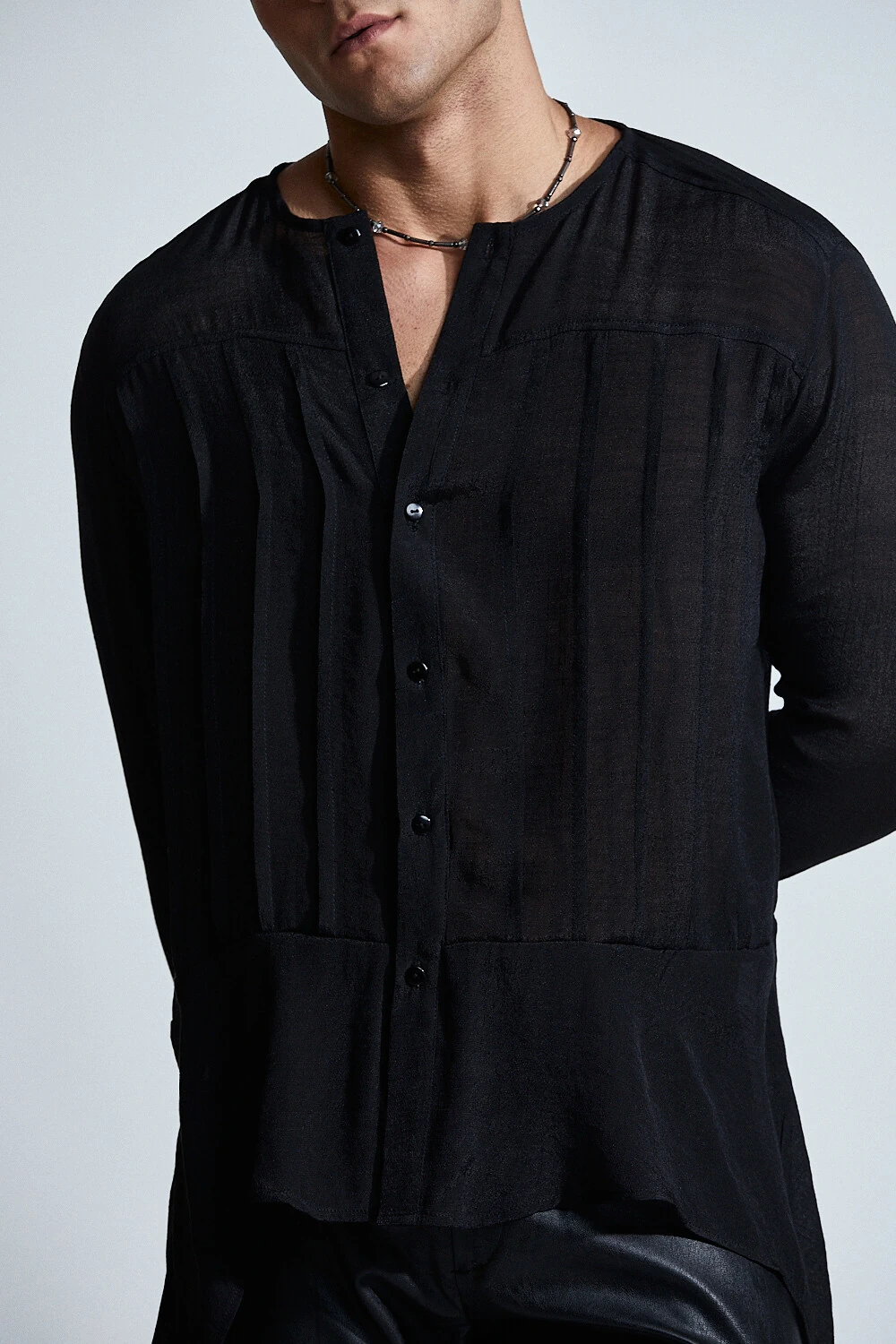 Confeccionada em chiffon translúcido, a peça traz uma construção fluida com pregas frontais delicadas e fechamento frontal por botões, criando um equilíbrio entre o clássico e o contemporâneo.