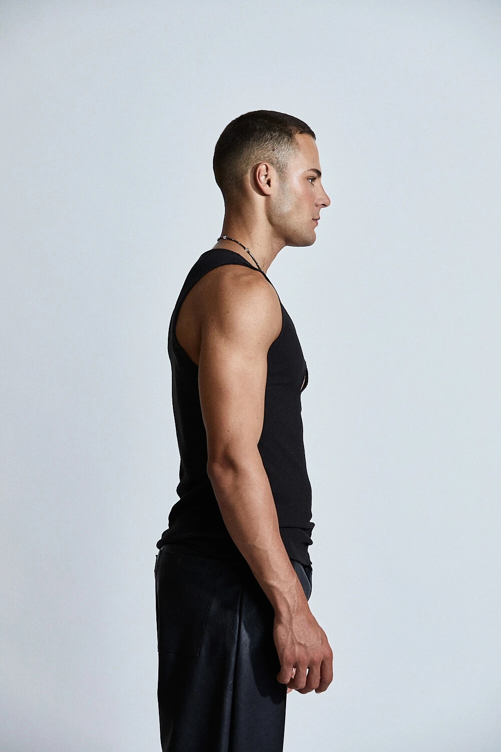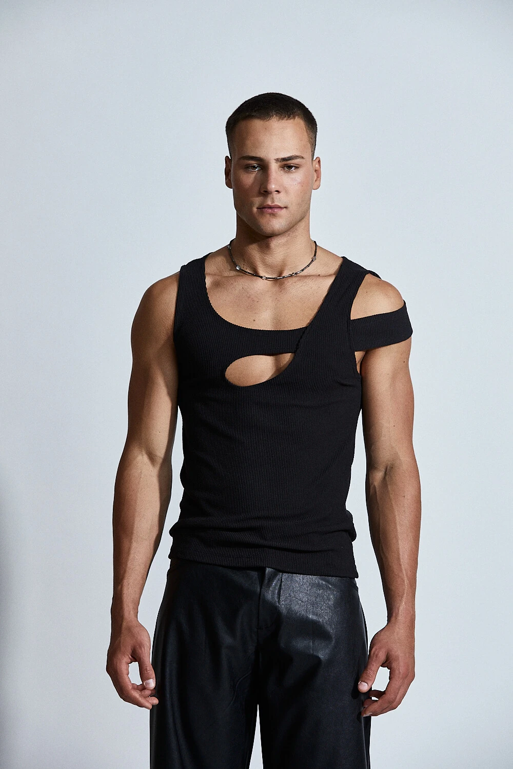 Confeccionada em malha canelada com alta elasticidade, ela se ajusta ao corpo valorizando a silhueta masculina com precisão. O recorte assimétrico com abertura frontal e o detalhe de ombro deslocado criam um design ousado e arquitetônico, revelando a pele de forma estratégica.