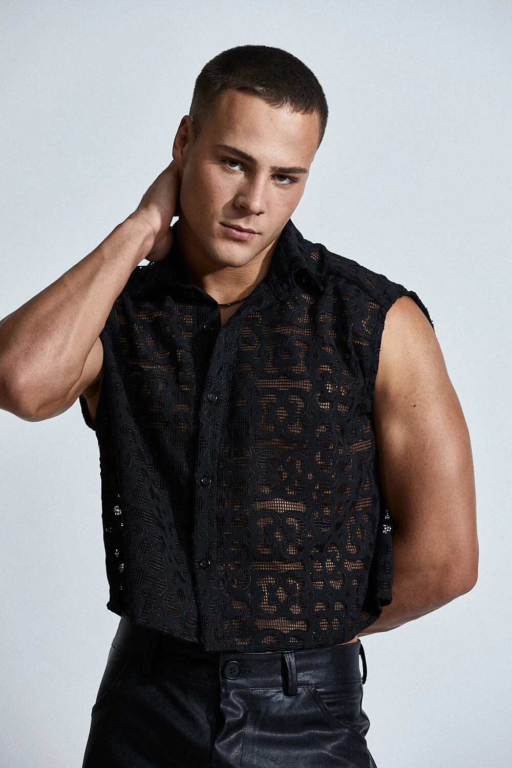 Sem mangas, ela valoriza a força do corpo masculino, tornando-se uma peça ideal para composições noturnas e produções de impacto.