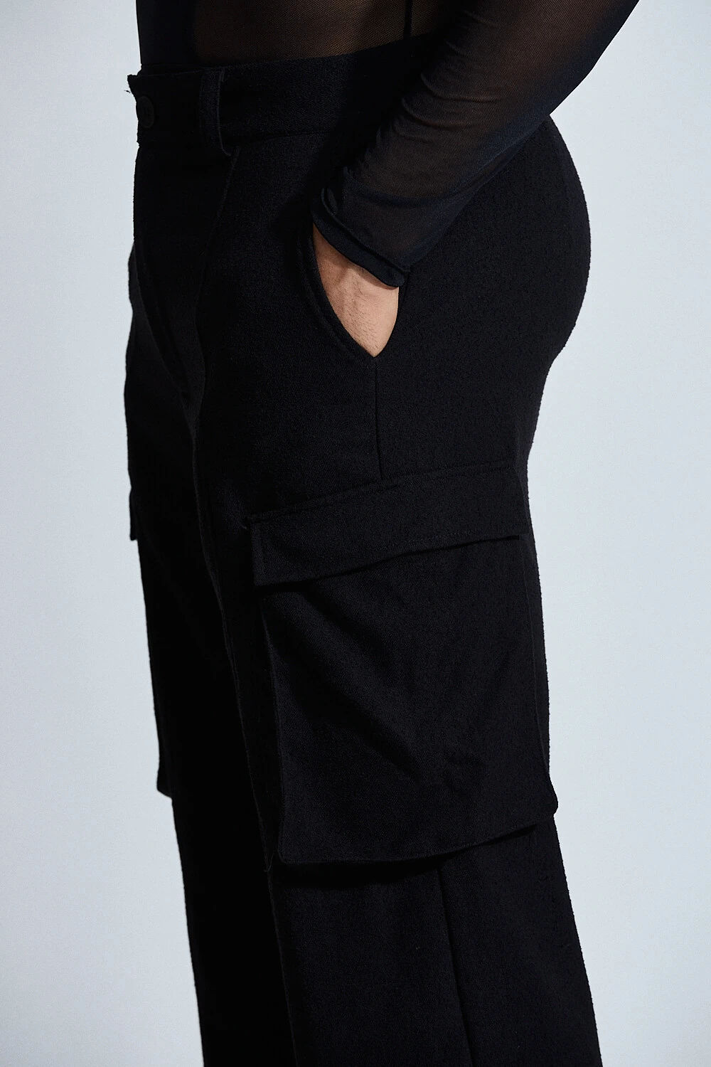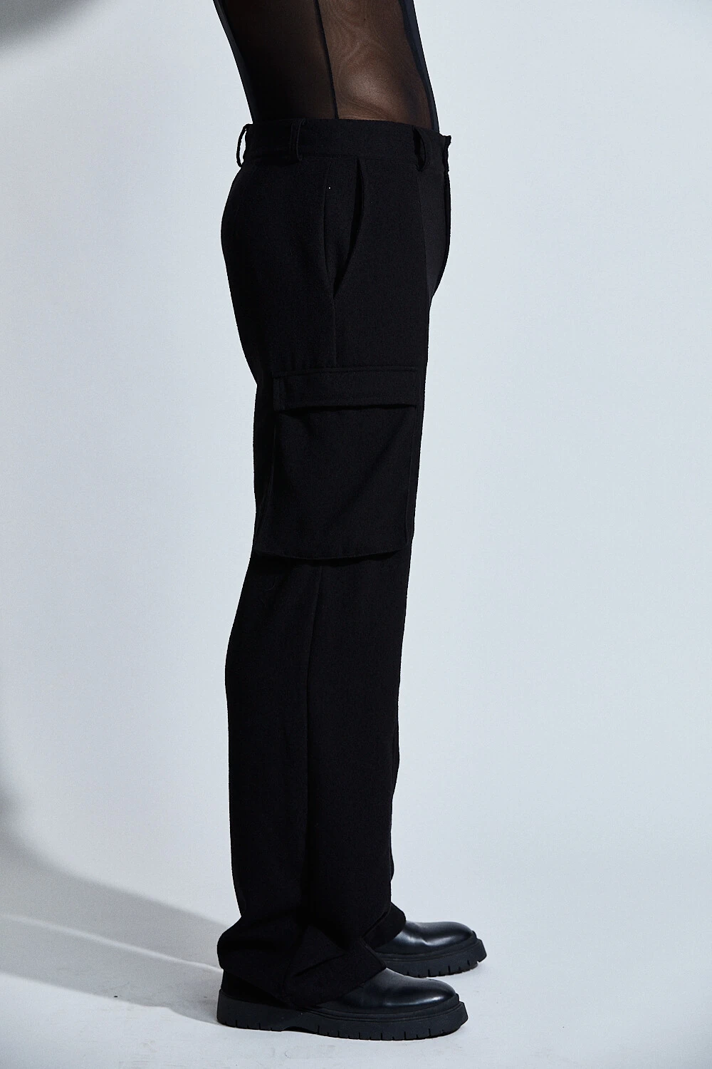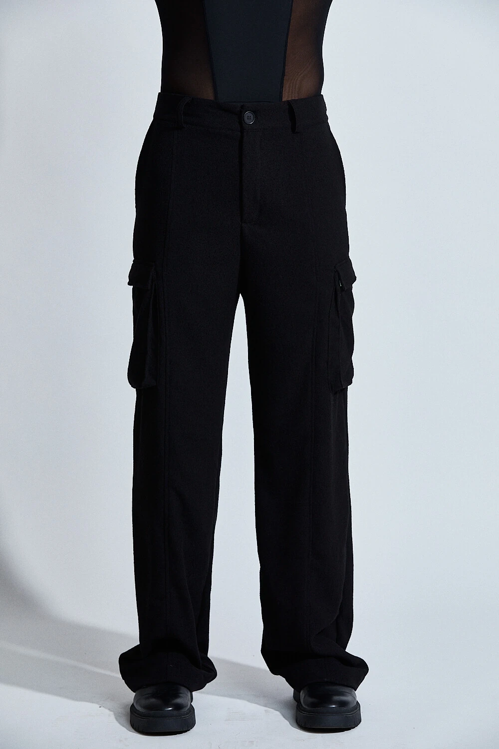 Confeccionada em tecido encorpado com caimento estruturado, a peça apresenta modelagem reta com leve amplitude, criando uma silhueta elegante e alongada. Os bolsos cargo laterais adicionam funcionalidade e um toque utilitário sofisticado.