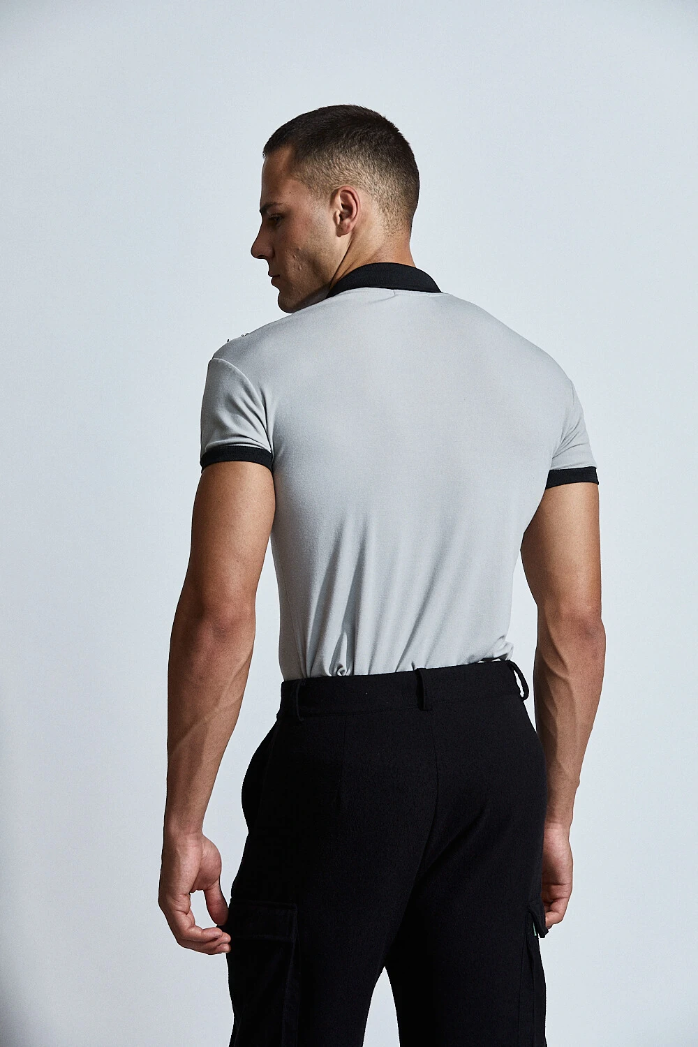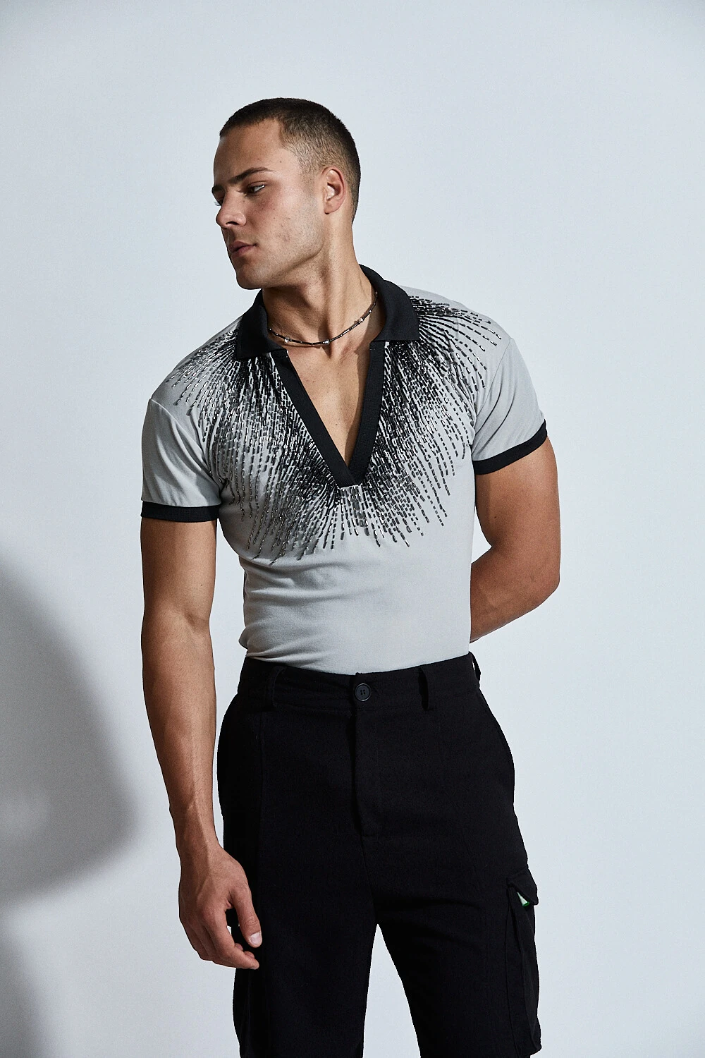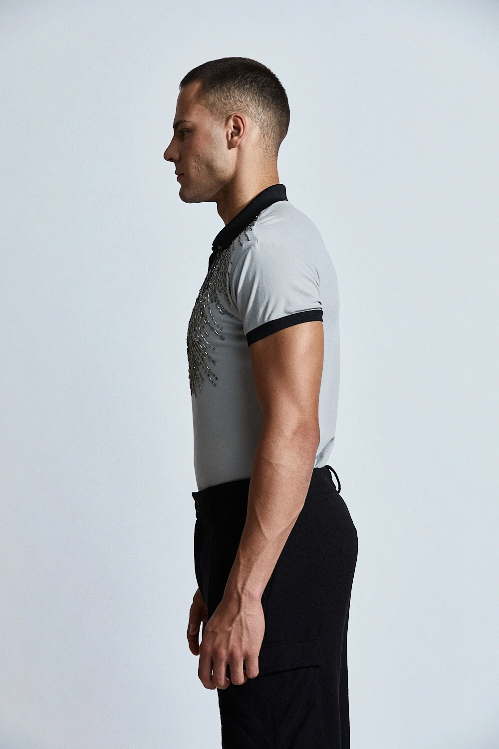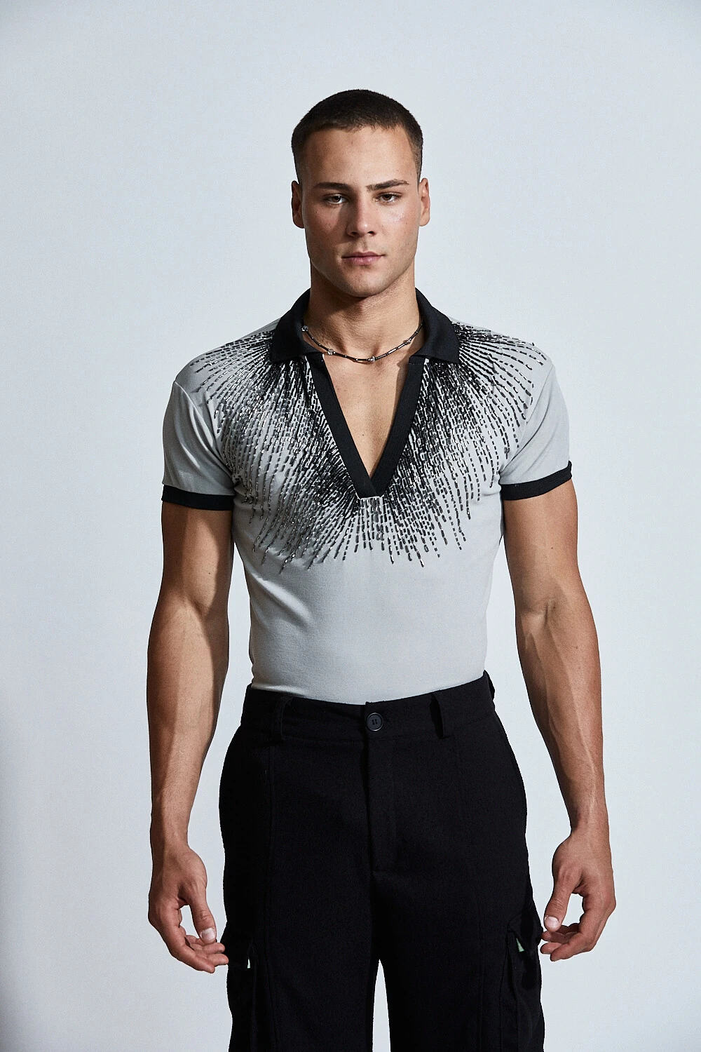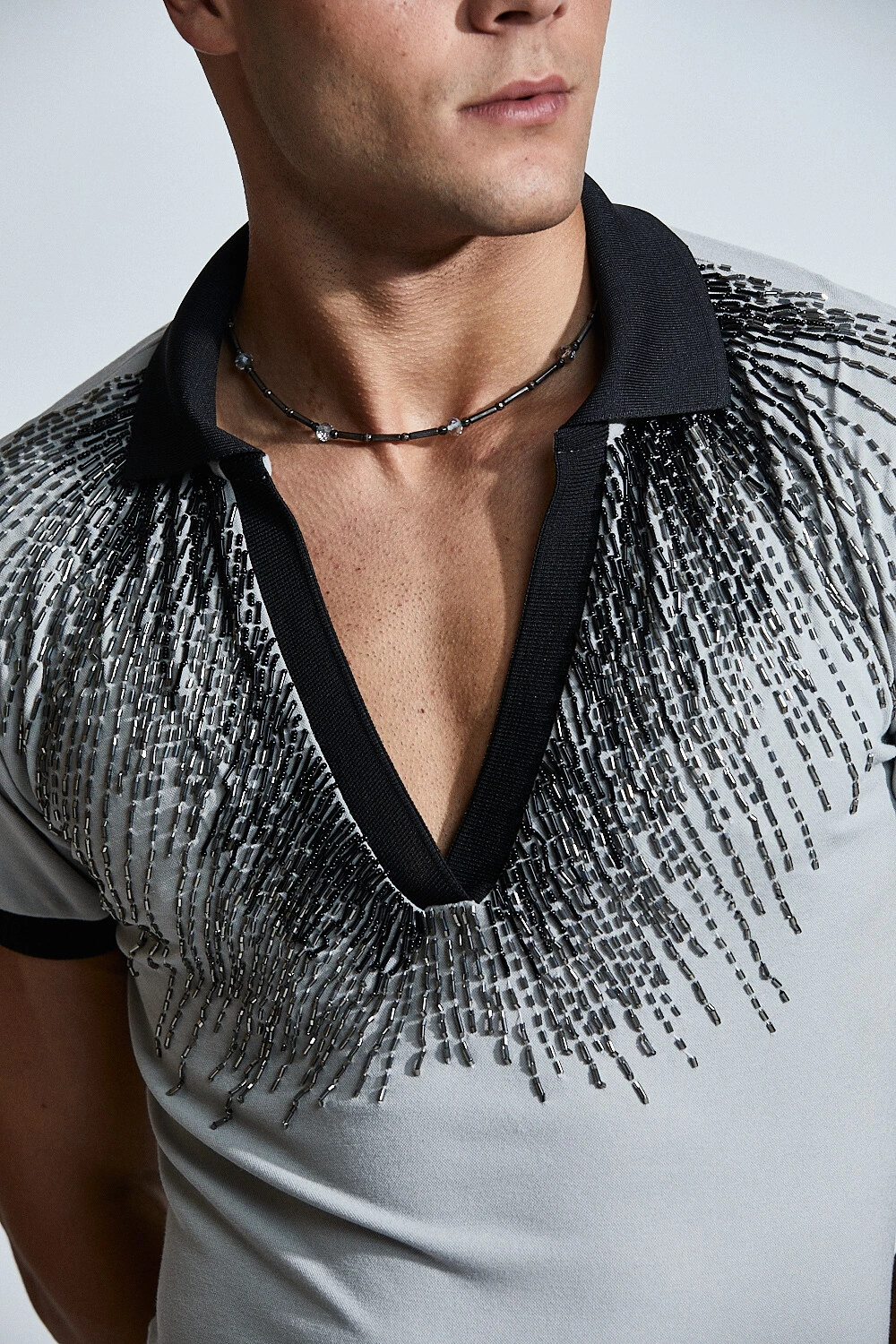 Confeccionada em base leve e confortável, a peça recebe bordado manual com aplicação de pedrarias que criam um efeito de luz sutil e elegante sobre o corpo. O desenho orgânico do bordado valoriza o torso e acompanha a anatomia masculina com fluidez.