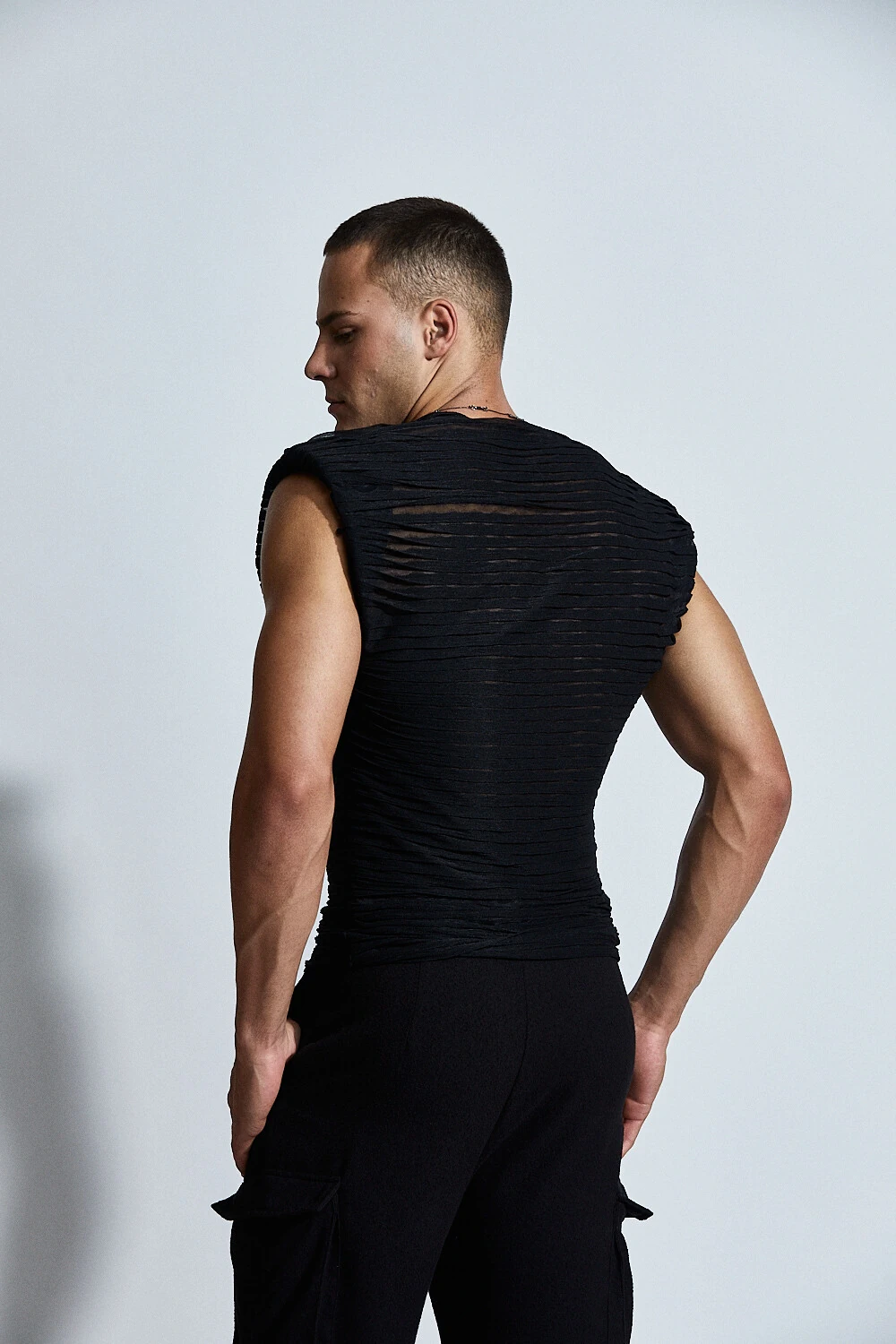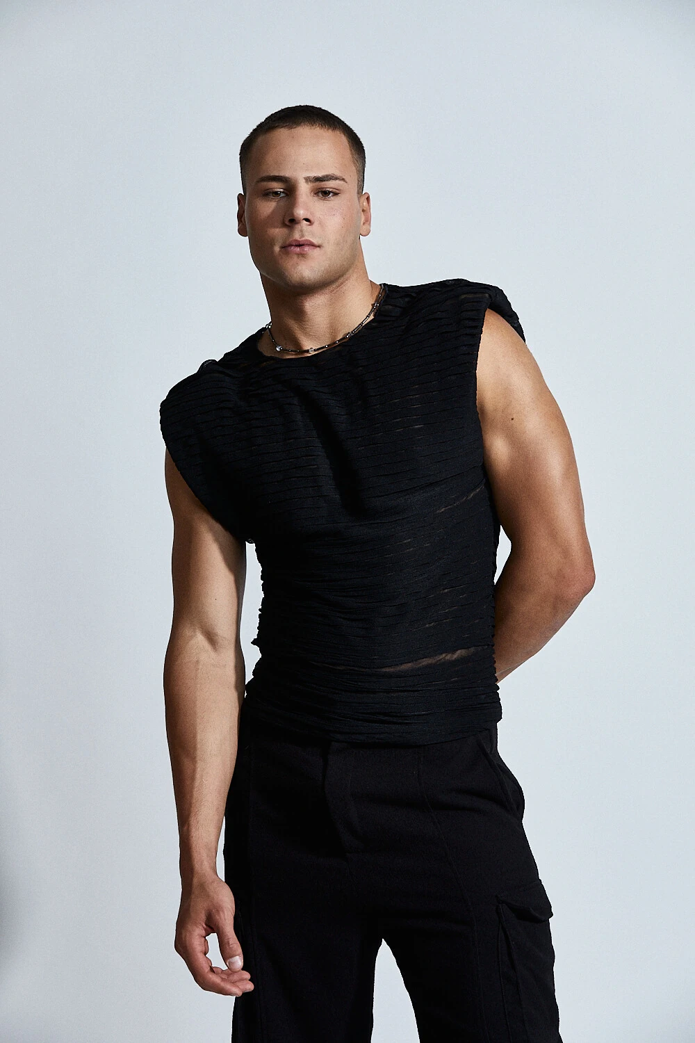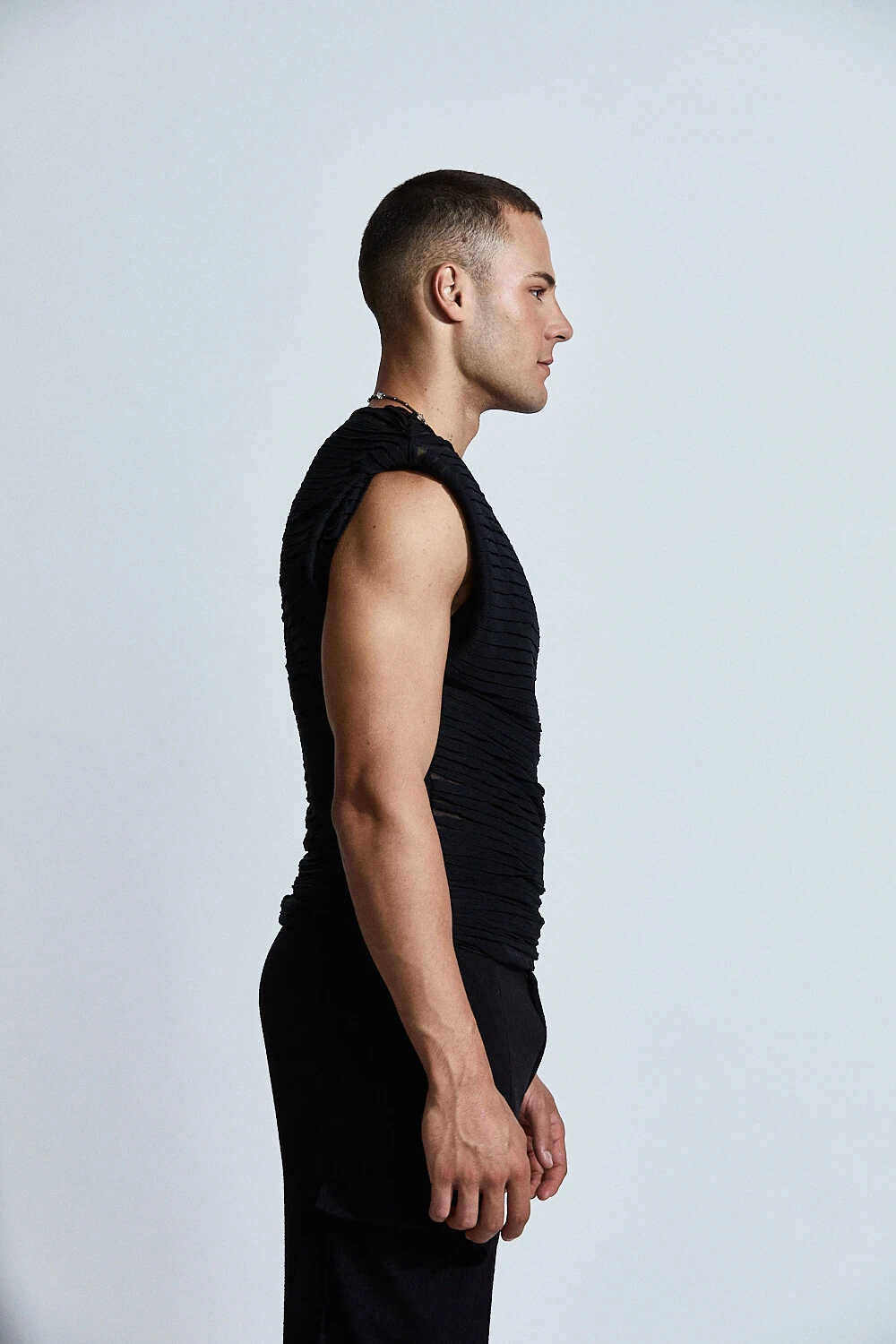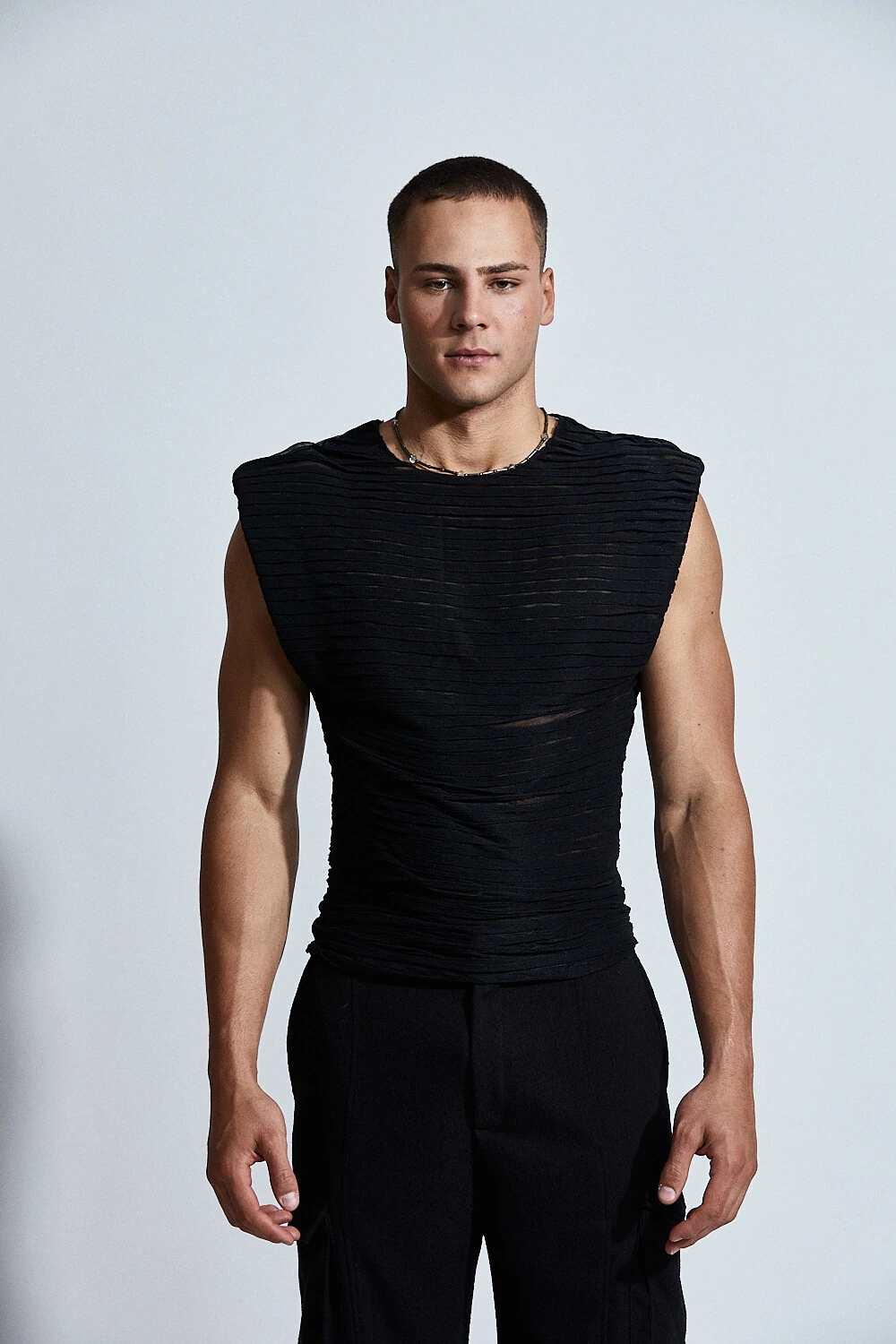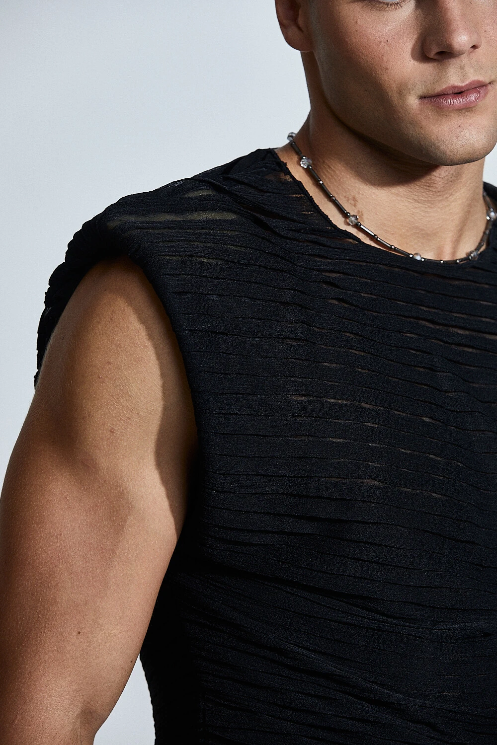 Confeccionada em tecido plissado com leve transparência, a peça cria textura e profundidade ao mesmo tempo em que se adapta ao corpo com fluidez. As ombreiras estruturadas elevam a silhueta, trazendo imponência e presença ao visual.