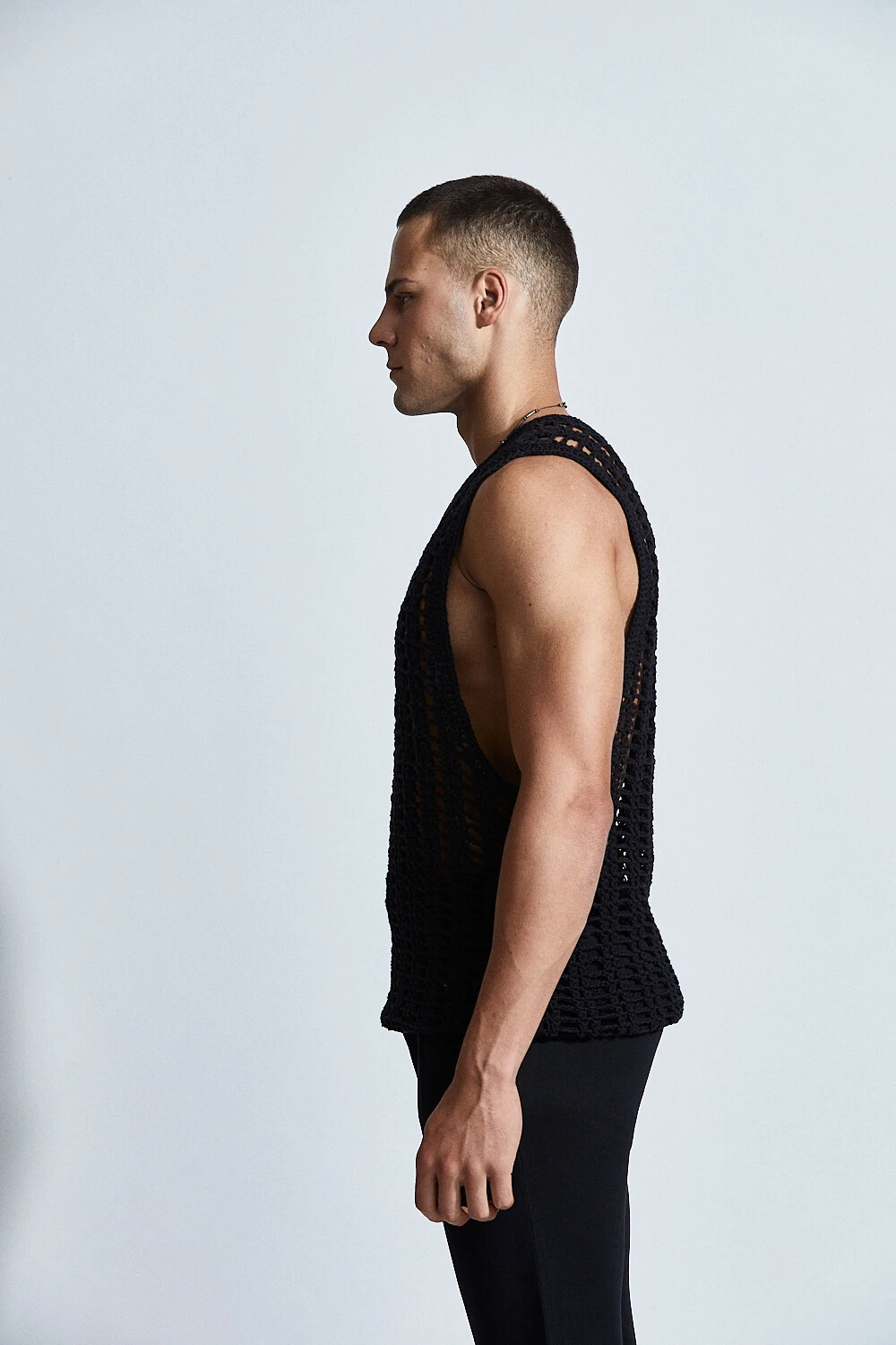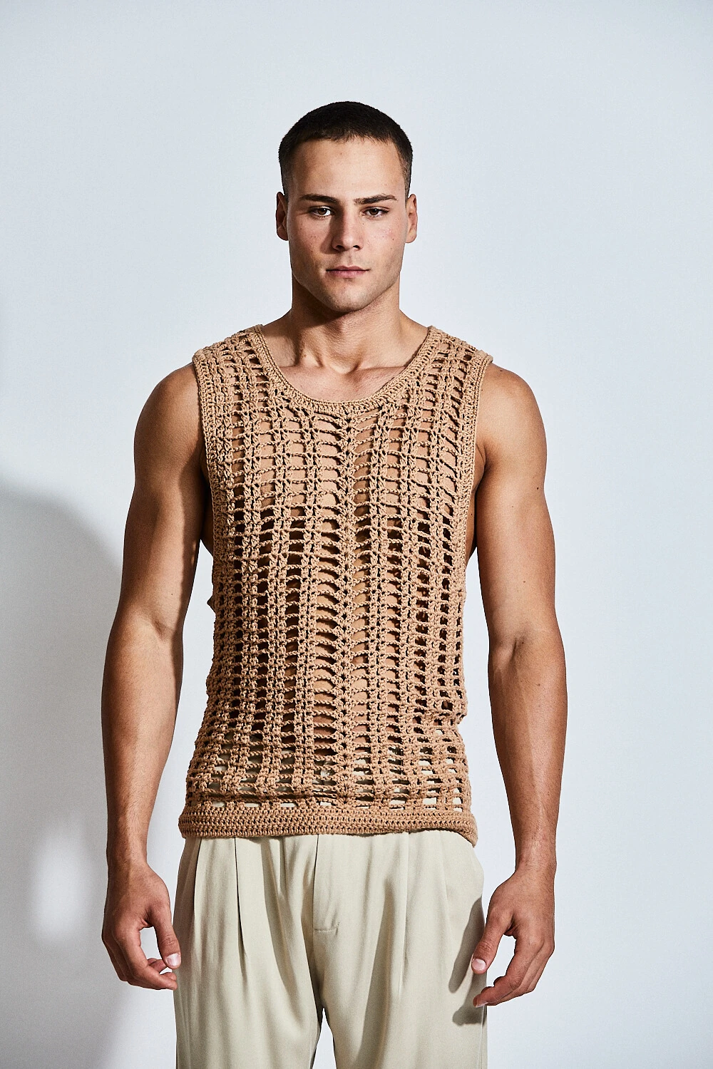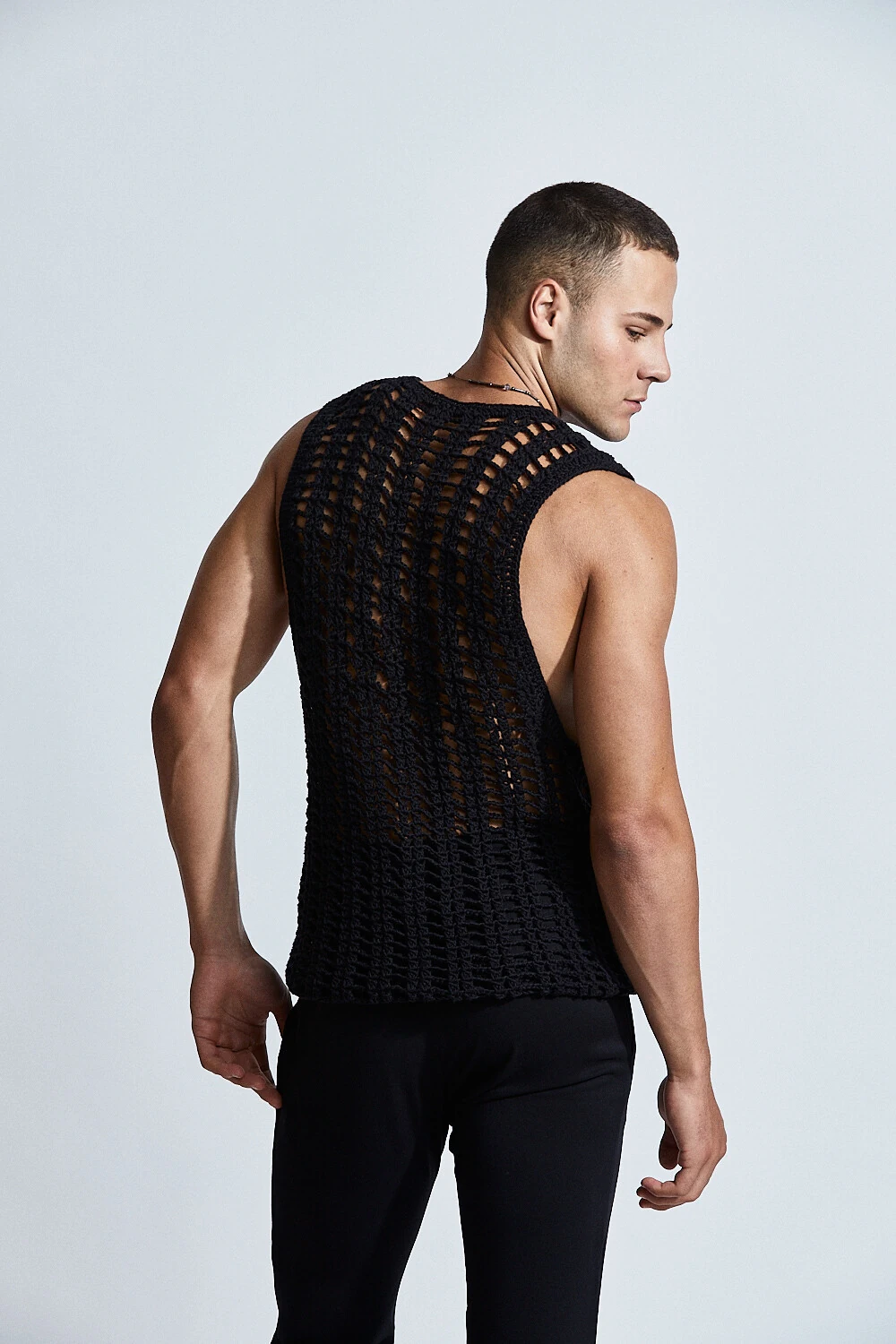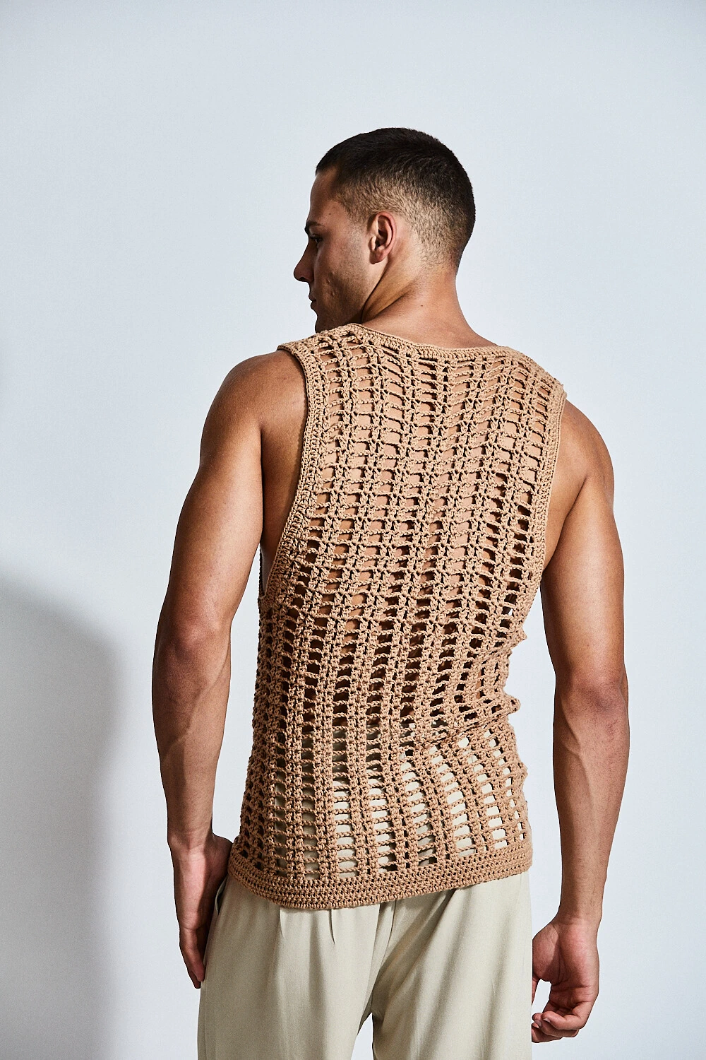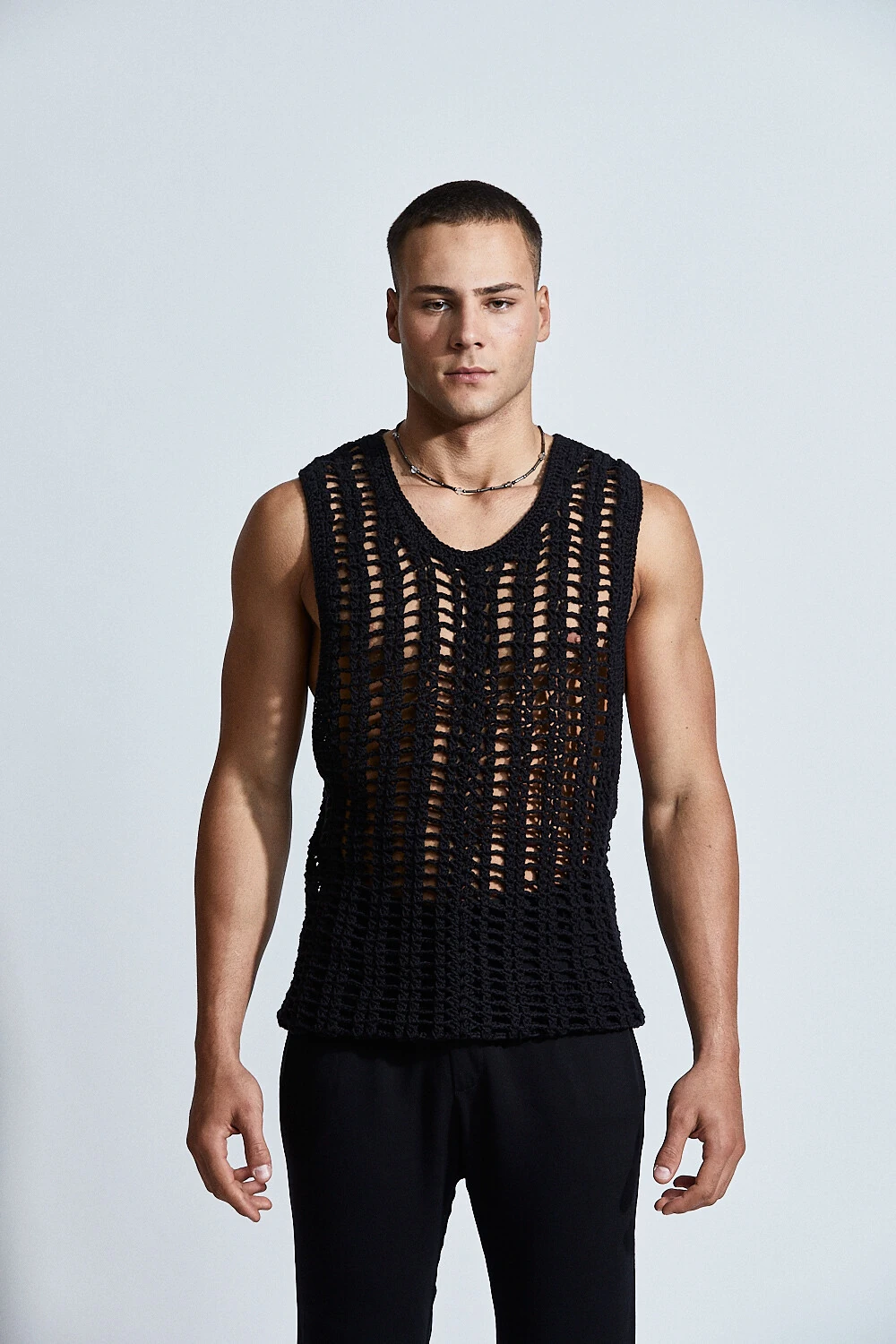 Confeccionada em crochê com fio 100% algodão, a peça apresenta uma trama vertical que alonga a silhueta e valoriza o corpo de forma sutil. A transparência do desenho revela a pele com elegância, criando um equilíbrio entre leveza e presença.