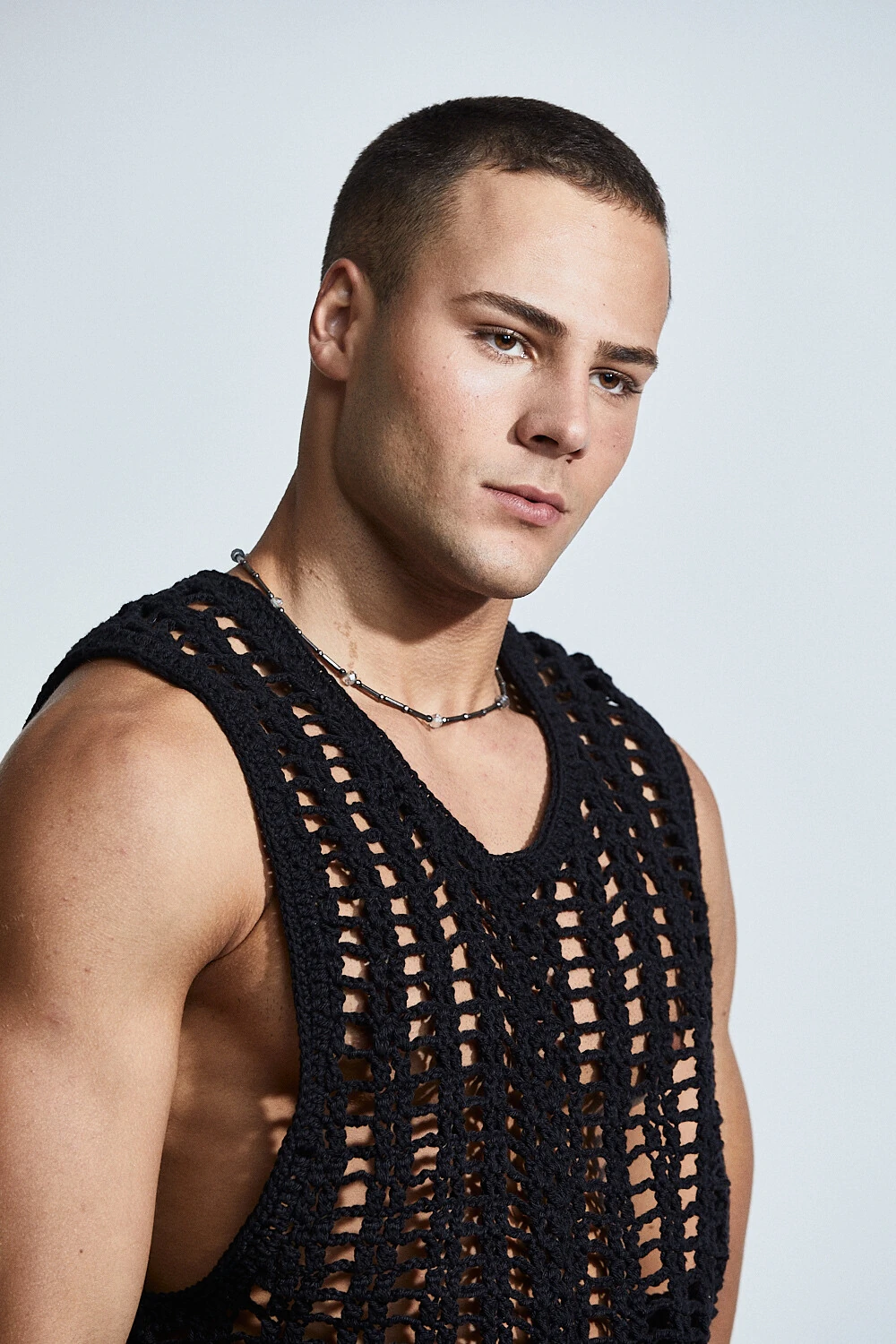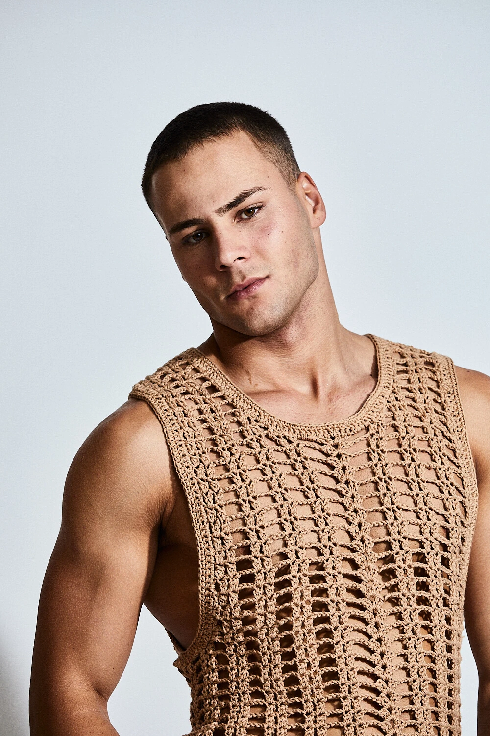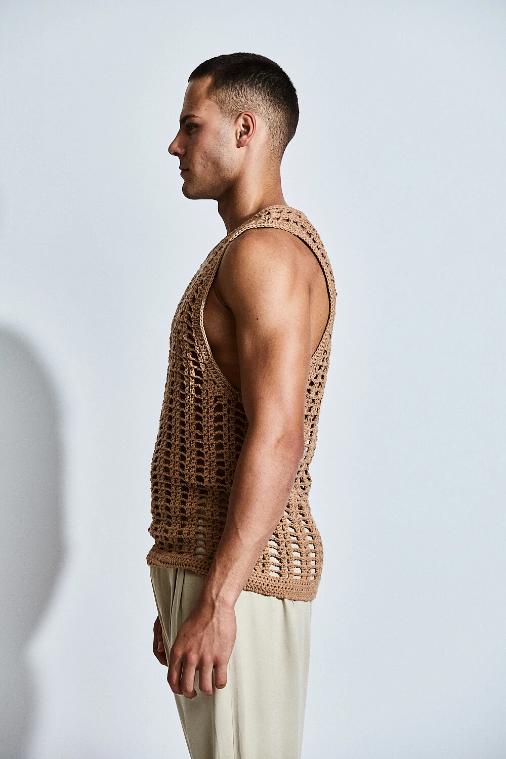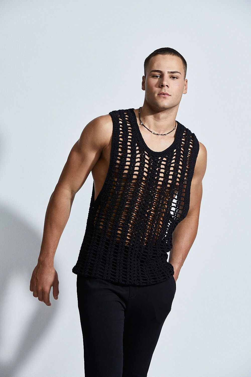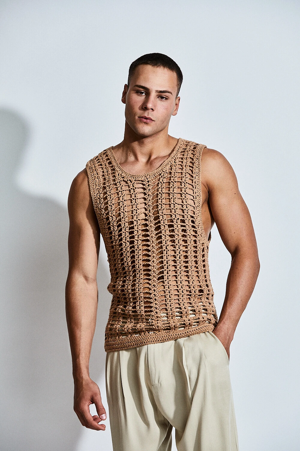 Confeccionada em crochê com fio 100% algodão, a peça apresenta uma trama vertical que alonga a silhueta e valoriza o corpo de forma sutil. A transparência do desenho revela a pele com elegância, criando um equilíbrio entre leveza e presença.