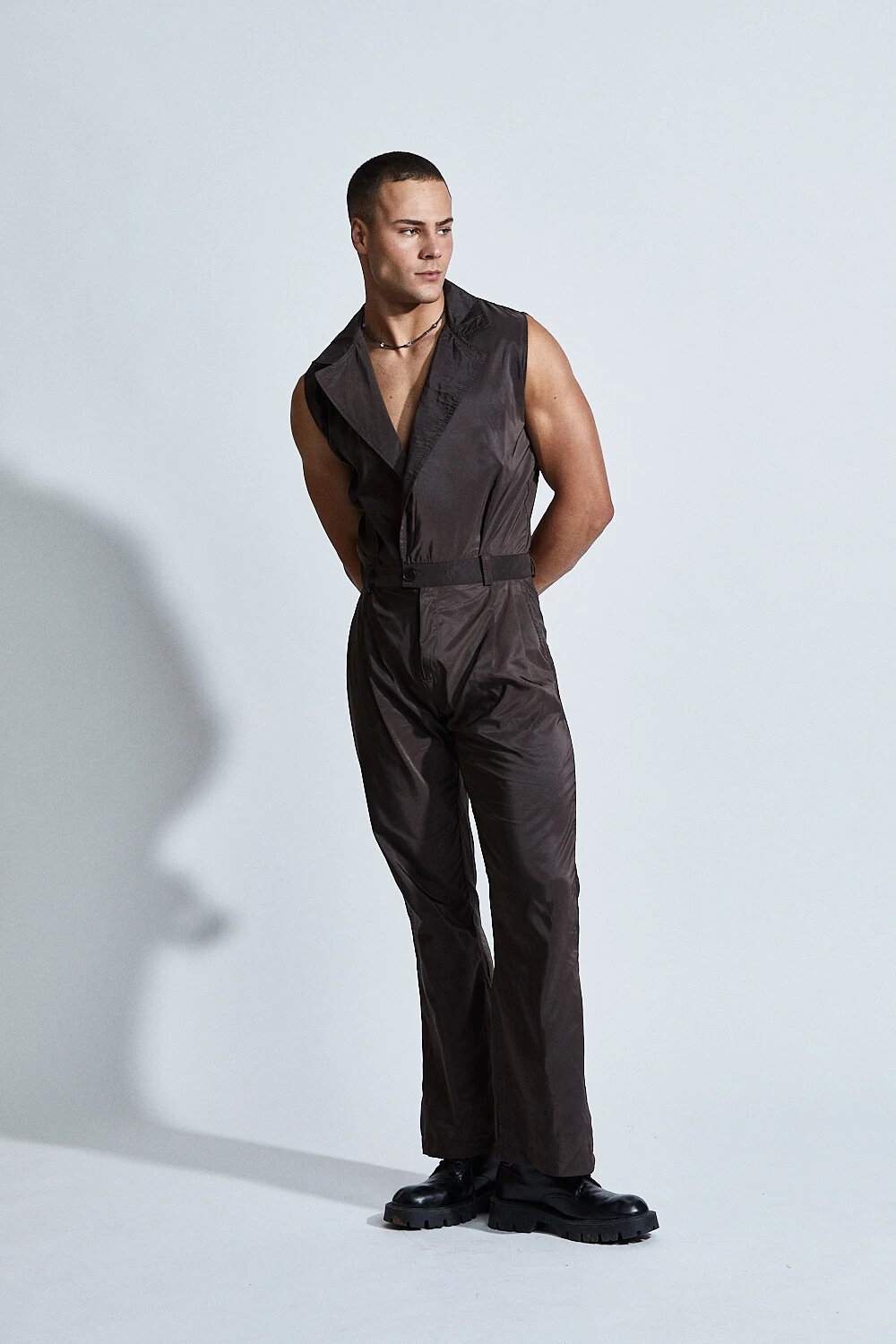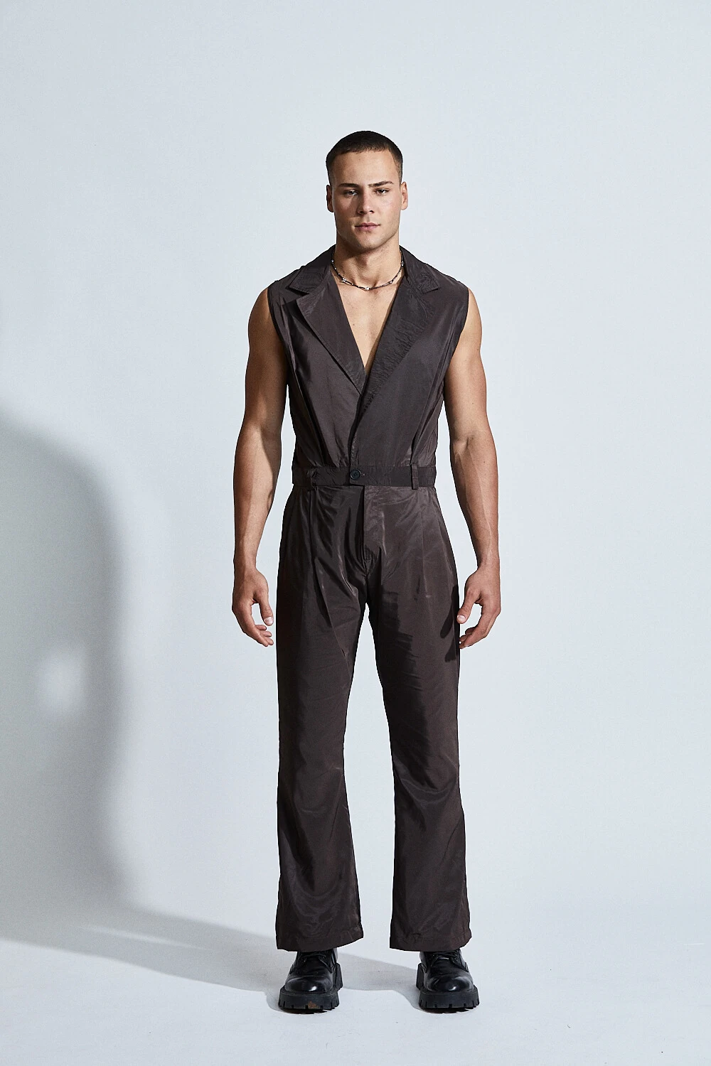 Confeccionado em tecido leve com leve brilho, apresenta caimento estruturado que valoriza a silhueta masculina com sofisticação. O decote profundo com lapela alonga o torso, enquanto a cintura marcada define o corpo com precisão.