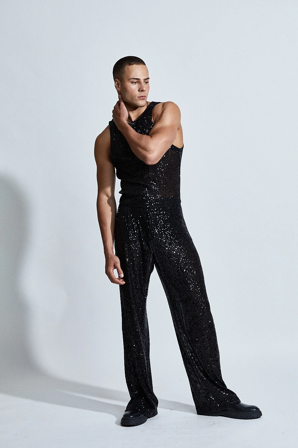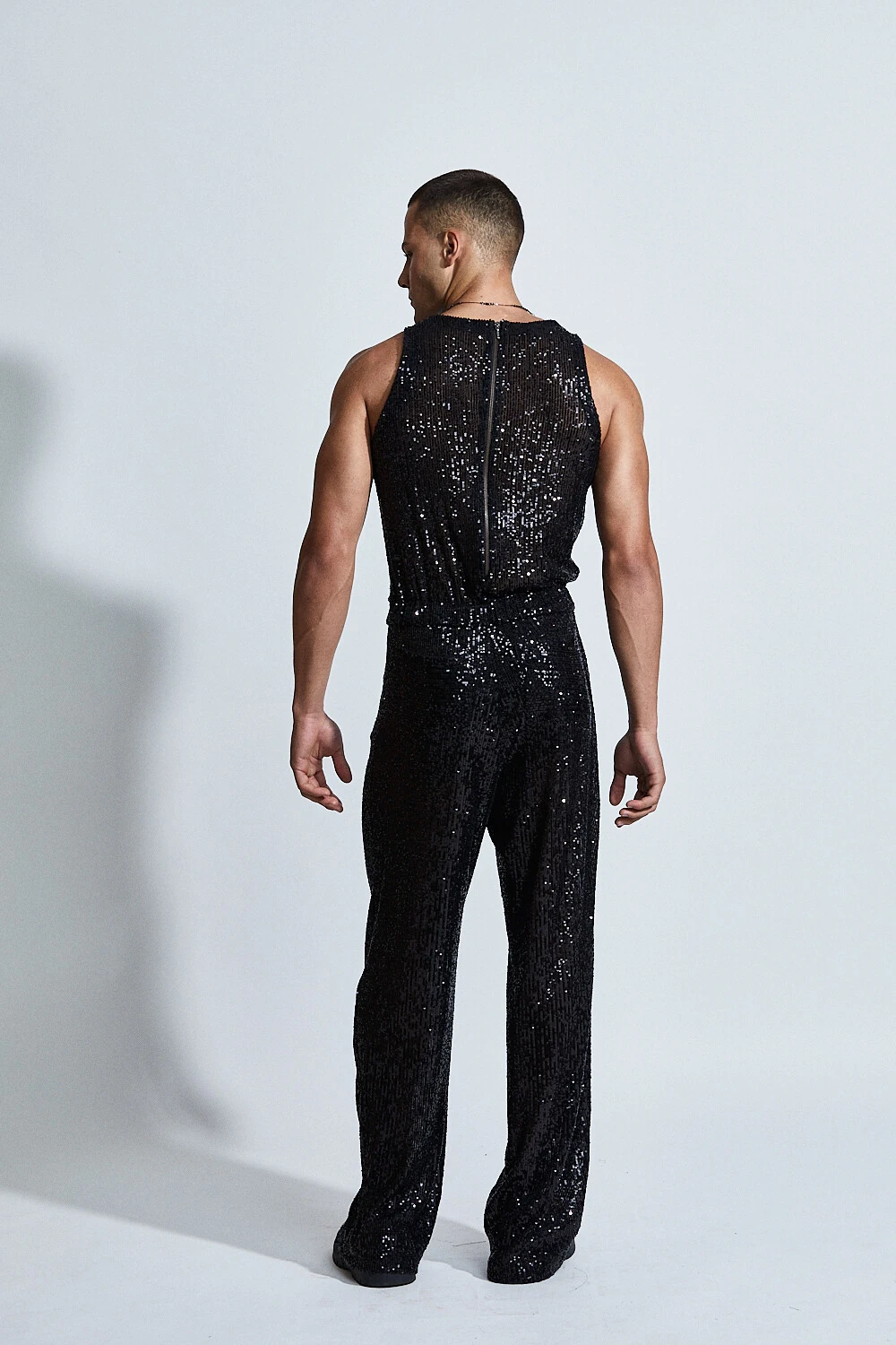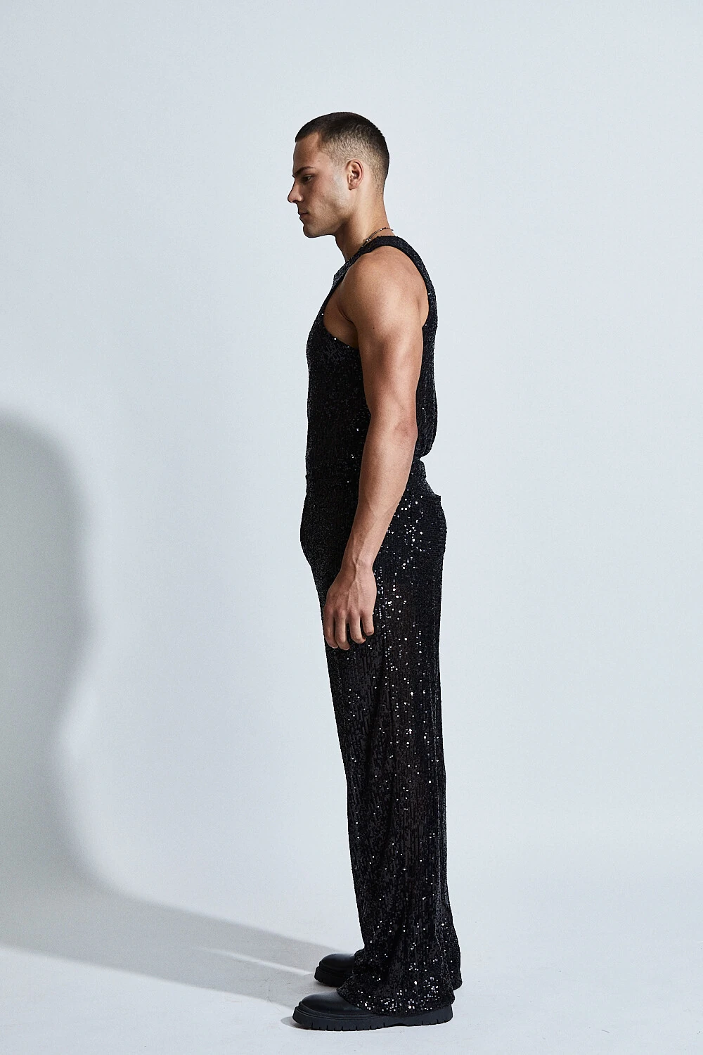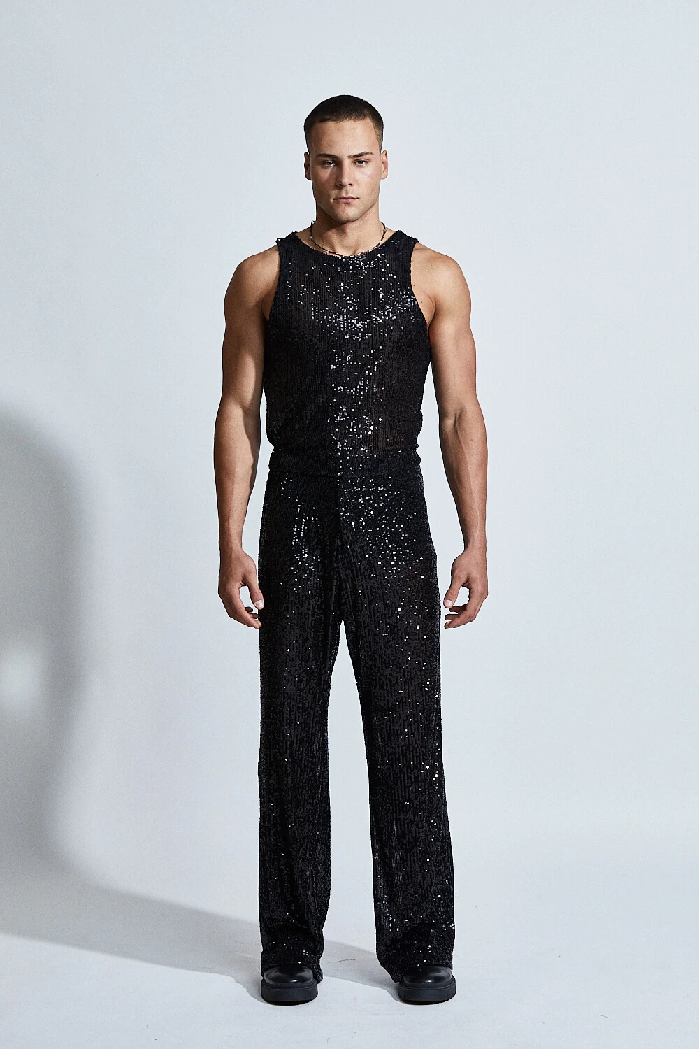 Inteiramente confeccionado em paetês, a peça captura e reflete a luz a cada movimento, criando um efeito hipnótico e sofisticado. A modelagem reta com caimento fluido equilibra o brilho intenso com uma silhueta elegante e alongada.