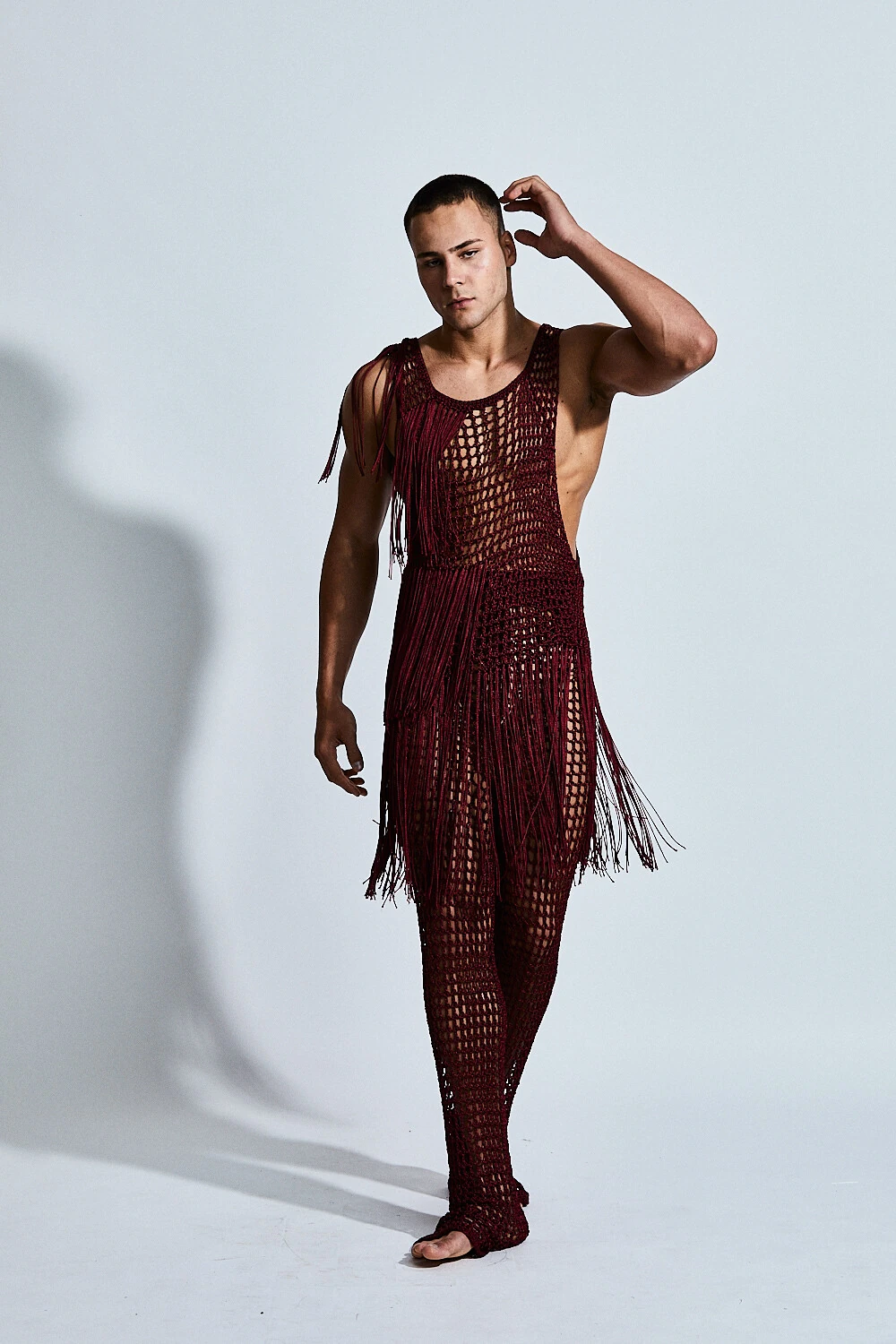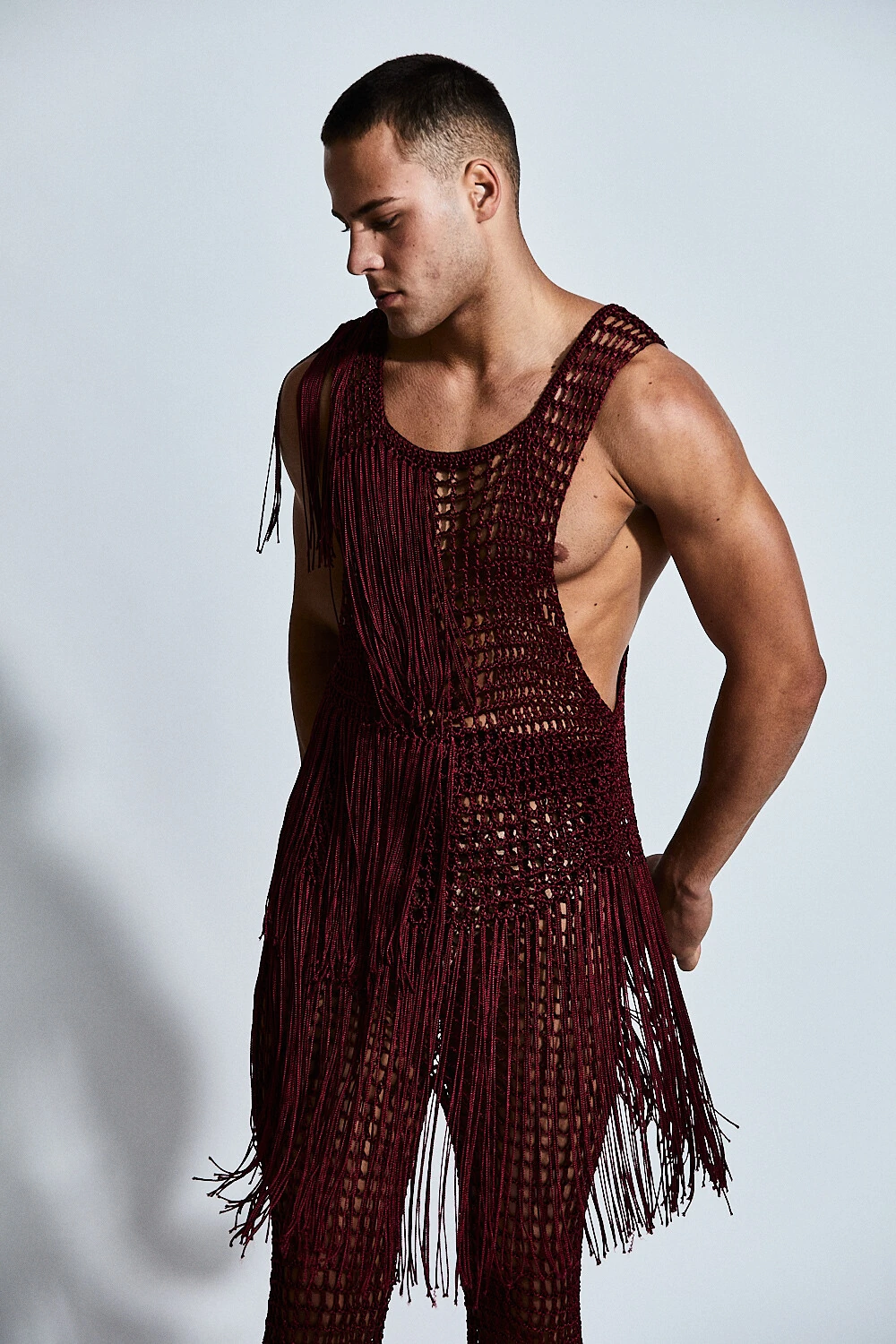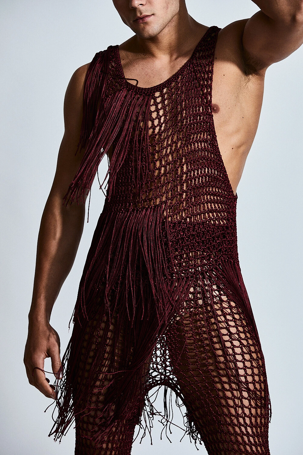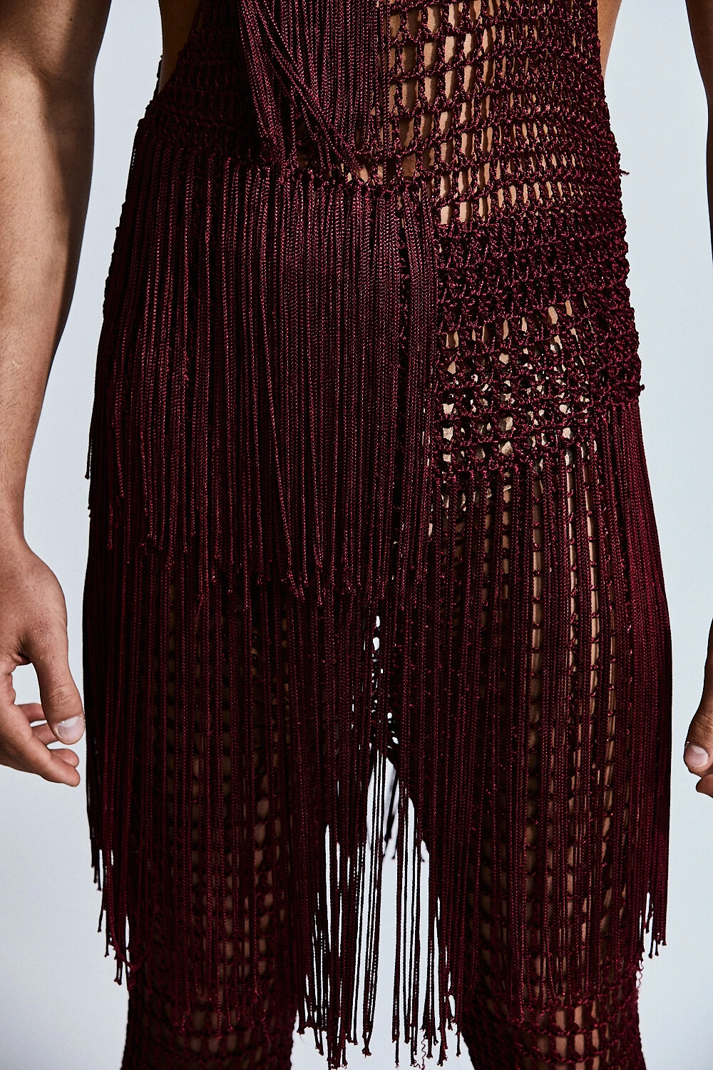 Confeccionada em crochet de viscose, revela o corpo com ousadia através de sua construção aberta, enquanto as longas franjas criam um efeito fluido e hipnótico a cada passo.