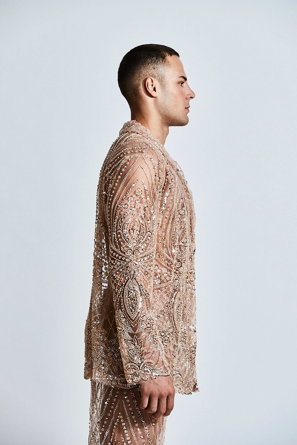 Confeccionado em base translúcida, o modelo é inteiramente bordado à mão com pedrarias e paetês que desenham padrões orgânicos e luminosos sobre o corpo. O corte de alfaiataria, aliado à transparência e ao brilho intenso do bordado, cria uma peça que transita entre o clássico e o provocante.