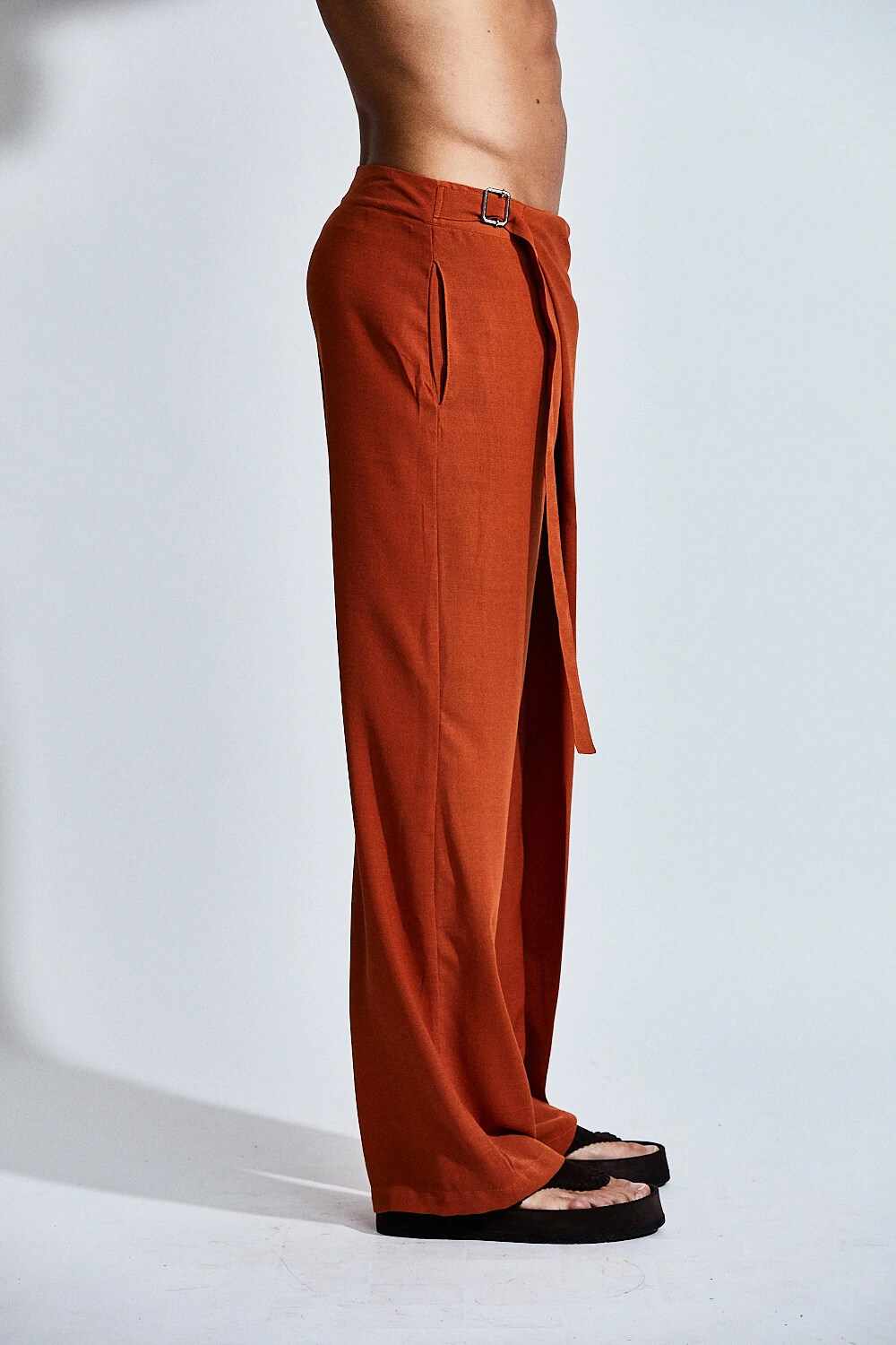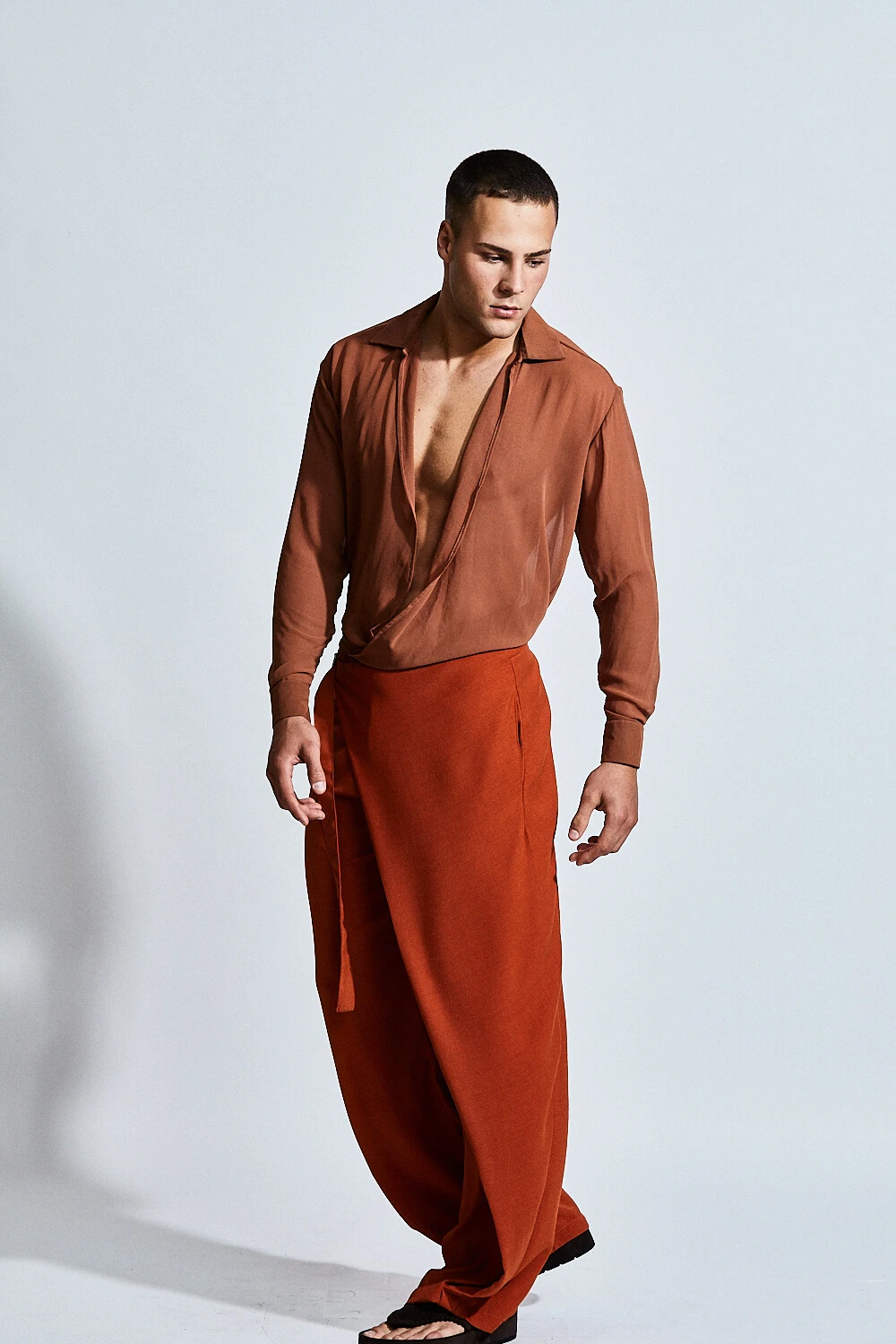 Confeccionada em crepe pesado de viscose, possui caimento impecável e toque macio, criando movimento natural a cada passo. A modelagem ampla alonga a silhueta, enquanto a faixa lateral alongada adiciona um detalhe sofisticado e moderno, trazendo identidade à peça.
