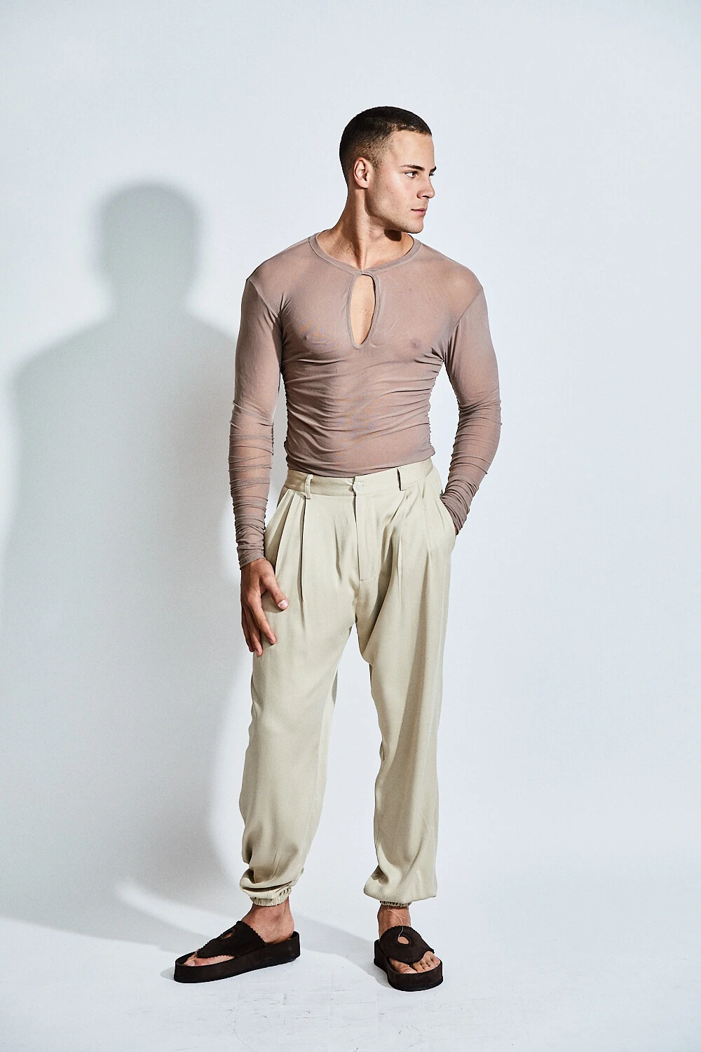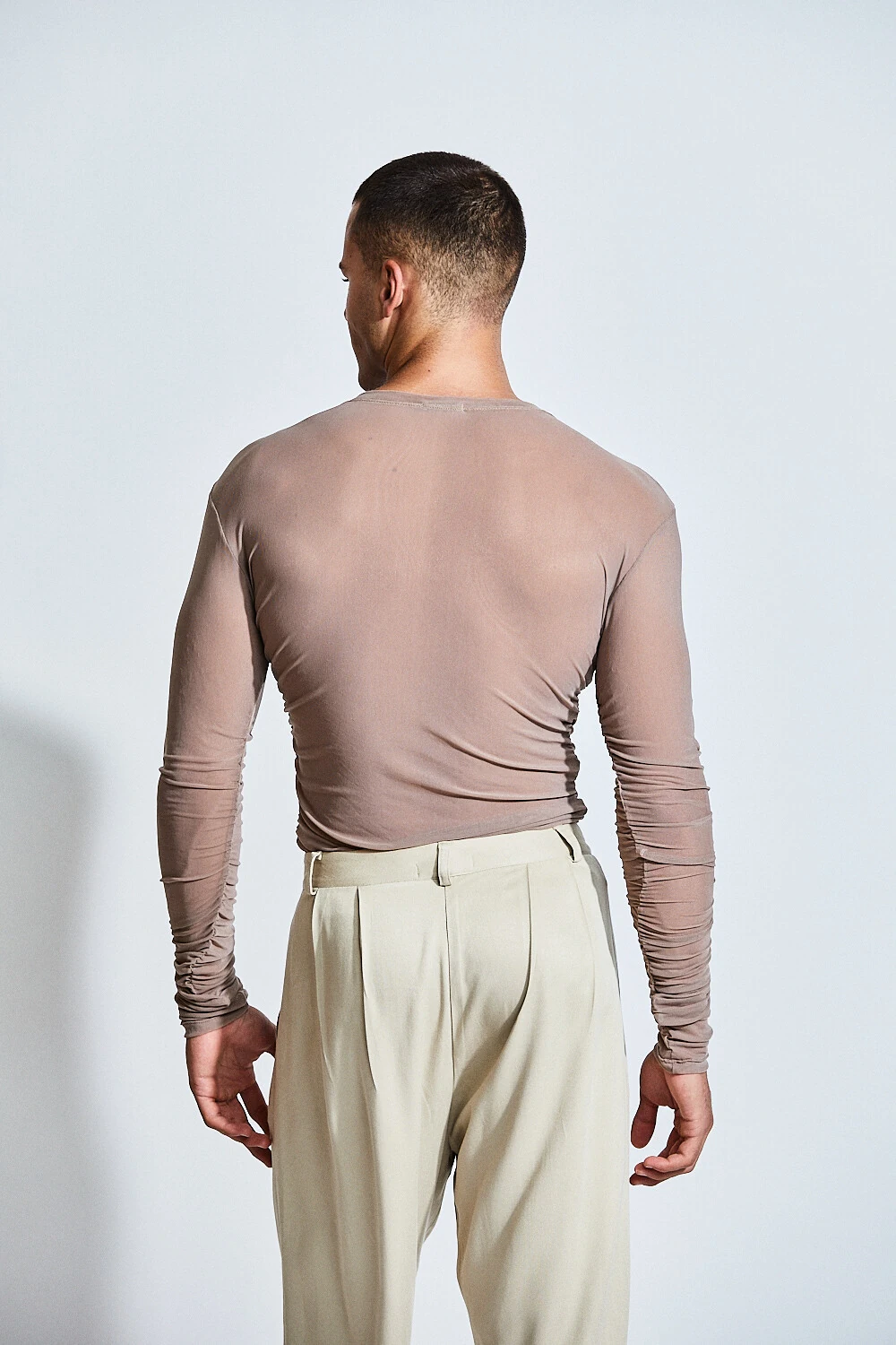 A Blusa Néreo Rebirth revela a sensualidade masculina através da leveza e da transparência.
