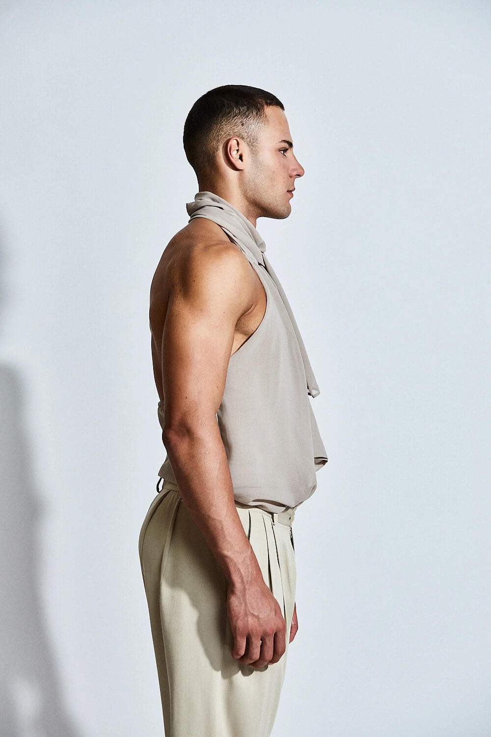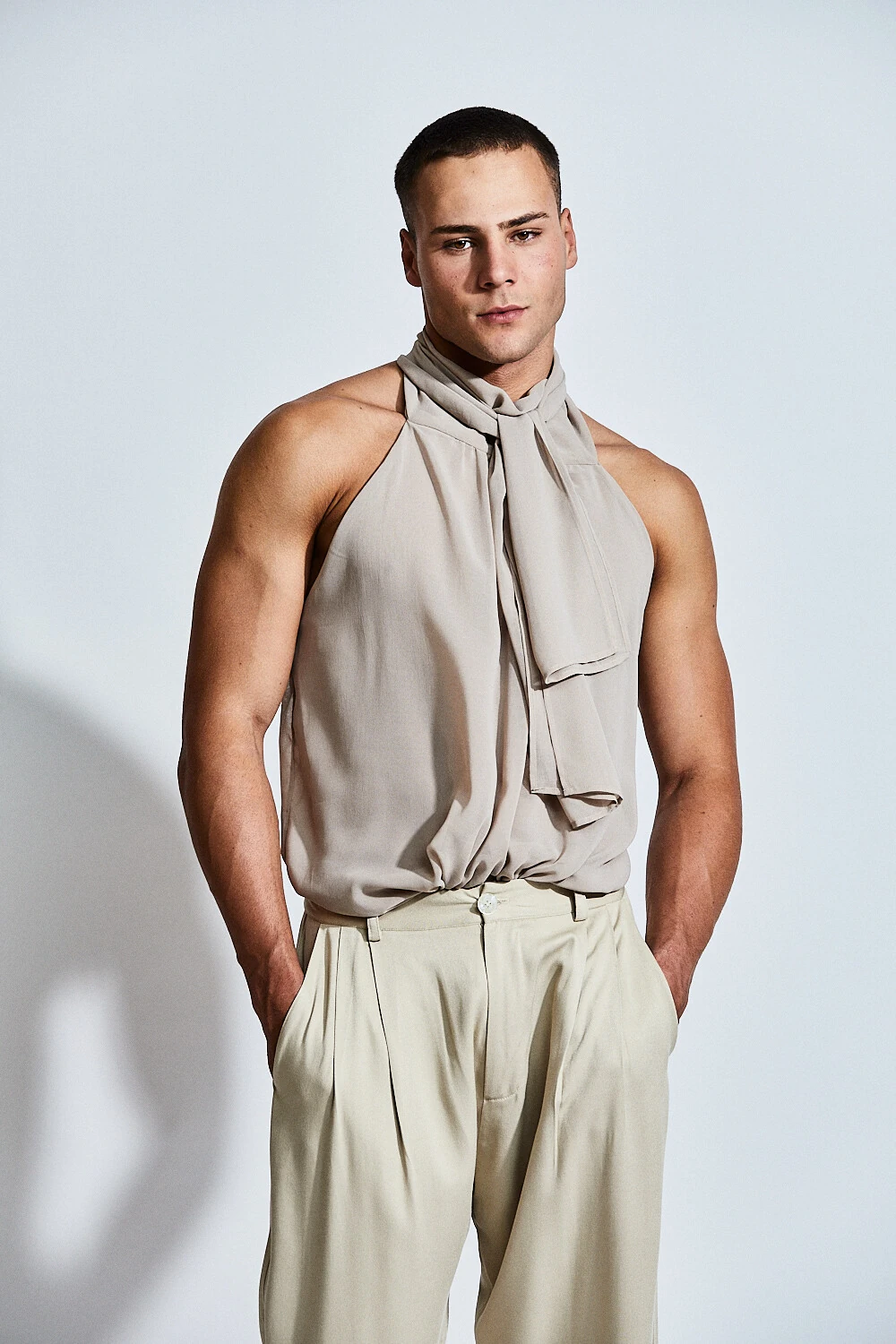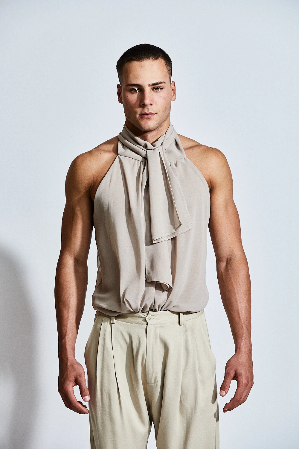 Confeccionada em tecido de viscose com toque macio e caimento fluido, a peça se adapta ao corpo com naturalidade, criando movimento e sofisticação a cada gesto. Sua modelagem frente única valoriza ombros e colo, enquanto a faixa alongada para amarração no pescoço adiciona um elemento dramático e contemporâneo ao visual.