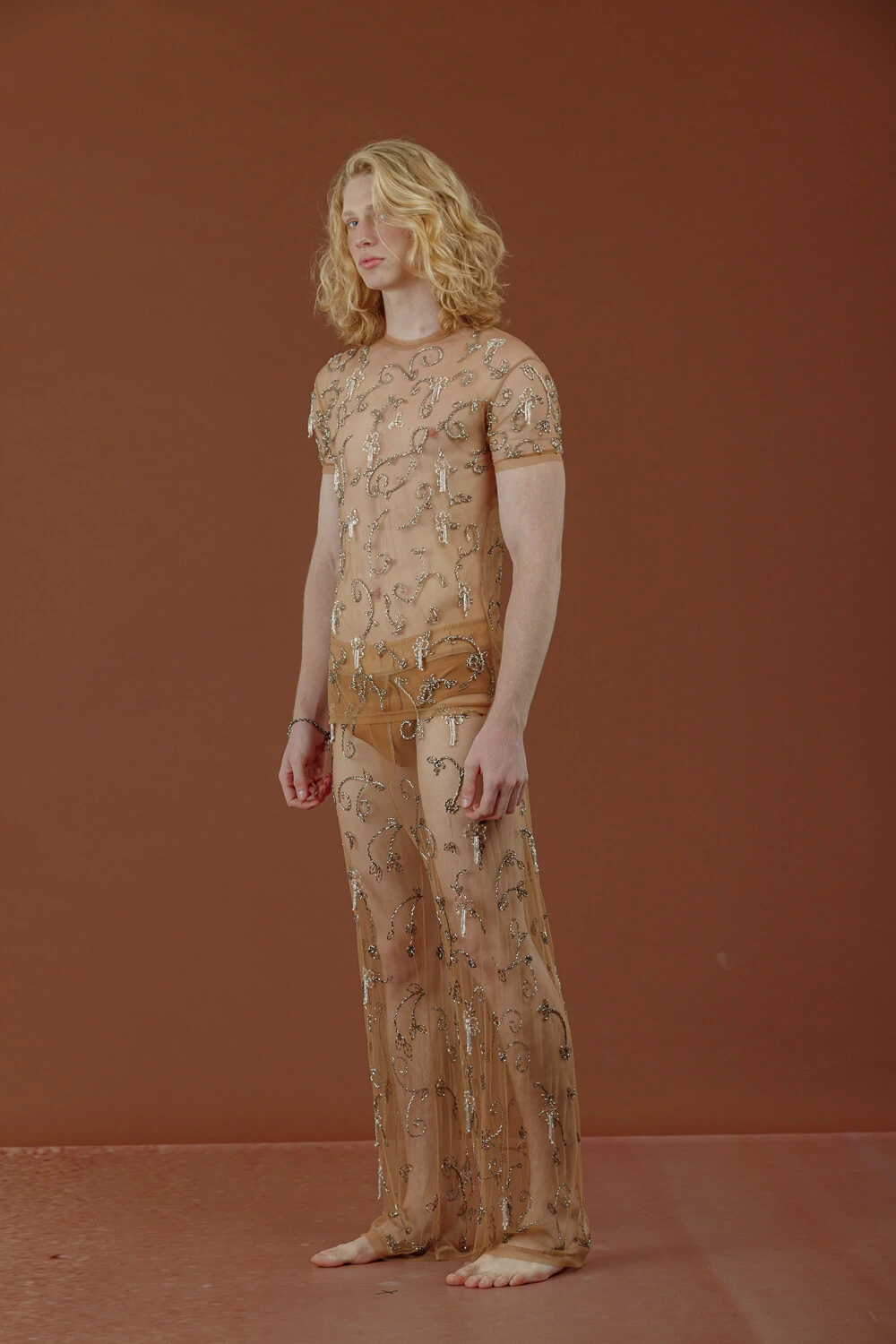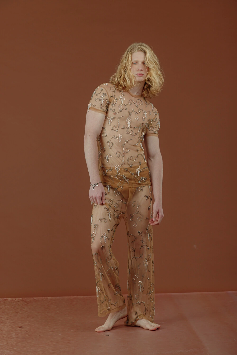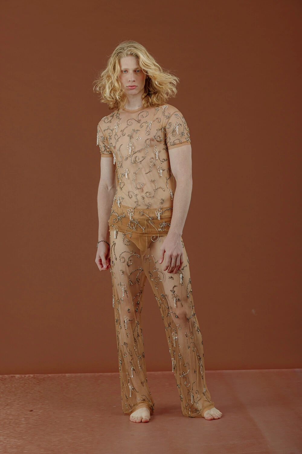 Calça estilo pantolna confeccionada em tule invisible bordada manualmente em cristais, vidrilhos, pérolas e paetês