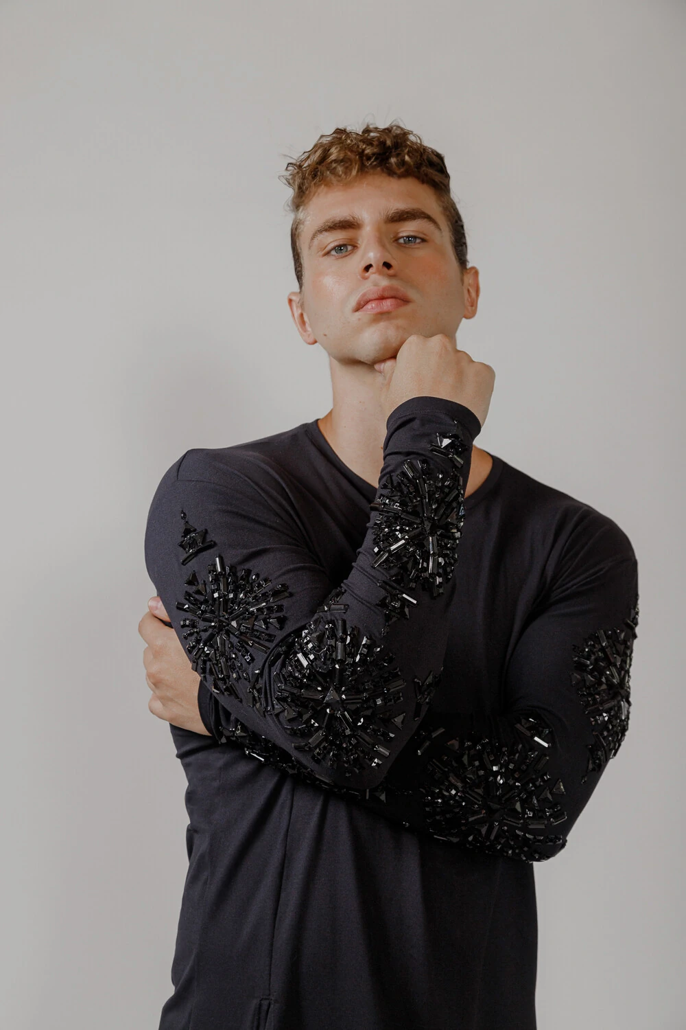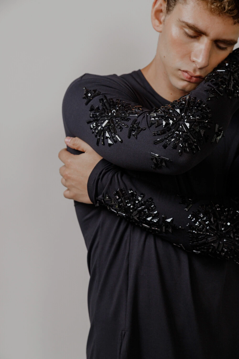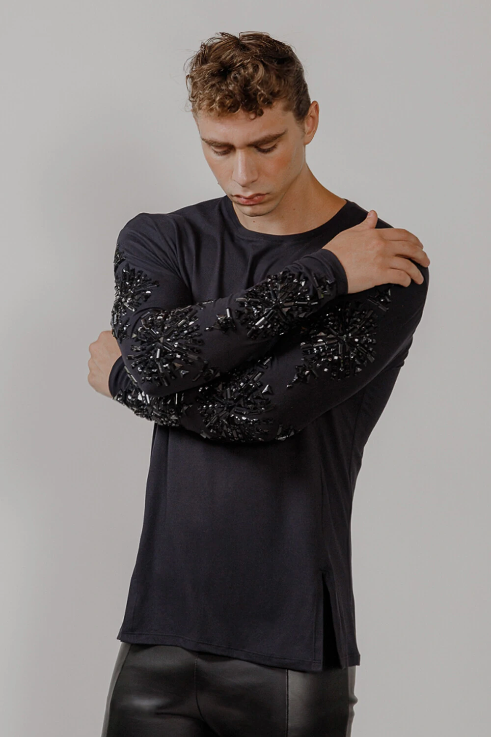 T-Shirt confeccionada em malha 100% Algodão penteado bordada manualmente em pedrarias pretas.