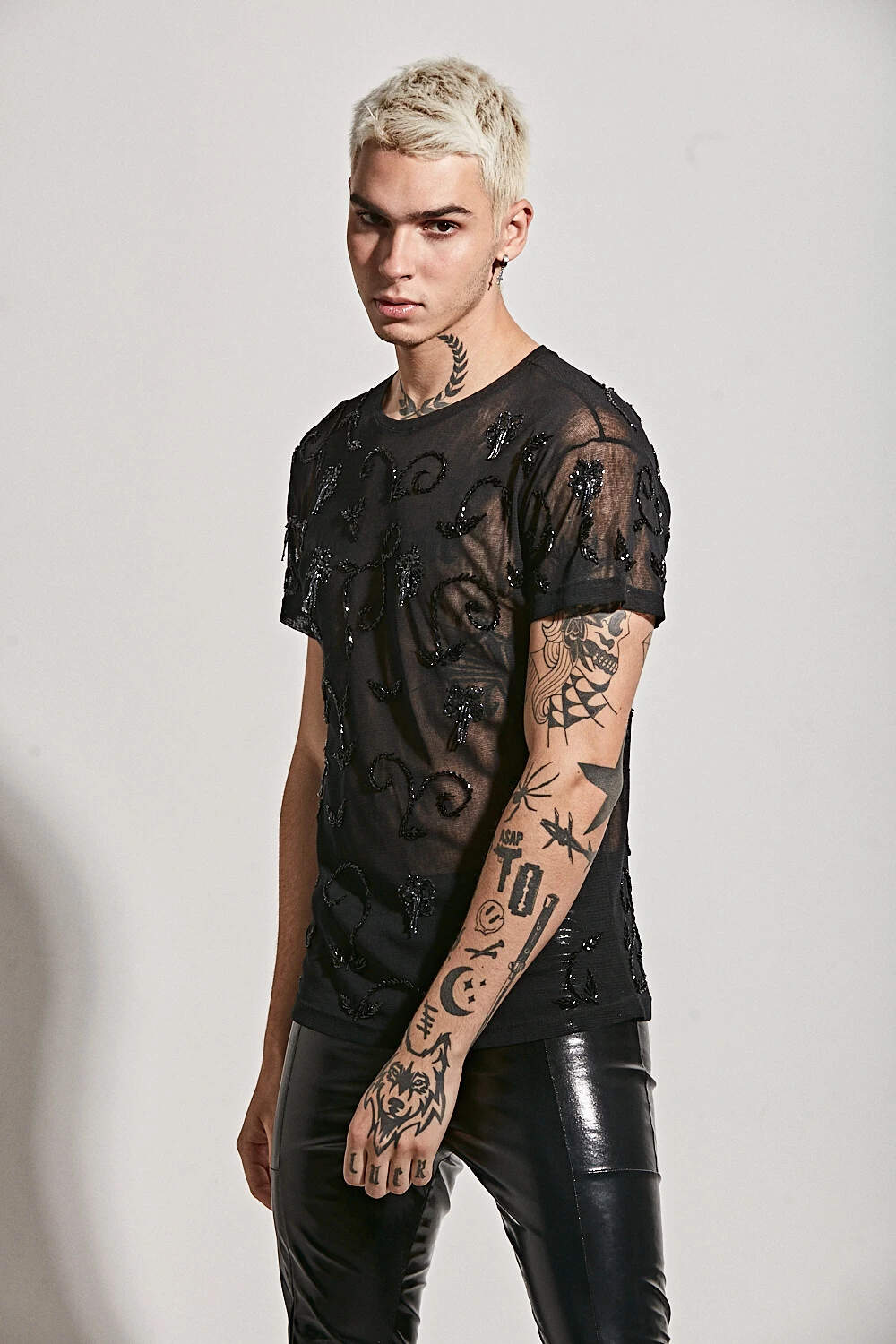 Camiseta confeccionada em tule de algodão bordada manualmente em tema de arabescos e flores em vidrilhos, canutilhos, paêtes e franjas de vidrilho.