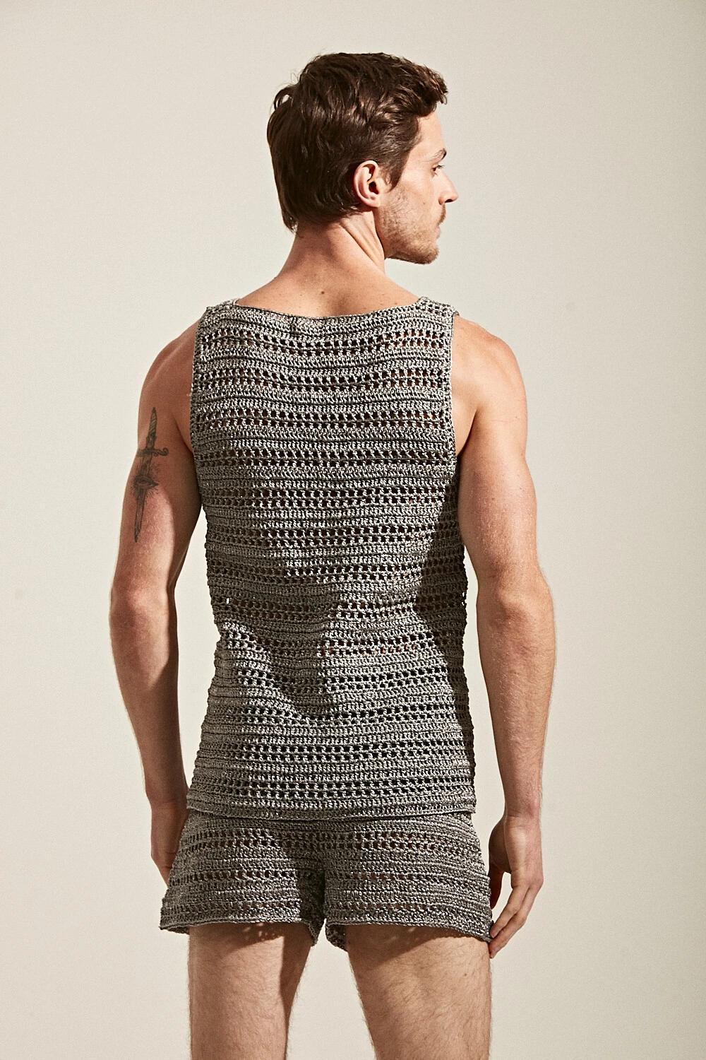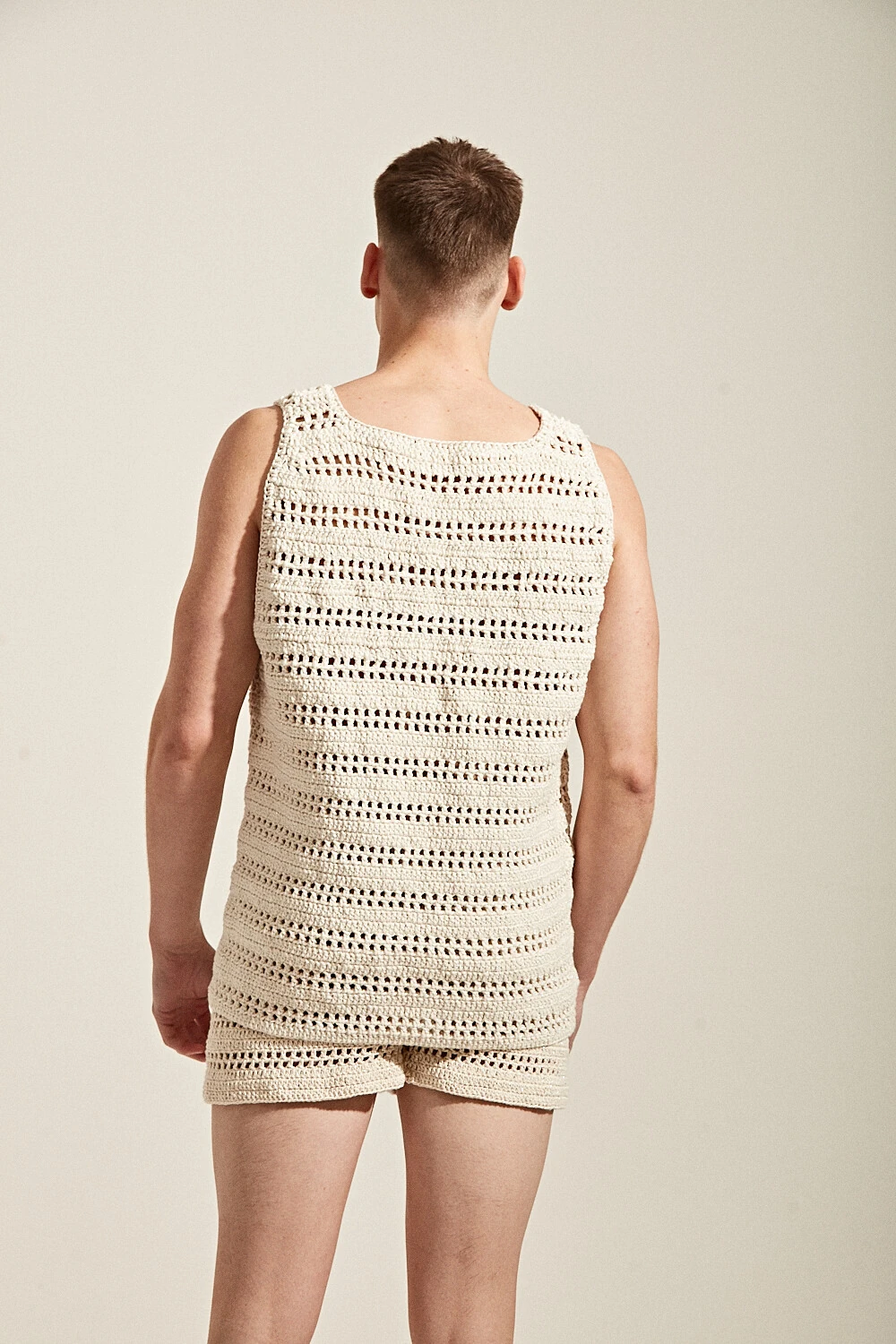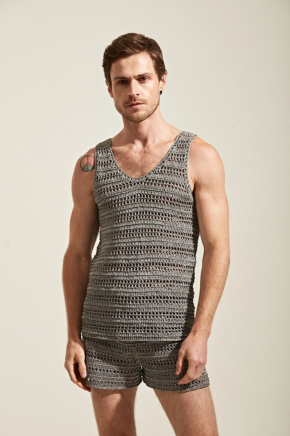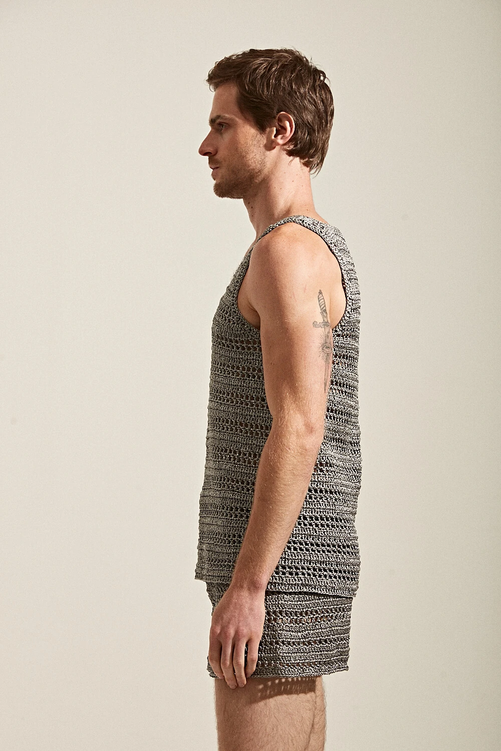 Regata confeccionada em crochê manual com fios de algodão e lurex.