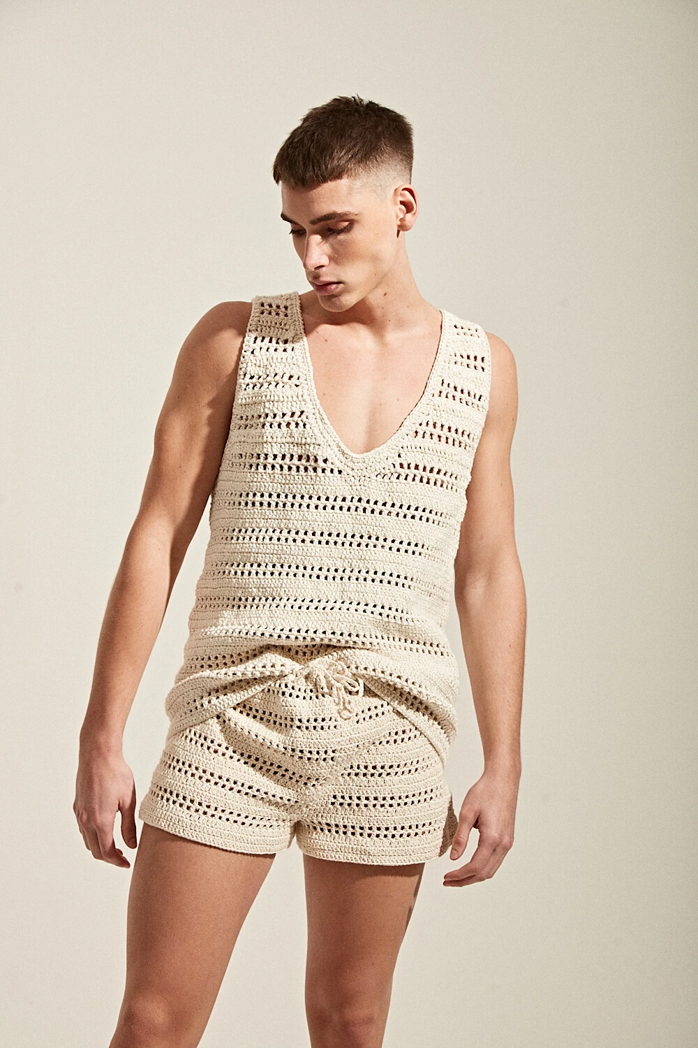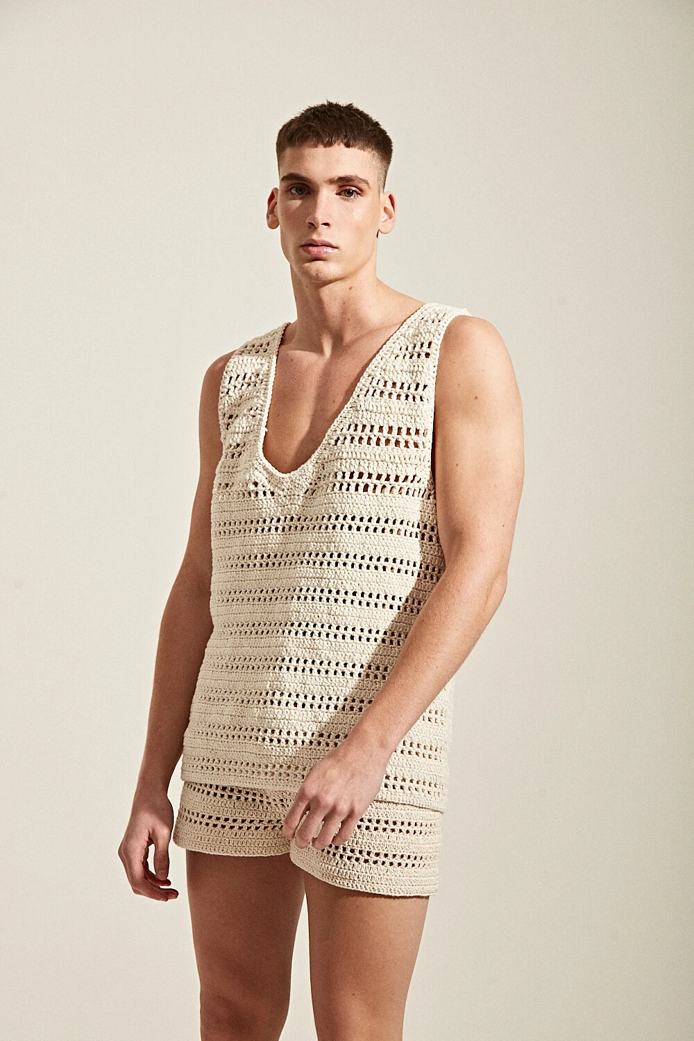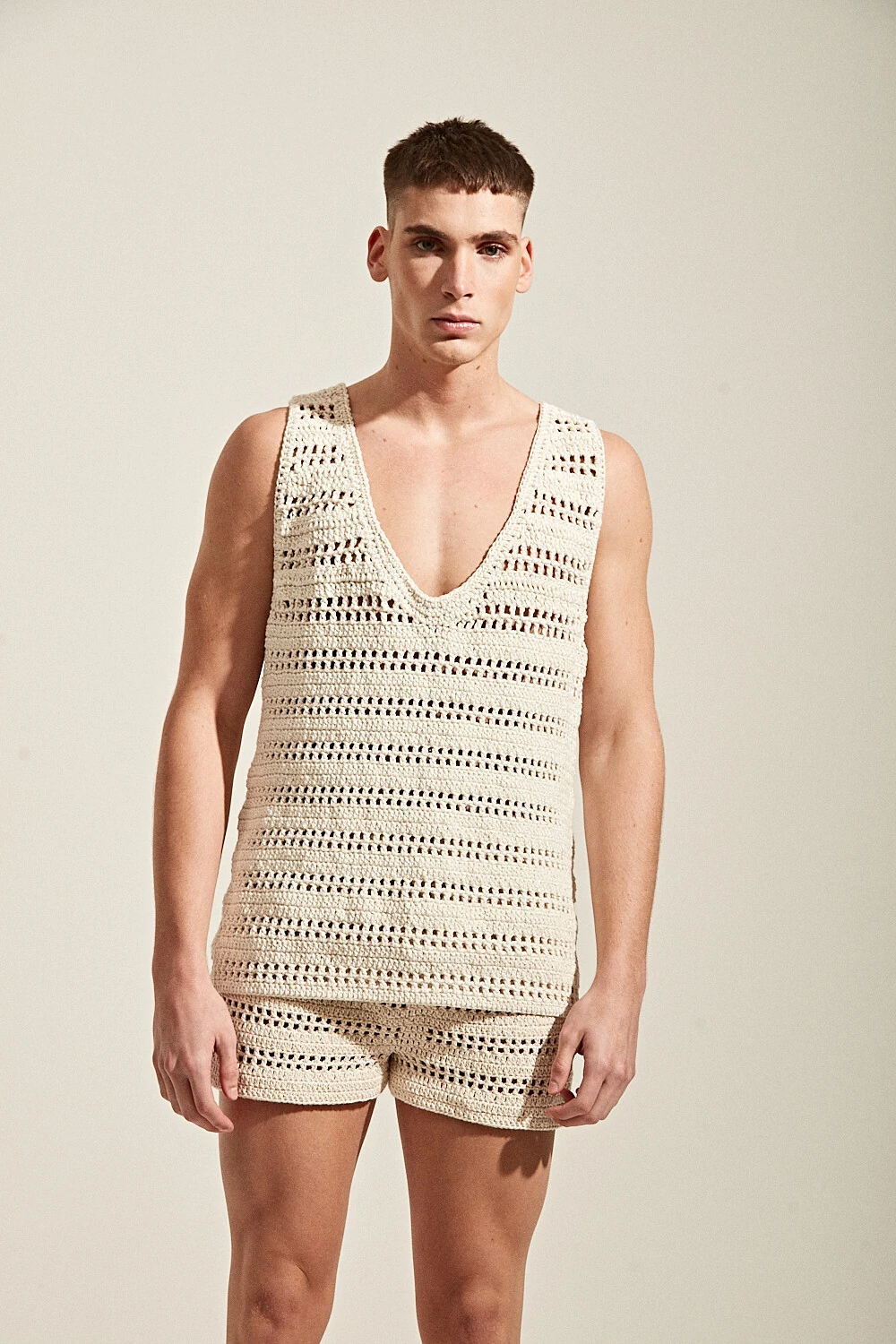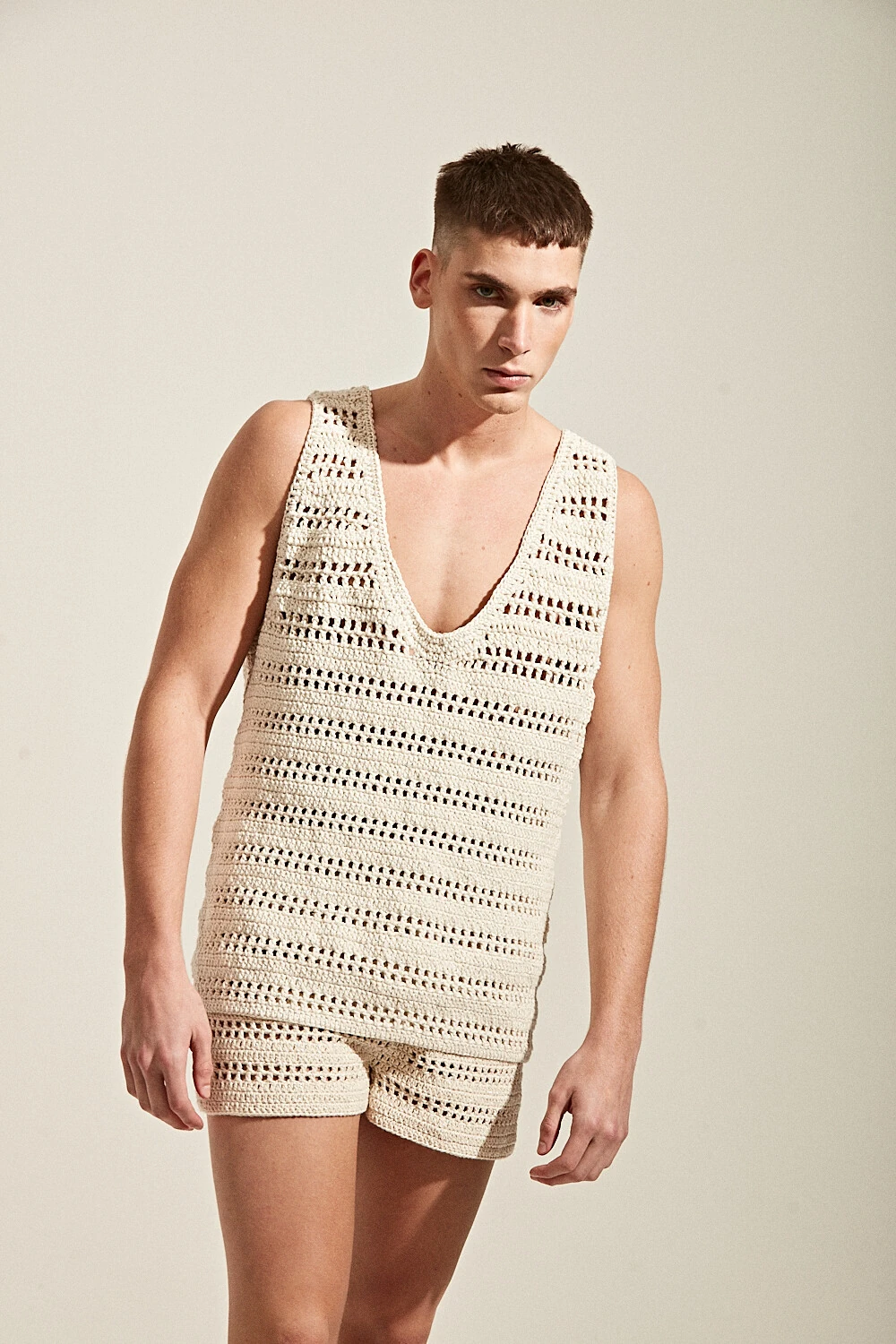Regata confeccionada em crochê manual com fios de algodão e lurex.