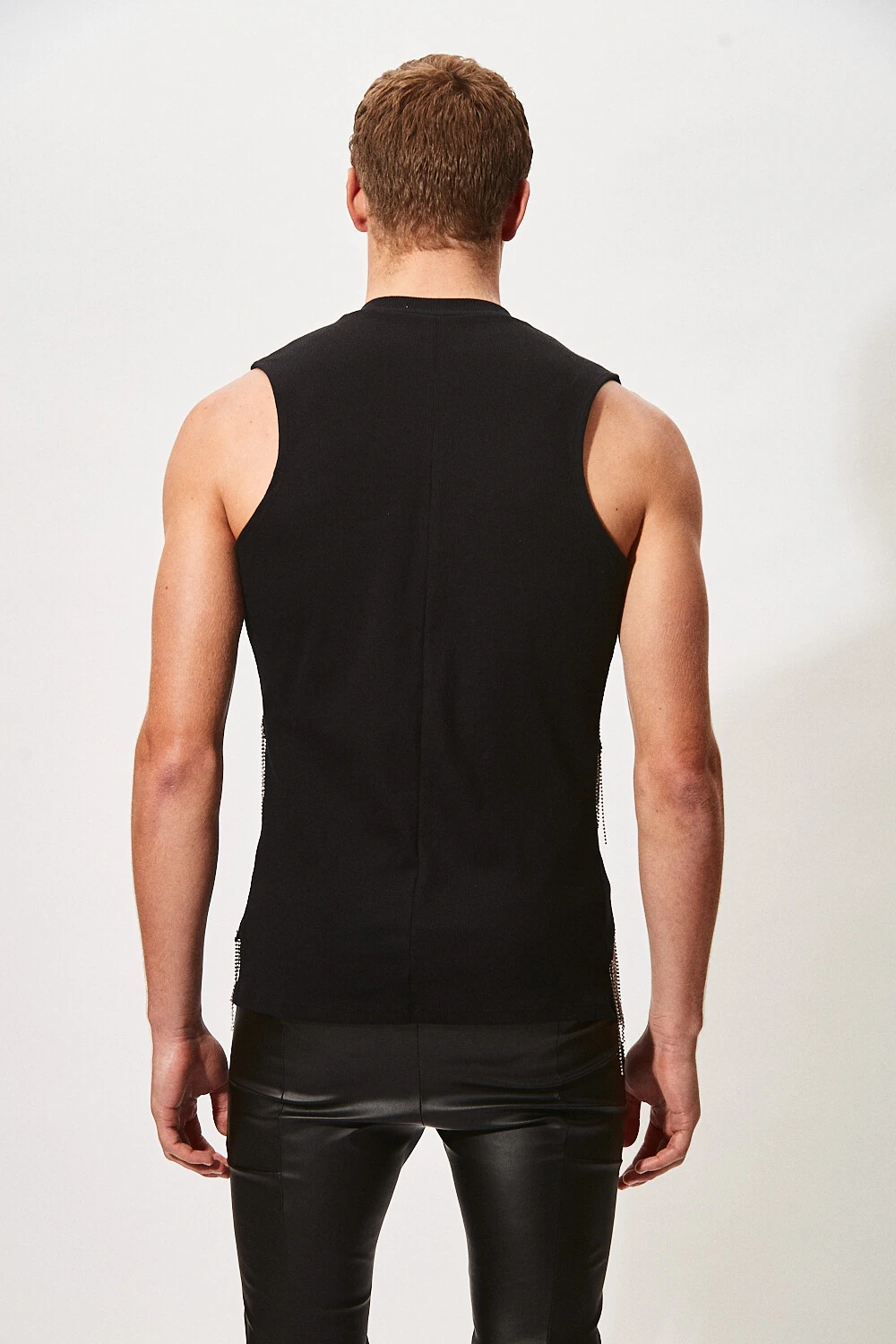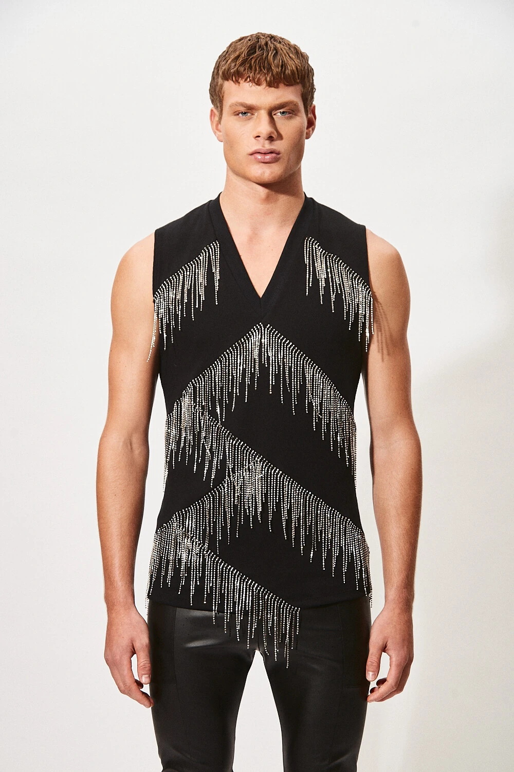 Confeccionada em ribana de algodão, possui recortes transversais com aplicação de franjas em strass.