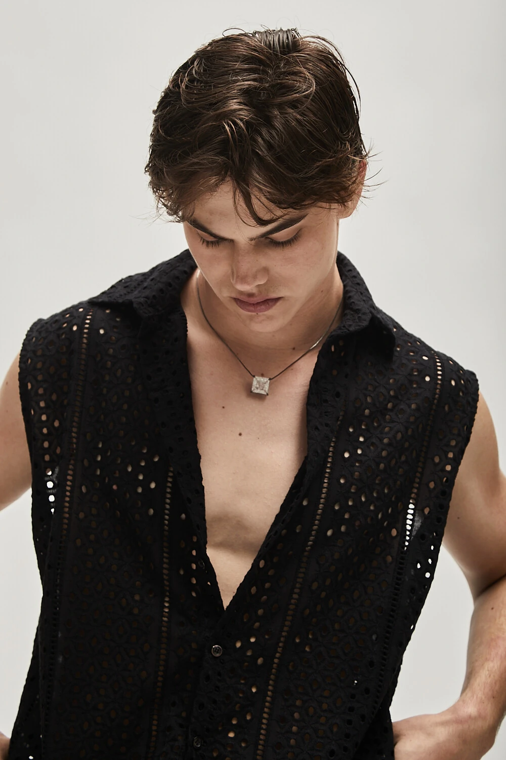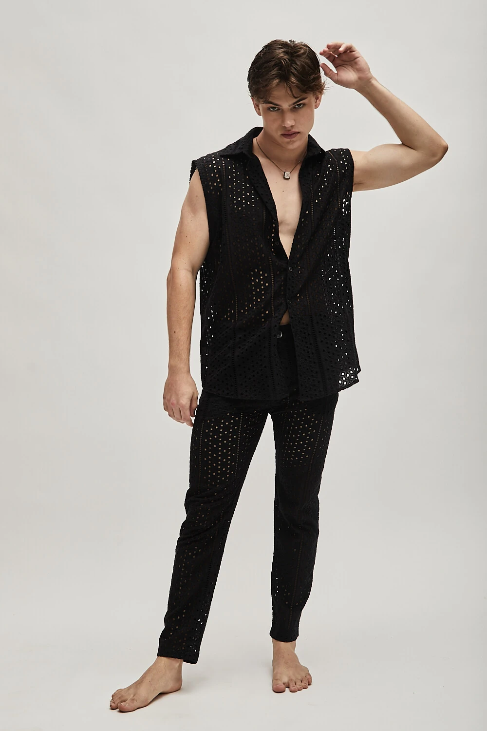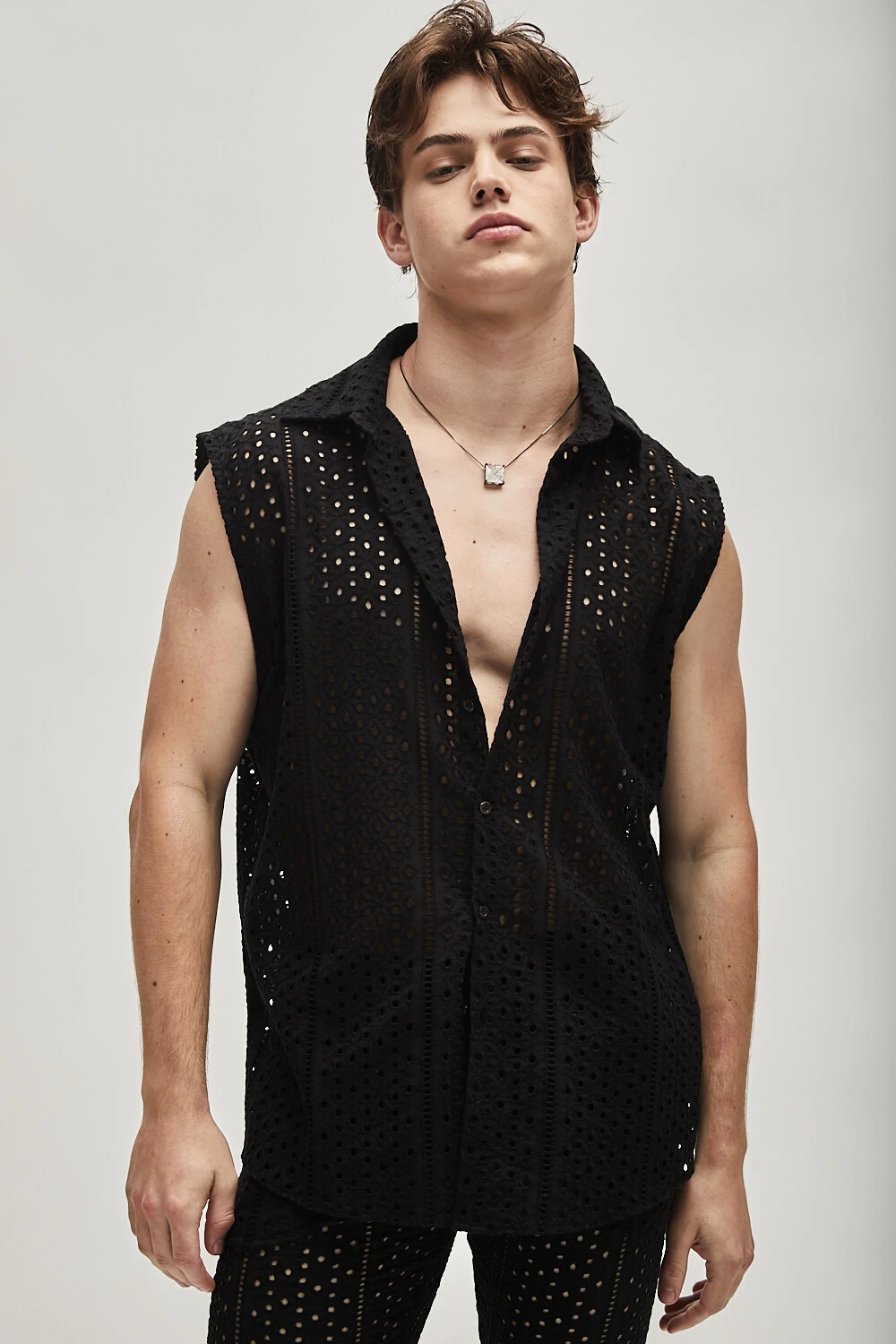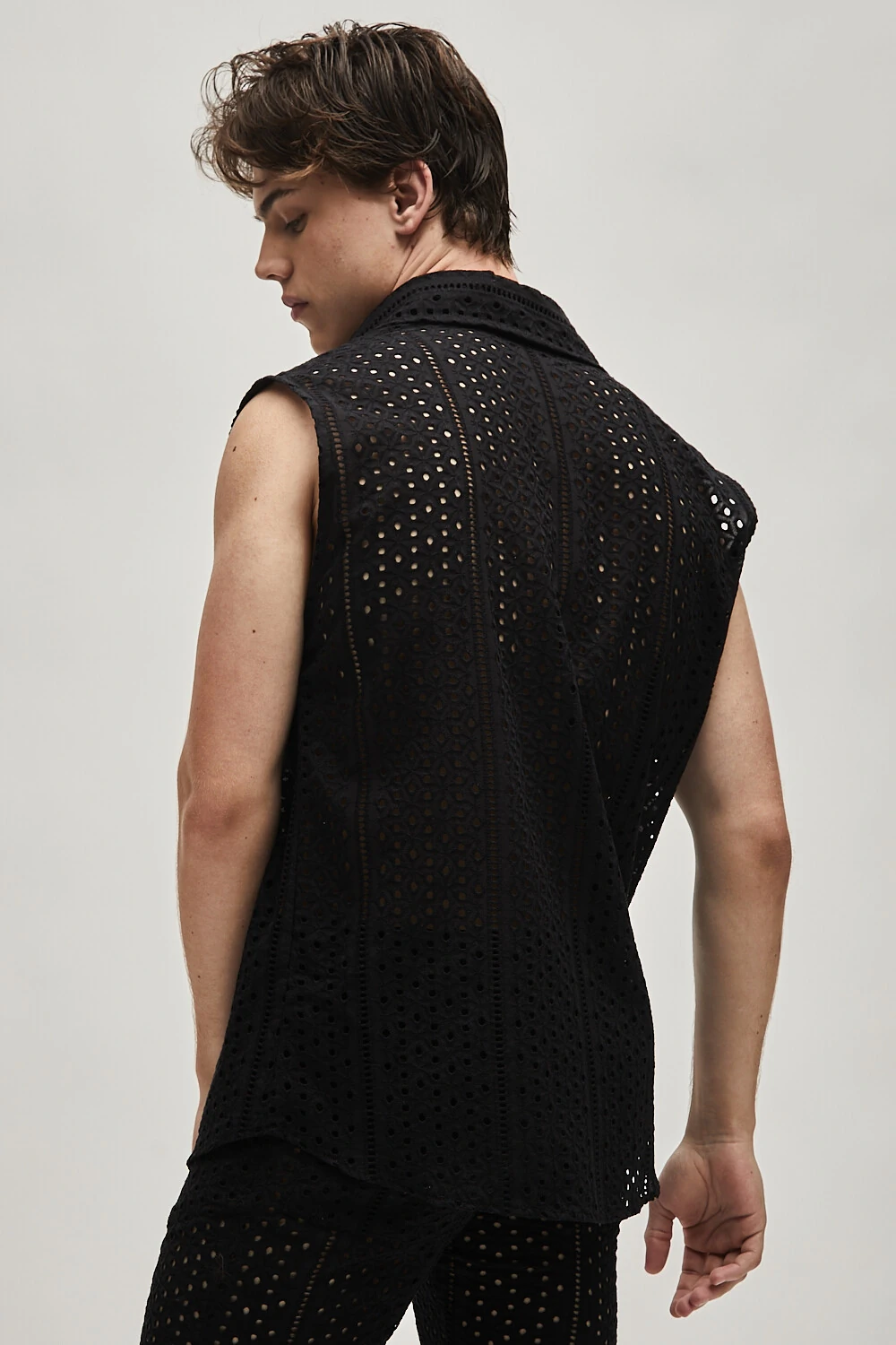Uma camisa elegante e sem mangas, confeccionada em laise preto, destaca-se pelos botões de madre pérola que acrescentam um toque sofisticado ao design. Essa peça é perfeita para criar looks versáteis e elegantes para diversas ocasiões, proporcionando conforto e estilo. A renda laise adiciona um toque de textura sutil, tornando-a uma escolha ideal para quem busca uma camisa sofisticada e atemporal.
