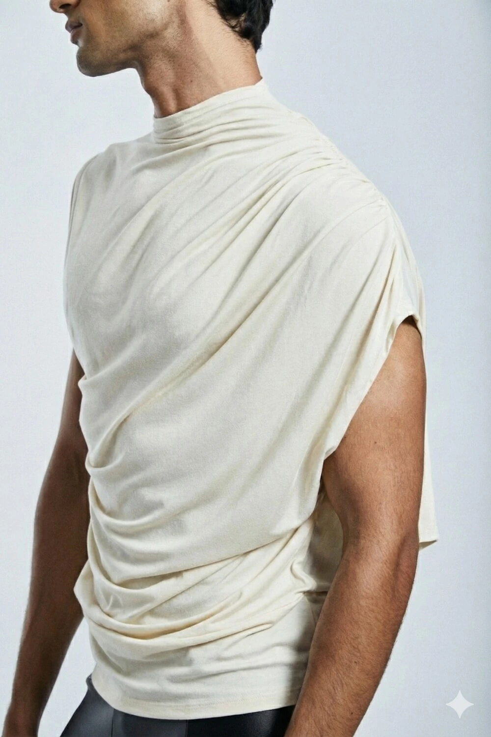 A Regata Kýma é a peça básica não tão básica que traduz a essência da Synchron: ousadia com sofisticação. Com franzidos assimétricos e modelagem justa ao corpo, ela valoriza a silhueta masculina de forma sutil e sensual. Ideal para quem busca impacto no minimalismo.