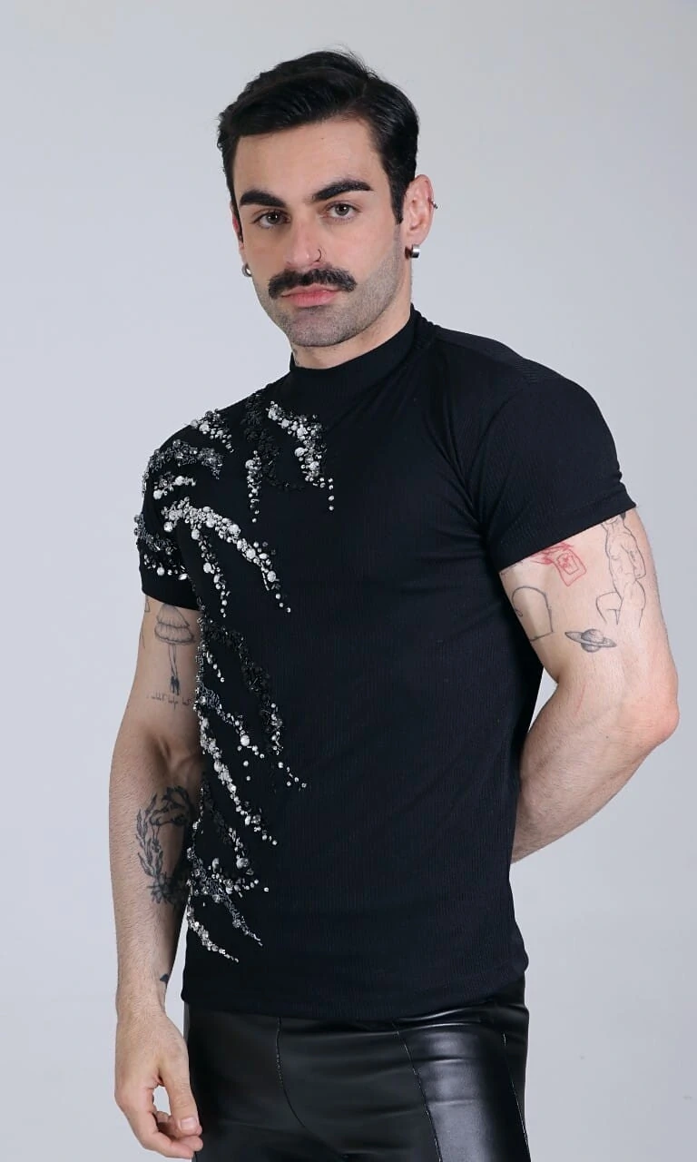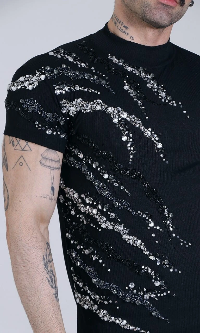 Camiseta gola alta, canelada em mistura de poliéster e viscose, com manga curta, preta, com bordado lateral que remete a estampa de tigre em tons de preto, prata e grafite. Uma peça ousada e elegante, perfeita para destacar detalhes sofisticados em looks noturnos.