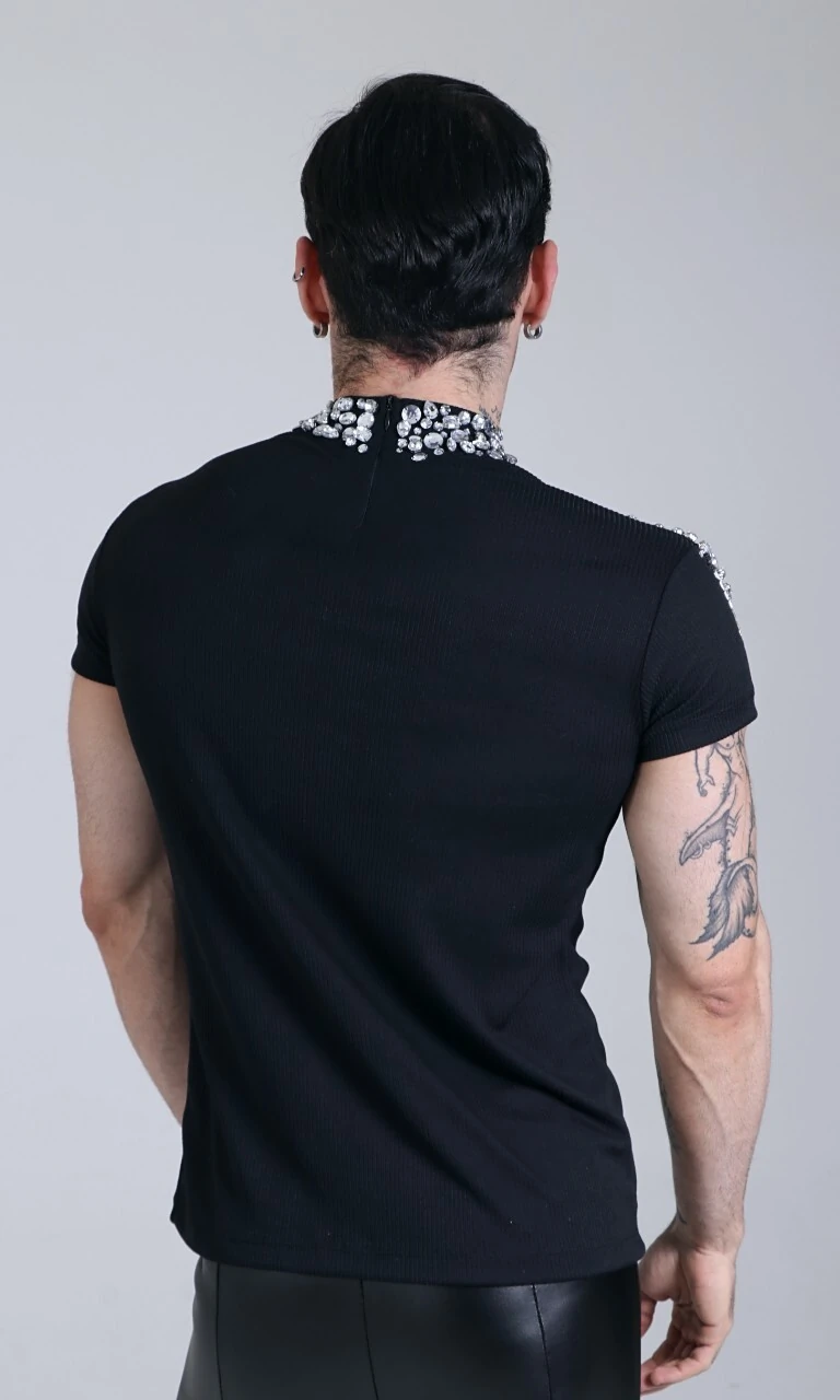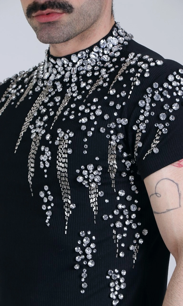 Camiseta gola alta, canelada, com modelagem slim, toda bordada em cristais e chuvas de vidrilhos. Exclusiva e feita sob encomenda, confeccionada em mistura de viscose com poliéster, com mangas curtas. Uma peça sofisticada, perfeita para quem busca brilho e elegância em todos os detalhes.