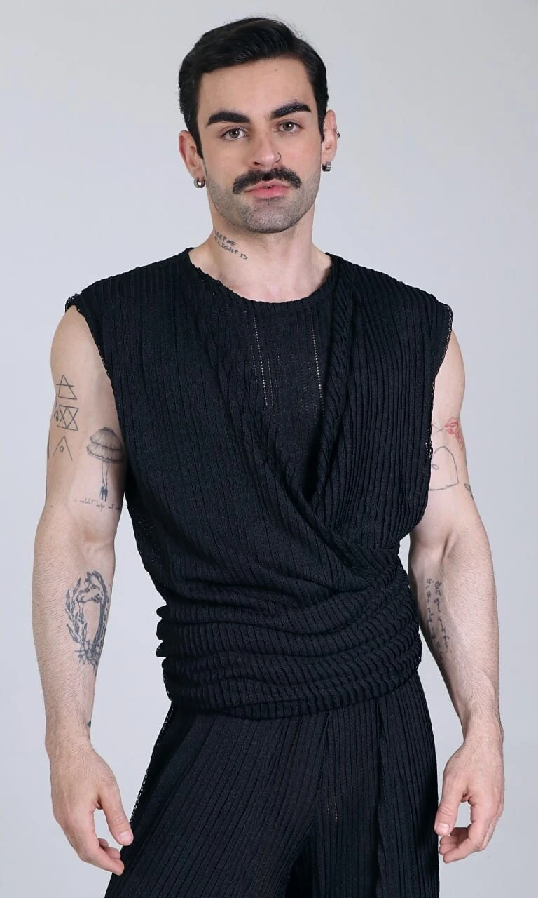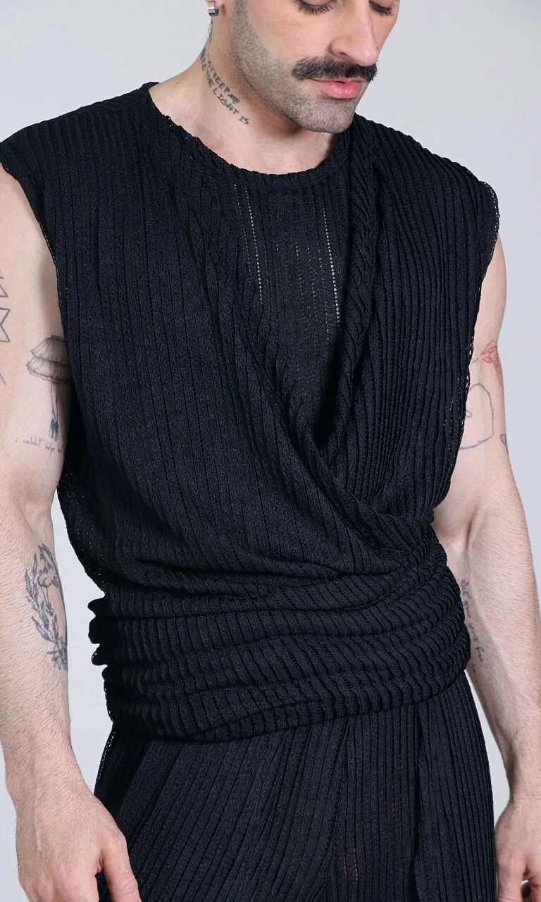 Regata confeccionada em renda delicada com mini plissados, apresentando decote degagé transpassado em V. Uma peça sofisticada e etérea, inspirada na moda grega clássica, perfeita para looks elegantes, mas também para combinações modernas e contemporâneas.