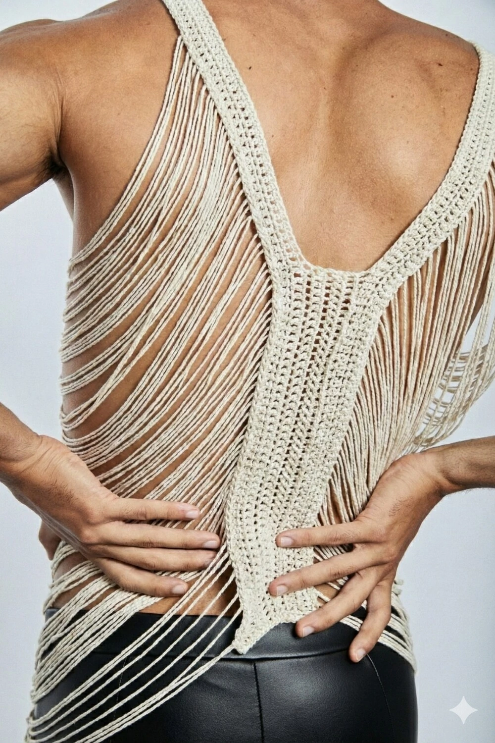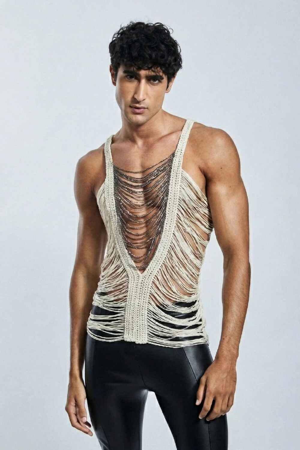 O destaque da peça está no seu decote profundo adornado com correntes metálicas aplicadas manualmente, um detalhe que adiciona um brilho sutil e uma estética ousada ao visual. O jogo de texturas entre o crochê, os fios alongados e as correntes cria um efeito dinâmico, transformando a regata em um statement de moda para homens que apreciam exclusividade e design inovador.
